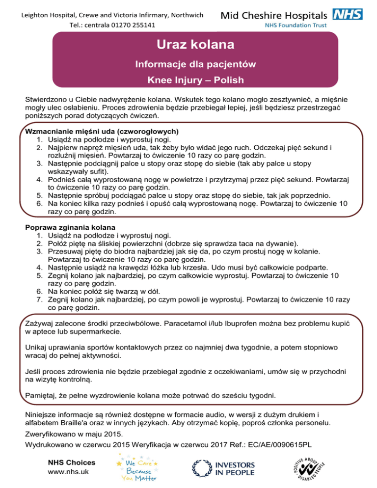 Leighton Hospital, Crewe and Victoria Infirmary, Northwich Tel.: centrala 01270 255141 Uraz kolana Informacje dla pacjentów Knee Injury – Polish Stwierdzono u Ciebie nadwyrężenie kolana. Wskutek tego kolano mogło zesztywnieć, a mięśnie mogły ulec osłabieniu. Proces zdrowienia będzie przebiegał lepiej, jeśli będziesz przestrzegać poniższych porad dotyczących ćwiczeń. Wzmacnianie mięśni uda (czworogłowych) 1. Usiądź na podłodze i wyprostuj nogi. 2. Najpierw napręż mięsień uda, tak żeby było widać jego ruch. Odczekaj pięć sekund i rozluźnij mięsień. Powtarzaj to ćwiczenie 10 razy co parę godzin. 3. Następnie podciągnij palce u stopy oraz stopę do siebie (tak aby palce u stopy wskazywały sufit). 4. Podnieś całą wyprostowaną nogę w powietrze i przytrzymaj przez pięć sekund. Powtarzaj to ćwiczenie 10 razy co parę godzin. 5. Następnie spróbuj podciągać palce u stopy oraz stopę do siebie, tak jak poprzednio. 6. Na koniec kilka razy podnieś i opuść całą wyprostowaną nogę. Powtarzaj to ćwiczenie 10 razy co parę godzin. Poprawa zginania kolana 1. Usiądź na podłodze i wyprostuj nogi. 2. Połóż piętę na śliskiej powierzchni (dobrze się sprawdza taca na dywanie). 3. Przesuwaj piętę do biodra najbardziej jak się da, po czym prostuj nogę w kolanie. Powtarzaj to ćwiczenie 10 razy co parę godzin. 4. Następnie usiądź na krawędzi łóżka lub krzesła. Udo musi być całkowicie podparte. 5. Zegnij kolano jak najbardziej, po czym całkowicie wyprostuj. Powtarzaj to ćwiczenie 10 razy co parę godzin. 6. Na koniec połóż się twarzą w dół. 7. Zegnij kolano jak najbardziej, po czym powoli je wyprostuj. Powtarzaj to ćwiczenie 10 razy co parę godzin. Zażywaj zalecone środki przeciwbólowe. Paracetamol i/lub Ibuprofen można bez problemu kupić w aptece lub supermarkecie. Unikaj uprawiania sportów kontaktowych przez co najmniej dwa tygodnie, a potem stopniowo wracaj do pełnej aktywności. Jeśli proces zdrowienia nie będzie przebiegał zgodnie z oczekiwaniami, umów się w przychodni na wizytę kontrolną. Pamiętaj, że pełne wyzdrowienie kolana może potrwać do sześciu tygodni. Sunderland Royal Hospital Niniejsze informacje są również dostępne w formacie audio, w wersji z dużym drukiem i alfabetem Braille'a oraz w innych językach. Aby otrzymać kopię, poproś członka personelu. Zweryfikowano w maju 2015. Wydrukowano w czerwcu 2015 Weryfikacja w czerwcu 2017 Ref.: EC/AE/0090615PL NHS Choices www.nhs.uk