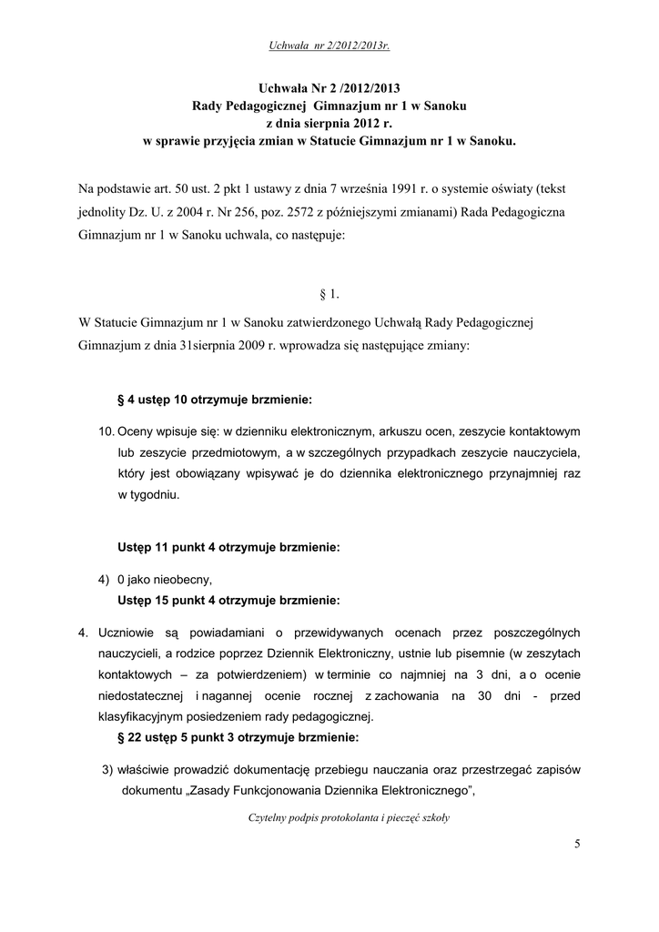 Uchwała nr 2/2012/2013r. Uchwała Nr 2 /2012/2013 Rady Pedagogicznej Gimnazjum nr 1 w Sanoku z dnia sierpnia 2012 r. w sprawie przyjęcia zmian w Statucie Gimnazjum nr 1 w Sanoku. Na podstawie art. 50 ust. 2 pkt 1 ustawy z dnia 7 września 1991 r. o systemie oświaty (tekst jednolity Dz. U. z 2004 r. Nr 256, poz. 2572 z późniejszymi zmianami) Rada Pedagogiczna Gimnazjum nr 1 w Sanoku uchwala, co następuje: § 1. W Statucie Gimnazjum nr 1 w Sanoku zatwierdzonego Uchwałą Rady Pedagogicznej Gimnazjum z dnia 31sierpnia 2009 r. wprowadza się następujące zmiany: § 4 ustęp 10 otrzymuje brzmienie: 10. Oceny wpisuje się: w dzienniku elektronicznym, arkuszu ocen, zeszycie kontaktowym lub zeszycie przedmiotowym, a w szczególnych przypadkach zeszycie nauczyciela, który jest obowiązany wpisywać je do dziennika elektronicznego przynajmniej raz w tygodniu. Ustęp 11 punkt 4 otrzymuje brzmienie: 4) 0 jako nieobecny, Ustęp 15 punkt 4 otrzymuje brzmienie: 4. Uczniowie są powiadamiani o przewidywanych ocenach przez poszczególnych nauczycieli, a rodzice poprzez Dziennik Elektroniczny, ustnie lub pisemnie (w zeszytach kontaktowych – za potwierdzeniem) w terminie co najmniej na 3 dni, a o ocenie niedostatecznej i nagannej ocenie rocznej z zachowania na 30 dni - przed klasyfikacyjnym posiedzeniem rady pedagogicznej. § 22 ustęp 5 punkt 3 otrzymuje brzmienie: 3) właściwie prowadzić dokumentację przebiegu nauczania oraz przestrzegać zapisów dokumentu „Zasady Funkcjonowania Dziennika Elektronicznego”, Czytelny podpis protokolanta i pieczęć szkoły 5 Uchwała nr 2/2012/2013r. § 27 ustęp 9 otrzymuje brzmienie: 9. przestrzegać bezwzględnego zakazu uŜywania e-papierosów w czasie wszystkich zajęć organizowanych przez szkołę, a innych urządzeń (telefonów komórkowych, walkmanów, w trakcie osobistych zajęć odtwarzaczy, edukacyjnych; szkoła gier nie bierze elektronicznych) odpowiedzialności za zniszczenie, zagubienie lub kradzieŜ tego typu i innych wartościowych przedmiotów, § 29 ustęp 3 punkt 9 otrzymuje brzmienie: 1) Nadanie tytułu „Absolwenta Roku” § 30 ustęp 1 punkt 3 otrzymuje brzmienie: 3) palenie papierosów, e-papierosów, picie alkoholu, uŜywanie środków odurzających § 2. Wykonanie uchwały powierza się Dyrektorowi Gimnazjum nr 1 w Sanoku . Uchwała wchodzi w Ŝycie z dniem 1 września 2013 r. Przewodniczący Rady Pedagogicznej: ............................................... ( podpis + pieczęć) Uchwała została przyjęta ilością głosów: 1. 2. 3. 4. 5. Za: 40 Przeciw: 0 Wstrzymało się: 0 Członków Rady Pedagogicznej ogółem: 46 Obecnych: 40 Czytelny podpis protokolanta i pieczęć szkoły 5