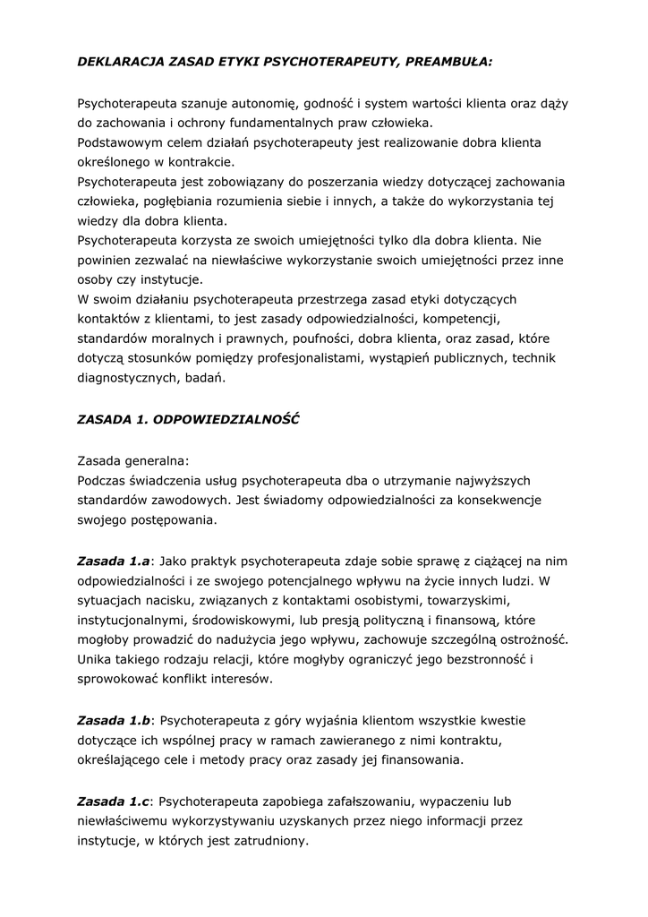 DEKLARACJA ZASAD ETYKI PSYCHOTERAPEUTY, PREAMBUŁA: Psychoterapeuta szanuje autonomię, godność i system wartości klienta oraz dąży do zachowania i ochrony fundamentalnych praw człowieka. Podstawowym celem działań psychoterapeuty jest realizowanie dobra klienta określonego w kontrakcie. Psychoterapeuta jest zobowiązany do poszerzania wiedzy dotyczącej zachowania człowieka, pogłębiania rozumienia siebie i innych, a także do wykorzystania tej wiedzy dla dobra klienta. Psychoterapeuta korzysta ze swoich umiejętności tylko dla dobra klienta. Nie powinien zezwalać na niewłaściwe wykorzystanie swoich umiejętności przez inne osoby czy instytucje. W swoim działaniu psychoterapeuta przestrzega zasad etyki dotyczących kontaktów z klientami, to jest zasady odpowiedzialności, kompetencji, standardów moralnych i prawnych, poufności, dobra klienta, oraz zasad, które dotyczą stosunków pomiędzy profesjonalistami, wystąpień publicznych, technik diagnostycznych, badań. ZASADA 1. ODPOWIEDZIALNOŚĆ Zasada generalna: Podczas świadczenia usług psychoterapeuta dba o utrzymanie najwyższych standardów zawodowych. Jest świadomy odpowiedzialności za konsekwencje swojego postępowania. Zasada 1.a: Jako praktyk psychoterapeuta zdaje sobie sprawę z ciążącej na nim odpowiedzialności i ze swojego potencjalnego wpływu na życie innych ludzi. W sytuacjach nacisku, związanych z kontaktami osobistymi, towarzyskimi, instytucjonalnymi, środowiskowymi, lub presją polityczną i finansową, które mogłoby prowadzić do nadużycia jego wpływu, zachowuje szczególną ostrożność. Unika takiego rodzaju relacji, które mogłyby ograniczyć jego bezstronność i sprowokować konflikt interesów. Zasada 1.b: Psychoterapeuta z góry wyjaśnia klientom wszystkie kwestie dotyczące ich wspólnej pracy w ramach zawieranego z nimi kontraktu, określającego cele i metody pracy oraz zasady jej finansowania. Zasada 1.c: Psychoterapeuta zapobiega zafałszowaniu, wypaczeniu lub niewłaściwemu wykorzystywaniu uzyskanych przez niego informacji przez instytucje, w których jest zatrudniony. Zasada 1.d: Jako członek organizacji zawodowych i stowarzyszeń psychoterapeuta przestrzega standardów zawodowych i etycznych sformułowanych przez te organizacje i stowarzyszenia. Zasada 1.e: Jako badacz psychoterapeuta w odpowiedzialny sposób podchodzi do wyboru tematu badań, wykorzystywanych podczas ich prowadzenia metod, sposobów analizy i przedstawienia wyników. Prowadząc badania uwzględnia zasadę dobra uczestniczących w nich osób. Kodeks zasad etycznych ZASADA 2: KOMPETENCJA Zasada generalna: Psychoterapeuta jest zobowiązany do utrzymywania wysokich standardów w zakresie kompetencji zawodowych. Uznaje granice własnych umiejętności i ograniczenia stosowanych metod. Świadczy jedynie te usługi i używa tych technik, które sa zgodne z jego kwalifikacjami, wynikają z odbytego szkolenia i doświadczenia. W dziedzinach, w których nie istnieją jeszcze jasno określone standardy, psychoterapeuta przestrzega koniecznych środków ostrożności, kierując się dobrem swoich klientów. Psychoterapeuta stale uzupełnia swoją wiedzę, szczególnie związaną z wykonywanymi usługami. Zasada 2.a: Psychoterapeuta uznaje, iż kwalifikacje pozwalające na stosowanie psychoterapii muszą spełniać standardy opracowane przez Polską Radę Psychoterapii. Zasada 2.b: Psychoterapeuta jest zobowiązany do korzystania z superwizji, kontynuowania własnego szkolenia i troszczenia się o osobisty rozwój. Zasada 2.c Jako nauczyciel, trener, superwizor psychoterapeuta utrzymuje najwyższy poziom przekazywania wiedzy zawodowej. Zasada 2.d: Psychoterapeuta, uznając i szanując różnice wynikające z wieku, płci, pozycji socjoekonomicznej, orientacji seksualnej, pochodzenia etnicznego lub ograniczeń fizycznych i umysłowych, stosuje swoje postępowanie terapeutyczne tak, aby uwzględnić kontekst i potrzeby wynikające z tych różnic. Zasada 2.e: Psychoterapeuta ma świadomość, że osobiste problemy i konflikty mogą przeszkadzać w jego efektywnej pracy. W związku z tym powstrzymuje się od podejmowania jakiegokolwiek działania w tych sytuacjach, w których jego osobiste problemy prowadziłyby do nieadekwatnych zachowań bądź szkody. W momencie uświadomienia sobie osobistych problemów, szuka kompetentnego profesjonalnego wsparcia, aby określić, czy powinien zawiesić, zakończyć lub ograniczyć zakres działalności zawodowej. ZASADA 3: STANDARDY MORALNE I PRAWNE Zasada generalna: Moralne i etyczne standardy, których psychoterapeuta przestrzega w prywatnym życiu, nie są wyłącznie jego sprawą osobistą, ponieważ mogą wpływać na wypełnianie zawodowych obowiązków oraz umniejszać publiczne zaufanie do psychoterapii i psychoterapeutów. Standardy te winny być przedmiotem refleksji psychoterapeuty. Powinien on być wrażliwy na obowiązujące normy społeczne oraz na możliwy wpływ, jaki jego zachowanie może wywierać na innych psychoterapeutów oraz ich klientów, w przypadku gdy odbiega ono od przyjętych zasad. Psychoterapeuta obowiązany jest również być świadomym potencjalnego wpływu swoich zachowań na forum publicznym. Zasada 3.a: Jako profesjonalista psychoterapeuta zachowuje się zgodnie z zasadami i wytycznymi sformułowanymi przez statuty i kodeksy etyczne obowiązujące w danym zawodzie i w danym podejściu psychoterapeutycznym. Zasada 3.b: Jako pracownik i pracodawca psychoterapeuta nie angażuje się w żadne praktyki, które są niehumanitarne lub które prowadzą do zachowań nielegalnych, dyskryminacji ze względu na rasę, niepełnosprawność, wiek, płeć, orientację seksualną, religię lub pochodzenie. Zasada 3.c: W swoich rolach zawodowych psychoterapeuta unika wszelkich zachowań, które mogłyby umniejszyć lub naruszyć prawa człowieka, prawa obywatelskie i inne zagwarantowane ustawowo prawa klienta oraz innych osób, których to może dotyczyć