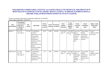 OGŁOSZENIE O PRZETARGU USTNYM, NA NAJEM LOKALI UŻYTKOWYCH POŁOŻONYCH W BUDYNKACH STANOWIĄCYCH WŁASNOŚĆ MIASTA LESZNA, W IMIENIU KTÓREGO DZIAŁA MIEJSKI ZAKŁAD BUDYNKÓW KOMUNALNYCH W LESZNIE Termin wywieszenia ogłoszenia do wiadomości publicznej: 23.04.2010 r. Termin zdjęcia ogłoszenia: 14.05.2010 r. Nieruchomość z oznaczeniem Adres księgi wiecz., nieruchomości nr działki, nr ark. mapy Bracka 13 Dz. Nr 78 Ark. mapy 13 Narutowicza 8 Kw. 440 Dz. Nr 58 Ark. mapy 78 Pow. lokalu Opis lokalu 63,12m² W skład lokalu wchodzą: 7 pomieszczeń w tym sala sprzedaży, magazyny, w-c. Wyposażenie: instalacja wod-kan, elektryczna. Ogrzewanie gazowe etażowe. Wejście do lokalu z ulicy Brackiej 29,70m² W skład lokalu wchodzą: 2 pomieszczenia, w-c. Wyposażenie: instalacja wod-kan, elektryczna. j Stawka Data i Kwota Przeznaczewywoławgodzina wadium nie lokalu cza netto przetargu Termin i godzina oględzin lokalu Termin wnoszenia opłat Zasady aktualizacji opłat Opłaty z tytułu użytkowania lokalu 26,23 6.200,- dowolne 14.05.2010 13.05.2010 Czynsz oraz godz.1100 godz.1400 do opłaty za 1430 media płatne do dnia 25 każdego miesiąca – z góry Czynsz najmu 1.Czynsz podlega 2. Opłata za media : waloryzacji w woda, ścieki okresach nie dłuższych niż 6 miesięcy 3,53 400,- dowolne 14.05.2010 13.05.2010 Czynsz oraz godz.1130 godz.1400 do opłaty za 1430 media płatne do dnia 25 każdego miesiąca – z góry Czynsz najmu 1.Czynsz podlega 2. Opłata za media : waloryzacji w woda, ścieki okresach nie dłuższych niż 6 m-cy. Zielona 14 Kw. 25130, 25131 Dz. Nr 99/2, 100/2 Ark. mapy 47 42,50m2 W skład lokalu wchodzą: 4 Pomieszczenia w tym w-c. Wyposażenie: instalacja wod-kan, elektryczna. Ogrzewanie gazowe etażowe. Wejście do lokalu z ulicy Zielonej 13,50 2.200,- dowolne 14.05.2010 13.05.2010 Czynsz oraz godz.1200 godz.1330 do opłaty za 1400 media płatne do dnia 25 każdego miesiąca – z góry Czynsz najmu 1.Czynsz podlega 2. Opłata za media : waloryzacji w woda, ścieki okresach nie dłuższych niż 6 m-cy. Zwycięzca przetargu zobowiązany będzie do zawarcia indywidualnych umów: 1. na dostawę energii elektrycznej , 2. na wywóz nieczystości stałych. Najemca lokalu użytkowego zobowiązany będzie również płacić podatek od nieruchomości. Powyższe ogłoszenie sporządzono zgodnie z art.35 ustawy o gospodarce nieruchomościami z dnia 21.08.1997 r. (z późniejszymi z mianami) Uwagi: