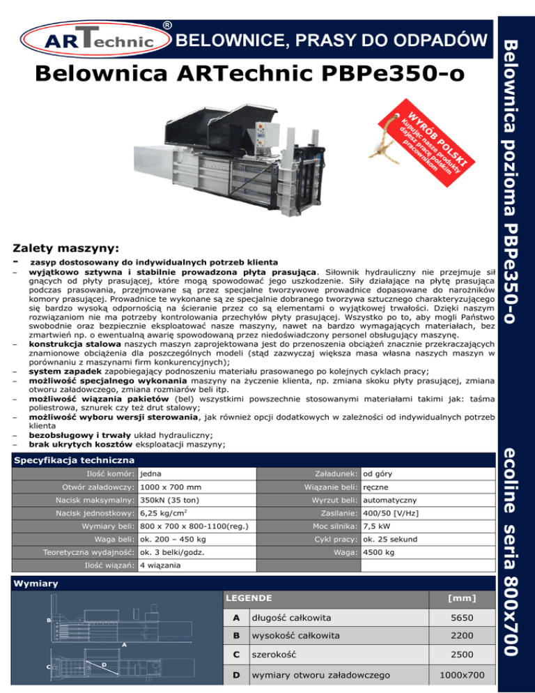 Zalety maszyny: - zasyp dostosowany do indywidualnych potrzeb klienta – – – – – – Specyfikacja techniczna Ilość komór: jedna Załadunek: od góry Otwór załadowczy: 1000 x 700 mm Wiązanie beli: ręczne Nacisk maksymalny: 350kN (35 ton) Wyrzut beli: automatyczny Nacisk jednostkowy: 6,25 kg/cm Zasilanie: 400/50 [V/Hz] 2 Wymiary beli: 800 x 700 x 800-1100(reg.) Moc silnika: 7,5 kW Waga beli: ok. 200 – 450 kg Cykl pracy: ok. 25 sekund Teoretyczna wydajność: ok. 3 belki/godz. Waga: 4500 kg Ilość wiązań: 4 wiązania Wymiary LEGENDE [mm] A długość całkowita 5650 B wysokość całkowita 2200 C szerokość 2500 D wymiary otworu załadowczego 1000x700 ecoline seria 800x700 – – wyjątkowo sztywna i stabilnie prowadzona płyta prasująca. Siłownik hydrauliczny nie przejmuje sił gnących od płyty prasującej, które mogą spowodować jego uszkodzenie. Siły działające na płytę prasująca podczas prasowania, przejmowane są przez specjalne tworzywowe prowadnice dopasowane do narożników komory prasującej. Prowadnice te wykonane są ze specjalnie dobranego tworzywa sztucznego charakteryzującego się bardzo wysoką odpornością na ścieranie przez co są elementami o wyjątkowej trwałości. Dzięki naszym rozwiązaniom nie ma potrzeby kontrolowania przechyłów płyty prasującej. Wszystko po to, aby mogli Państwo swobodnie oraz bezpiecznie eksploatować nasze maszyny, nawet na bardzo wymagających materiałach, bez zmartwień np. o ewentualną awarię spowodowaną przez niedoświadczony personel obsługujący maszynę. konstrukcja stalowa naszych maszyn zaprojektowana jest do przenoszenia obciążeń znacznie przekraczających znamionowe obciążenia dla poszczególnych modeli (stąd zazwyczaj większa masa własna naszych maszyn w porównaniu z maszynami firm konkurencyjnych); system zapadek zapobiegający podnoszeniu materiału prasowanego po kolejnych cyklach pracy; możliwość specjalnego wykonania maszyny na życzenie klienta, np. zmiana skoku płyty prasującej, zmiana otworu załadowczego, zmiana rozmiarów beli itp. możliwość wiązania pakietów (bel) wszystkimi powszechnie stosowanymi materiałami takimi jak: taśma poliestrowa, sznurek czy też drut stalowy; możliwość wyboru wersji sterowania, jak również opcji dodatkowych w zależności od indywidualnych potrzeb klienta bezobsługowy i trwały układ hydrauliczny; brak ukrytych kosztów eksploatacji maszyny; Belownica pozioma PBPe350-o Belownica ARTechnic PBPe350-o Sterowanie x (EXTRA) Cechy ● ● ● ● ● ● ● ● ● sterownik PLC automatyczne sterowanie cyklem pracy sygnalizacja zakończenia belki wyświetlacz ciekłokrystaliczny płynna regulacja maksymalnego nacisku z postępem 1 tona płynna regulacja wysokości beli z postępem 2 cm statystyki dzienne/tygodniowe/miesięczne - możliwość odczytania ilości wykonanych bel wraz z oszacowaniem wagi wybór programu prasowania dla różnego rodzaju surowców, w tym możliwość ustawienia czasu przytrzymania płyty prasującej w dolnej pozycji NOWOŚĆ !! możliwość podłączenia maszyny do programu statArtechnic Panel sterowania 1. Wyłącznik główny z możliwością blokady w pozycji „0”. (Uniemożliwienie uruchomienia maszyny przez osobę niepowołaną). 2. Kontrolka biała PAKIET sygnalizująca osiągnięcie maksymalnego napełnienia prasy; 3. Panel sterujący. 4. Kontrolka SIEĆ -zielona sygnalizująca podłączenie zasilania do belownicy i włączenie wyłącznika głównego; 5. Wyłącznik awaryjny STOP; 6. Przycisk START rozpoczynający proces prasowania; 7. Przyciski WYRZUT obsługi oburęcznej – sterowanie wyrzutnika beli; Belownica pozioma PBPe350-o Dostępne sterowania Galeria Adres ARTechnic ul. Gen. St. Maczka 9 43-300 Bielsko-Biała Oddział Poznań: ul. Św. Wincentego 10 61-003 Poznań Telefony E-mail i WWW tel. +48 (33) 816 01 69 fax: +48 (33) 443 20 46 INFOLINIA: 801 000 816 [email protected] www.artechnic.pl www.belowniceuzywane.pl ecoline seria 800x700 Kontakt