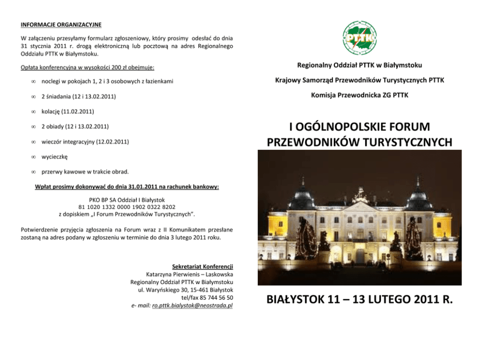 INFORMACJE ORGANIZACYJNE W załączeniu przesyłamy formularz zgłoszeniowy, który prosimy odesłać do dnia 31 stycznia 2011 r. drogą elektroniczną lub pocztową na adres Regionalnego Oddziału PTTK w Białymstoku. Opłata konferencyjna w wysokości 200 zł obejmuje: • noclegi w pokojach 1, 2 i 3 osobowych z łazienkami • 2 śniadania (12 i 13.02.2011) • kolację (11.02.2011) • 2 obiady (12 i 13.02.2011) • wieczór integracyjny (12.02.2011) • wycieczkę • przerwy kawowe w trakcie obrad. Regionalny Oddział PTTK w Białymstoku Krajowy Samorząd Przewodników Turystycznych PTTK Komisja Przewodnicka ZG PTTK I OGÓLNOPOLSKIE FORUM PRZEWODNIKÓW TURYSTYCZNYCH Wpłat prosimy dokonywać do dnia 31.01.2011 na rachunek bankowy: PKO BP SA Oddział I Białystok 81 1020 1332 0000 1902 0322 8202 z dopiskiem „I Forum Przewodników Turystycznych”. Potwierdzenie przyjęcia zgłoszenia na Forum wraz z II Komunikatem przesłane zostaną na adres podany w zgłoszeniu w terminie do dnia 3 lutego 2011 roku. Sekretariat Konferencji Katarzyna Pierwienis – Laskowska Regionalny Oddział PTTK w Białymstoku ul. Waryńskiego 30, 15-461 Białystok tel/fax 85 744 56 50 e- mail: [email protected] BIAŁYSTOK 11 – 13 LUTEGO 2011 R. MIEJSCE OBRAD Wydział Zarządzania Politechniki Białostockiej w Kleosinie ul. Ojca Tarasiuka 2. CEL KONFERENCJI I Ogólnopolskie Forum Przewodników Turystycznych to spotkanie branżowe mające na celu: • rozpoznanie i sformułowanie głównych problemów przewodnictwa turystycznego w Polsce, • nawiązanie współpracy pomiędzy organizacjami przewodnickimi reprezentującymi różne środowiska i prawne formy organizacyjne, • wypracowanie koncepcji funkcjonowania przewodnictwa w Polsce. Organizatorzy mają nadzieję, iż spotkanie stanie się przyczynkiem do cyklicznych spotkań środowiska przewodnickiego w kolejnych regionach kraju. PROGRAM 11.02.2011 r. (PIĄTEK) 10.00–13.00 Rejestracja uczestników Forum (Wydział Zarządzania Politechniki Białostockiej) 13.00–13.30 Uroczyste otwarcie I Forum Przewodników Turystycznych Powitanie gości, prezentacja celów konferencji, wystąpienia okolicznościowe zaproszonych Gości 13.30–18.00 I Sesja Plenarna 13.30 – 14.20 Polskie prawo turystyczne a prawo Unii Europejskiej 14.20 – 15.10 Aspekty prawne wykonywania zawodu przewodnika turystycznego w Unii Europejskiej 15.10 – 15.50 Przerwa kawowa 15.50 – 16.40 Przewodnik jako nauczyciel krajoznawstwa 16.40 – 17.30 Zadania Ministerstwa Sportu i Turystyki w kreowaniu przewodnictwa turystycznego w Polsce 17.30 – 18.20 Organizacje i stowarzyszenia przewodnickie w Polsce * po każdym wystąpieniu przewiduje się 15-minutową dyskusję 19.00 – 20.00 Kolacja w Centrum Konferencyjno – Bankietowym „Trzy Sosny” w Ignatkach 20.00 – 21.00 Prezentacja miejskich produktów turystycznych Białegostoku 12.02.2011 r. (SOBOTA) 7.30 – 8.30 Śniadanie 9.00 – 13.15 II Sesja Plenarna 9.00 – 9.50 9.50– 10.40 10.40 – 11.30 11.30 – 12.00 12.00 – 12.50 12.50 – 13.40 14.00 – 15.00 15.30 – 18.30 20.00 Marketing w usługach przewodnickich Przewodnik a niepełnosprawny turysta Przewodnictwo turystyczne na obszarach przyrodniczo chronionych Przerwa kawowa Nowoczesne metody prezentacji dziedzictwa kulturowego w przestrzeni miejskiej Wycieczka szkolna jako specyficzna forma pracy przewodnika turystycznego * po każdym wystąpieniu przewiduje się 15-minutową dyskusję Obiad Panele dyskusyjne Panel A - Szkolenie kadr przewodnickich Panel B - Prawne uwarunkowania wykonywania zawodu przewodnika turystycznego w Polsce Panel C - Przewodnik a przestrzeń turystyczna Uroczysta kolacja 13.02.2011 r. (NIEDZIELA) 7.30 – 8.30 Śniadanie 9.00 – 12.00 Wycieczka krajoznawcza do Supraśla (zwiedzanie Muzeum Ikon) lub wycieczka krajoznawcza po Białymstoku (zwiedzanie Muzeum Historycznego) 12.00 – 12.30 Przerwa kawowa 12.30 – 13.30 Prezentacja wniosków z dyskusji Podsumowanie I Forum Przewodników Turystycznych 14.00 – 15.00 Obiad