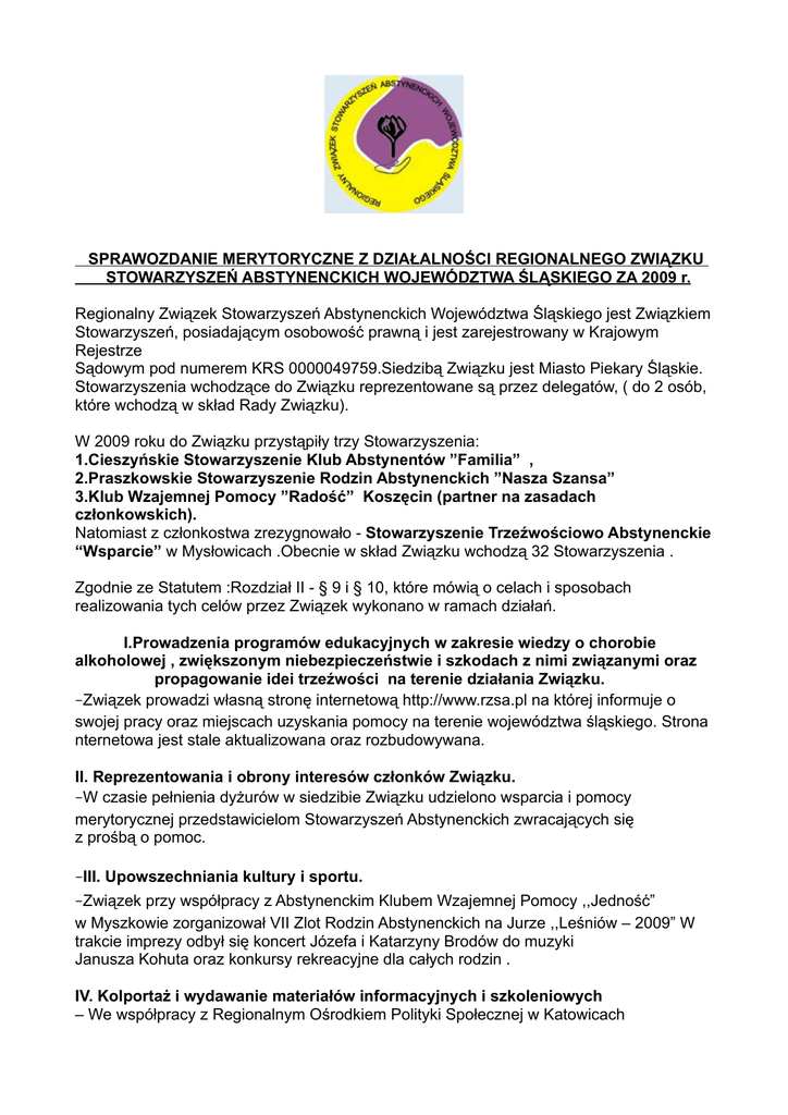 SPRAWOZDANIE MERYTORYCZNE Z DZIAŁALNOŚCI REGIONALNEGO ZWIĄZKU STOWARZYSZEŃ ABSTYNENCKICH WOJEWÓDZTWA ŚLĄSKIEGO ZA 2009 r. Regionalny Związek Stowarzyszeń Abstynenckich Województwa Śląskiego jest Związkiem Stowarzyszeń, posiadającym osobowość prawną i jest zarejestrowany w Krajowym Rejestrze Sądowym pod numerem KRS 0000049759.Siedzibą Związku jest Miasto Piekary Śląskie. Stowarzyszenia wchodzące do Związku reprezentowane są przez delegatów, ( do 2 osób, które wchodzą w skład Rady Związku). W 2009 roku do Związku przystąpiły trzy Stowarzyszenia: 1.Cieszyńskie Stowarzyszenie Klub Abstynentów ”Familia” , 2.Praszkowskie Stowarzyszenie Rodzin Abstynenckich ”Nasza Szansa” 3.Klub Wzajemnej Pomocy ”Radość” Koszęcin (partner na zasadach członkowskich). Natomiast z członkostwa zrezygnowało - Stowarzyszenie Trzeźwościowo Abstynenckie “Wsparcie” w Mysłowicach .Obecnie w skład Związku wchodzą 32 Stowarzyszenia . Zgodnie ze Statutem :Rozdział II - § 9 i § 10, które mówią o celach i sposobach realizowania tych celów przez Związek wykonano w ramach działań. I.Prowadzenia programów edukacyjnych w zakresie wiedzy o chorobie alkoholowej , zwiększonym niebezpieczeństwie i szkodach z nimi związanymi oraz propagowanie idei trzeźwości na terenie działania Związku. –Związek prowadzi własną stronę internetową http://www.rzsa.pl na której informuje o swojej pracy oraz miejscach uzyskania pomocy na terenie województwa śląskiego. Strona nternetowa jest stale aktualizowana oraz rozbudowywana. II. Reprezentowania i obrony interesów członków Związku. –W czasie pełnienia dyżurów w siedzibie Związku udzielono wsparcia i pomocy merytorycznej przedstawicielom Stowarzyszeń Abstynenckich zwracających się z prośbą o pomoc. –III. Upowszechniania kultury i sportu. –Związek przy współpracy z Abstynenckim Klubem Wzajemnej Pomocy ,,Jedność” w Myszkowie zorganizował VII Zlot Rodzin Abstynenckich na Jurze ,,Leśniów – 2009” W trakcie imprezy odbył się koncert Józefa i Katarzyny Brodów do muzyki Janusza Kohuta oraz konkursy rekreacyjne dla całych rodzin . IV. Kolportaż i wydawanie materiałów informacyjnych i szkoleniowych – We współpracy z Regionalnym Ośrodkiem Polityki Społecznej w Katowicach przygotowano materiały szkoleniowe , które otrzymał każdy uczestnik IV Śląskiego Forum Abstynenckiego w Dąbrowie Górniczej. Wydano pamiątkowe znaczki i ulotki informacyjne z okazji IV Śląskiego Forum Abstynenckiego Dąbrowa Górnicza - 2009, które zostały rozprowadzone w 26miastach województwa śląskiego. V. Promocja trzeżwego stylu życia na terenie działania Stowarzyszeniach –W miesiącu wrześniu Związek zorganizował Zlot Rodzin Abstynenckich na Jurze ,,Leśniów-2009” –W miesiącu pażdzierniku Związek zorganizował IV - Śląskie Forum Abstynenckie w Dąbrowie Górniczej . Patronat nad Forum sprawowali : 1. - Wojewoda Śląski 2. - Marszałek Województwa Śląskiego 3. - Arcybiskup Sosnowiecki 4. - Prezydent miasta Dąbrowa Górnicza 5. - Państwowa Agencja Rozwiązywania Problemów Alkoholowych reprezentowana przez Panią Agnieszkę Czerkawską Kopiel . 6. - Polska Rada Ruchu Abstynenckiego. Współorganizatorami Forum był: Regionalny Ośrodek Polityki Społecznej w Katowicach oraz Stowarzyszenia Abstynenckie zrzeszone w RZSA Województwa Śląskiego. - Utrzymujemy stały kontakt z Młodzieżową Szkołą Liderów w Mikołowie. VI.Przygotowania swoich przedstawicieli do pracy w środowiskach lokalnych a) udział w szkoleniach i konferencjach organizowanych przez profesjonalne instytucje: –Związek był partnerem Abstynenckiego Klubu Wzajemnej Pomocy ,,Jedność” w Myszkowie w organizacji szkolenia ,,Podnoszenie Kwalifikacji osób pracujących z używającymi narkotyków” sfinansowanego przez Ministerstwo Pracy i Polityki Społecznej Szkolenie odbyło się w Ośrodku Wypoczynkowo-szkoleniowym,,Orle Gniazdo” w Hucisku Udział wzięło 40 osób członków Stowarzyszeń zrzeszonych w R.Z.S.A. –Członkowie (22 osoby) Stowarzyszeń zrzeszonych w R.Z.S.A. uczestniczyli w cyklu szkoleń zorganizowanych przez Regionalny Ośrodek Polityki Społecznej w Katowicach , Myszkowie ,Ustroniu i Szczyrku.( pierwszy kontakt , telefon zaufania , organizacja zajęć integracyjnych i asertywność ). b) udział w spotkaniach organizowanych przez Krajową Radę Ruchu Abstynenckiego w Białobrzegach. VII. Koordynacja wspólnych działań członków Związku – Co trzy miesiące organizowane były posiedzenia Rady Związku, na które zapraszano delegatów oraz przedstawicieli Zarządów Stowarzyszeń. Zarząd kontynuował spotkania robocze ze Stowarzyszeniami spoza Związku w celu wymiany doświadczeń, efektywniejszego działania w społeczeństwie w zakresie edukacji i wiedzy o szkodach i niebezpieczeństwach związanych ze spożywaniem alkoholu. - Związek zorganizował Wielkanocne i Opłatkowe spotkania Świąteczne, w których razem wzięło udziało 160 osób. Byli przedstawiciele kościoła, Prezesi i członkowie Rady Związku, oraz przedstawiciele zaprzyjaźnionych organizacji i władz samorządowych . - Uczestniczyliśmy w ,,III- Pikniku Rodzinnym” zorganizowanym przez Abstynencki Klub Wzajemnej Pomocy ,,Jedność '' w Myszkowie pod hasłem"Postaw na zdrowie" z koncertami profilaktycznymi zespołów muzycznych .Były też rozdawane materiały promocyjne Ogólnopolskiej Kampani ,,Sprawdz czy twoje picie jest bezpieczne” Spotkania te organizowane były w celu poprawy jakości pracy oraz integracji środowisk trzeźwościowych . Cały rok członkowie Zarządu Związku pełnili dyżury w siedzibie Związku, w każdy poniedziałek od godz.17,00 do 19,30 udzielając wsparcia organizacyjnego. - Braliśmy jako Związek czynny udział w obchodach rocznicowych Stowarzyszeń Abstynenckich zrzeszonych w Związku oraz innych na terenie całego kraju. - Uczestniczyliśmy w XIII Ponadregion