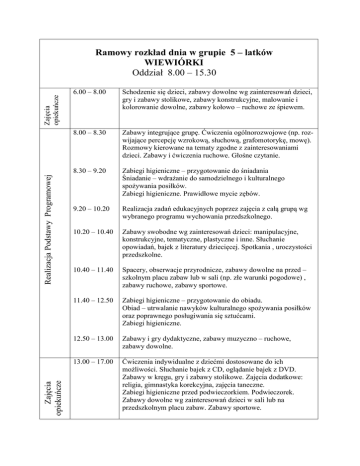 Zajęcia opiekuńcze Realizacja Podstawy Programowej Zajęcia opiekuńcze Ramowy rozkład dnia w grupie 5 – latków WIEWIÓRKI Oddział 8.00 – 15.30 6.00 – 8.00 Schodzenie się dzieci, zabawy dowolne wg zainteresowań dzieci, gry i zabawy stolikowe, zabawy konstrukcyjne, malowanie i kolorowanie dowolne, zabawy kołowo – ruchowe ze śpiewem. 8.00 – 8.30 Zabawy integrujące grupę. Ćwiczenia ogólnorozwojowe (np. rozwijające percepcję wzrokową, słuchową, grafomotorykę, mowę). Rozmowy kierowane na tematy zgodne z zainteresowaniami dzieci. Zabawy i ćwiczenia ruchowe. Głośne czytanie. 8.30 – 9.20 Zabiegi higieniczne – przygotowanie do śniadania Śniadanie – wdrażanie do samodzielnego i kulturalnego spożywania posiłków. Zabiegi higieniczne. Prawidłowe mycie zębów. 9.20 – 10.20 Realizacja zadań edukacyjnych poprzez zajęcia z całą grupą wg wybranego programu wychowania przedszkolnego. 10.20 – 10.40 Zabawy swobodne wg zainteresowań dzieci: manipulacyjne, konstrukcyjne, tematyczne, plastyczne i inne. Słuchanie opowiadań, bajek z literatury dziecięcej. Spotkania , uroczystości przedszkolne. 10.40 – 11.40 Spacery, obserwacje przyrodnicze, zabawy dowolne na przed – szkolnym placu zabaw lub w sali (np. złe warunki pogodowe) , zabawy ruchowe, zabawy sportowe. 11.40 – 12.50 Zabiegi higieniczne – przygotowanie do obiadu. Obiad – utrwalanie nawyków kulturalnego spożywania posiłków oraz poprawnego posługiwania się sztućcami. Zabiegi higieniczne. 12.50 – 13.00 Zabawy i gry dydaktyczne, zabawy muzyczno – ruchowe, zabawy dowolne. 13.00 – 17.00 Ćwiczenia indywidualne z dziećmi dostosowane do ich możliwości. Słuchanie bajek z CD, oglądanie bajek z DVD. Zabawy w kręgu, gry i zabawy stolikowe. Zajęcia dodatkowe: religia, gimnastyka korekcyjna, zajęcia taneczne. Zabiegi higieniczne przed podwieczorkiem. Podwieczorek. Zabawy dowolne wg zainteresowań dzieci w sali lub na przedszkolnym placu zabaw. Zabawy sportowe.