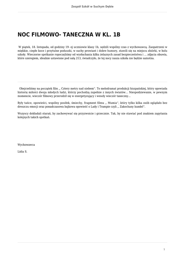 Zespół Szkół w Suchym Dębie NOC FILMOWO- TANECZNA W KL. 1B W piątek, 18. listopada, od godziny 19- ej uczniowie klasy 1b, sędzili wspólny czas z wychowawcą. Zaopatrzeni w miękkie, ciepłe koce i przytulne poduszki, w suchy prowiant i dobre humory, stawili się na miejscu zbiórki, w holu szkoły. Wieczorne spotkanie ropoczęliśmy od wysłuchania kilku żelaznych zasad bezpieczeństwa i ... zdjęcia obuwia, które szeregiem, idealnie ustawione pod salą 213, świadczyło, że tej nocy nasza szkoła nie będzie samotna. Obejrzeliśmy na początek film ,, Cztery metry nad niebem''. To melodramat produkcji hiszpańskiej, który opowiada historię miłości dwoja młodych ludzi, którzy pochodzą zupełnie z innych światów... Niespodziewanie, w pewnym momencie, wieczór filmowy przerodził się w energetyzujący i wesoły wieczór taneczny... Były tańce, opowieści, wspólny posiłek, śmiechy, fragment filmu ,, Mumia'', który tylko kilka osób oglądało bez dreszczu emocji oraz ponadczasowa bajkowa opowieść o Lady i Trampie czyli ,, Zakochany kundel''. Wszyscy dokładali starań, by zachowywać się przyzwoicie i grzecznie. Tak, by nie stawiać pod znakiem zapytania kolejnych takich spotkań. Wychowawca Lidia S. 1