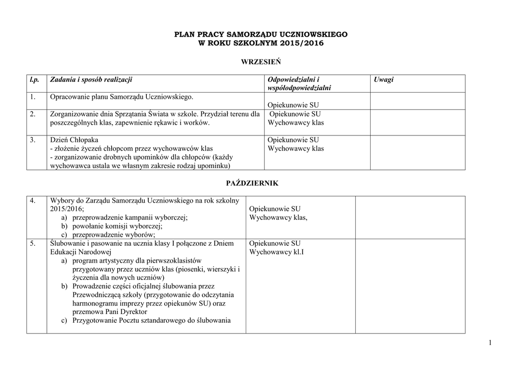 PLAN PRACY SAMORZĄDU UCZNIOWSKIEGO