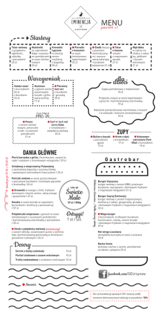 MENU jesień 2016 v.3 Startery Tatar wołowy z grzybkami, ogórkiem, cebulką i pieczywem 25 zł Naleśniki ze szpinakiem baby i suszonymi pomidorami w sosie śmietanowym 23 zł Pierożki z łososiem w sosie śmietanowokoperkowym 25 zł Krewetki tygrysie w emulsji winnomaślanej z bagietką 35 zł Śledź (Matjas) z plackami ziemniaczanymi, marynowaną kalarepą i burakiem balsamico 21 zł Warzywniak Sałata cezar z kurczakiem 26 zł z boczkiem 24 zł Hummus z jajkiem poche sezamowym teryaki i grillowaną tortillą 17 zł Tatar z łososia umami z majonezem wasabi 27 zł Wątróbka w cydrze na chałce z cebulką, jabłkami i musem wiśniowym 21 zł dla dzieci Pieczony kozi ser z burakiem i gruszką 25 zł Zupka pomidorowa z makaronem 10 zł Pulpeciki cielęce w sosie koperkowym z gnocchi i karmelizowaną marchewką 19 zł Naleśniki pomarańczowo-karmelowe z musem z truskawek i kremem śmietankowym 10 zł Surf n’ turf red curry Soba z krewetkami i polędwicą wołową 35 zł Bulion z kaczki z pierożkami gyoza 13 zł Pierś kurczaka z grilla z hummusem, sosem teryaki i sałatami z limonkowym vinaigrette / 29 zł Krem z dyni z krewetkami 17 zł Kokosowocytrynowa (Tom Kha) z kurczakiem 15 zł Gastrobar Schabowy z wieprzowiny Puławskiej z zasmażaną kapustą z suszoną śliwką i opiekanymi ziemniakami francuskimi / 33 zł Policzki wołowe w sosie porzeczkowym z pieczonym burakiem i truflowym pęczotto z brukselką / 45 zł Krewetki w mango z chilli, frytkami domowymi z kozim serem, salsą mango i guacamole / 47 zł Kaczka w sosie brandy ze szpeclami, buraczkami i konfiturą z pomarańczy / 57 zł Polędwiczki wieprzowe z gnocchi w sosie śmietanowym z suszonymi pomidorami i karmelizowaną marchewką z tymiankiem / 35 zł czw-pt Świeże Mule 39 zł / 500g Ostrygi! 7 zł / szt. Steak z polędwicy wołowej (sezonowany) z sosem whisky, sezamowym puree z ziemniaków, karmelizowaną pietruszką w śmietanie i groszkiem cukrowym / 65 zł Wołowina Limousine / Bułki własnej roboty Lunch pn-pt 13-16 / 19,90 zł Penne z sosem śmietanowym, prosciutto crudo i suszonymi pomidorami 31 zł Burger klasyczny burger wołowy z sosem BBQ, prażonym boczkiem, warzywami i domowymi frytkami z majonezem belgijskim 31 zł Burger Szarej Eminencji burger wołowy z sosem majonezowym, konfiturą z cebuli, gorgonzolą, gruszką i domowymi frytkami z majonezem belgijskimi 33 zł Wege burger z boczniakiem, truflowym burakiem, hummusem, rukolą, sosem teryaki i domowymi frytkami z majonezem belgijskim 29 zł Hot wings Louisiana skrzydełka kurczaka w sosie Louisiana 18 zł Desery Sernik z białej czekolady 13 zł Parfait chałwowe z sosem wiśniowym 15 zł Nacho fiesta domowe nachos z serem, pomidorami arrabiata i jalapeno 25 zł Trufla czekoladowa z sorbetem malinowym15 zł facebook.com/SEUrsynow Nowości Do rachunków grupowych (10 i więcej osób) zostanie doliczony koszt obsługi w wysokości 10% instagram.com/szaraem Napoje gorące Piwo Cappuccino 11 zł Espresso 8 zł Espresso doppio 12 zł Cafe Latte 13 zł Herbata 9 zł Herbata zimowa 12 zł Keg Napary: Rozmaryn-Amol 15 zł Imbir-pomarańcza 13 zł Lawenda-malina 15 zł Nowości Wino Tucher Pilsner (jasne) 0.3 l 8 zł 0.5 l 10 zł Tucher Hefe Weizen (pszeniczne) 0.3 l 9 zł 0.5 l 12 zł fizz y Lambrusco Castelvetro Righi (czerwone, półsłodkie) 0.1 l Butelkowe 8 zł / 0.75 l 60 zł Cava Bach Extrisimo Tucher Pils 0.5 l (jasne) 11 zł Tucher Doppelbock (ciemne) 0.5 l 14 zł Tucher Reifbrau (bezalkoholowe) 0.5 l 11 zł (białe, półwytrawne) 0.1 l 10 zł / 0.75 l 73 zł Prosecco Gancia (białe, półwytrawne) Napoje zimne 0.1 l Drinki Domowa ice tea 12 zł Domowe lemoniady: klasyczna 12 zł malinowo-lawendowa 15 zł gruszkowo-szafranowa 15 zł Kawa mrożona z lodami, bitą śmietaną i cynamonem 15 zł Kawa cold brew 7 zł Świeży sok z pomarańczy 13 zł Karafka wody z cytryną 15 zł Coca-Cola / Coca-Cola Zero / Fanta / Sprite / Kinley Tonic 0,2 l 6 zł Sok Cappy 0,2 l 6 zł Woda Kropla Beskidu 0,3 l 6 zł Burn 0,25 l 12 zł Alkohole house Grzane: białe: Chardonnay 7 zł / 16 zł / 31 zł / 45 zł / 59 zł 0.1 l / 0,25 l / 0,5 l / 0,75 l / 1 l Grzaniec czerwony 13 zł Grzaniec biały 14 zł Hot Malibu Apple 15 zł Grzany rum z gruszką 15 zł czerwone: Tempranilo 7 zł / 16 zł / 31 zł / 45 zł / 59 zł 0.1 l / 0,25 l / 0,5 l / 0,75 l / 1 l białe Klasyczne: Vernaccia di San Gimignano Mojito 17 zł (Virgin 12 zł) (Włochy) (biały rum, limonka, cukier trzcinowy, 0.1 l mięta, woda gazowana) Chardonnay Mauro Cuba Libre 16 zł 0.1 l (ciemny rum, cola, limonka) (Niemcy) (whisky, limonka, syrop cukrowy) 0.1 l (Hiszpania) (Aperol, Prosecco, woda gazowana) 0.1 l (Chile) sok z limonki) 0.1 l Long Island Ice Tea 27 zł (Włochy) sour, coca-cola) 0.1 l (whisky, triple sec, sweet, sour, Sprite) Primitivo Mauro Autorskie: (Włochy) 0.1 l Fantazja Dziewicy 23 zł - 10 zł / 0.75 l - 73 zł Gran Sangre de Toro (rum, wódka, marakuja,mięta, (Hiszpania) biała czekolada, angostura bitters) 0.1 l - 15 zł / 0.75 l - 110 zł Nero d’Avola Caleo Sen Ogrodnika 21 zł (Włochy) (Whisky, marakuja, ogórek) tymianek, sweet, sour) - 8 zł / 0.75 l - 55 zł czer wone Lynchburg Lemonade 23 zł (gin, prosecco, likier melonowy, - 12 zł / 0.75 l - 84 zł Pinot Grigio (gin, tequila, wódka, rum, triple sec, Zielony Skrzat 23 zł - 12 zł / 0.75 l - 84 zł Sauvignon Blanc Santa Digna (wódka, triple sec, sok żurawinowy Sprite splash) - 11 zł / 0.75 l - 80 zł Torres - Vina Esmeralda Aperol Spritz 18 zł Letnie Harce 19 zł - 10 zł / 0.75 l - 73 zł Riesling Gourmet Mosel Whisky Sour 16 zł (Passoa, wódka, maliny, sweet, sour, 15 zł / 0.75 l 110 zł (Włochy) Cosmopolitan 23 zł wódka Żubrówka Biała 0,04 l 6 zł / 0,7l 90 zł Żubrówka Czarna 0,04 l 8 zł / 0,7 l 130 zł Russian Standard 0,04 l 9 zł / 0,7l 150 zł Soplica (wiśnia, śliwka) 0,04 l 6 zł whisky wybór Loży Dżentelmeniów Grants 0,04 l 10 zł Jack Daniel’s 0,04 l 14 zł Wild Turkey 81/101 0,04 l 14