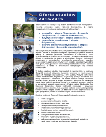 O ferta stu d ió w 2015/2016 Zapraszamy na cieszące się dużym zainteresowaniem kandydatów i renomą, atrakcyjne studia 1.stopnia (licencjackie), 2. stopnia (magisterskie) i 3. stopnia (doktoranckie)na kierunkach: geografia 1. stopnia (licencjackie) , 2. stopnia (magisterskie) i 3. stopnia (doktoranckie), turystyka i rekreacja 1. stopnia (licencjackie), gospodarka przestrzenna 1. stopnia (inżynierskie), ochrona środowiska (inżynierskie) 1. stopnia (inżynierskie) i 2. stopnia (magisterskie). Na każdym kierunku studiów oferujemy szeroki wachlarz specjalności do wyboru. Studia w Instytucie Geografii zapewniają uzyskanie szerokiej wiedzy w zakresie poznania, zrozumienia i interpretacji zasad funkcjonowania środowiska przyrodniczego i społeczno-gospodarczego, dobrze przygotowując do pracy w szkolnictwie, firmach i instytucjach związanych z zarządzaniem przestrzenią geograficzną, rozwojem gospodarczym, społecznym i kulturowym układów przestrzennych różnej skali (gmin, miast, powiatów, województw) oraz kształtowaniem i ochroną środowiska, a także w dynamicznie rozwijającym się sektorze turystycznym. W trakcie realizacji studiów licencjackich i magisterskich w Instytucie Geografii studenci odbywają ćwiczenia terenowe w najciekawszych regionach naszego kraju (Beskidy, Tatry, Sudety, Wyżyna Małopolska, Kotlina Sandomierska, Pojezierza, Wybrzeże), praktyki zawodowe oraz obozy wędrowne i rowerowe. W czasie studiów istnieje możliwość realizacji części kursów w języku angielskim, wyjazdów na atrakcyjne zagraniczne praktyki wymienne i staże oraz realizacji semestru studiów w jednostkach uczelni zagranicznych. Prężnie działa Studenckie Koło Naukowe Geografów, dające możliwość ciekawego i aktywnego spędzenia okresu studiów, m.in. poprzez badania naukowe i organizację wypraw w różne części świata. Do działania w SKNG zaproszeni są nie tylko geografowie, ale także studenci innych kierunków studiów. Studia w Instytucie Geografii Uniwersytetu Pedagogicznego to: wielka przygoda, poznawanie i odkrywanie świata, niezapomniane podróże i wyprawy, zdobywanie wiedzy i umiejętności, możliwość wszechstronnego rozwoju, kształtowanie postaw przedsiębiorczych, poszerzanie horyzontów, zdobywanie ciekawych doświadczeń, kreowanie wyobraźni przestrzennej, dobre przygotowanie do aktywności zawodowej, wejścia na rynek pracy i życia we współczesnym świecie. GEOGRFIA Stacjonarne i niestacjonarne studia licencjackie I stopnia 3-letnie (nauczycielskie/nienauczycielskie) Kryterium przyjęć: średnia wyników z egzaminu maturalnego. Stacjonarne i niestacjonarne studia 2. stopnia (magisterskie) 2-letnie (nauczycielskie/nienauczycielskie) Studia dla absolwentów studiów I stopnia (dyplom licencjata lub inżyniera) wszystkich kierunków. Kryteria przyjęć: konkurs świadectw dla absolwentów studiów wyższych posiadających dyplom licencjata, inżyniera lub magistra kierunku geografia, turystyka i rekreacja, ochrona środowiska lub gospodarka przestrzenna test z podstaw geografii dla absolwentów dowolnych kierunków studiów 1. stopnia lub jednolitych magisterskich. Na studiach licencjackich i magisterskich istnieje możliwość wyboru jednej ze specjalności* nauczycielskich: geografia z przyrodą, oraz wyłącznie na studiach magisterskich: geografia (bez II przedmiotu) geografia z podstawami przedsiębiorczości, geografia z przyrodą (w liceum), geografia z wiedzą o społeczeństwie, lub jednej ze specjalności* nienauczycielskich: geografia fizyczna, geografia z geoturystyką, geografia z przedsiębiorczością i gospodarką przestrzenną, geografia regionalna Ameryki Łacińskiej, geografia regionalna Azji Południowej, geografia regionalna Dalekiego Wschodu, geografia z turystyką, geografia z zarządzaniem środowiskiem geograficznym, oraz wyłącznie na studiach licencjackich: geografia z geoinformacją. * Uwaga: warunkiem uruchomienia na każdym kierunku studiów danej specjalności jest zgłoszenie się na nią co najmniej 15 osób. Na studiach II stopnia (magisterskich) specjalność nauczycielską mogą wybrać absolwenci studiów kierunku geografia. Wybór specjalności na studiach I stopnia odbywa się pod koniec pierwszego roku, natomiast na studiach II stopnia na początku pierwszego roku. TURYSTYKA I REKREACJA Stacjonarne i niestacjonarne (nienauczycielskie) studia licencjackie 1. stopnia 3-letnie Kryterium przyjęć: średnia wyników z egzaminu maturalnego. Specjalności* wybierane po pierwszym roku studiów: aktywizacja turystyczna układów przestrzennych, animacja w turystyce, dziedzictwo kulturowe, geoturystyka, pilotaż i przewodnictwo turystyczne po Polsce, przedsiębiorczość w turystyce, turystyka międzynarodowa. * Uwaga: warunkiem uruchomienia na każdym kierunku studiów danej specjalności jest zgłoszenie się na nią co najmniej 15 osób. GOSPODARKA PRZESTRZENNA Stacjonarne i niestacjonarne (nienauczycielskie) studia inżynierskie 1. Kryterium przyjęć: średnia wyników z egzaminu maturalnego. Po I roku istnieje możliwość wyboru jednej ze specjalności*: geoinformacja, gospodarka przestrzenna obszarów miejskich, gospodarowanie odnawialnymi źródłami energii, przedsiębiorczość w aktywizacji gospodarczej układów przestrzennych, zarządzanie rozwojem lokalnym i regionalnym, zarządzanie środowiskiem geograficznym. stopnia, 3,5-letnie * Uwaga: warunkiem uruchomienia na każdym kierunku studiów danej specjalności jest zgłoszenie się na nią co najmniej 15 osób. OCHRONA ŚRODOWISKA Stacjonarne międzywydziałowe studia inżynierskie 1. (nienauczycielskie) prowadzimy wspólnie z Instytutem Biologii. stopnia 3,5-letnie Po 1. roku na studiach 1. stopnia (inżynierskich) istnieje możliwość wyboru jednej ze specjalności*: zarządzanie środowiskiem geograficznym (specjalność Geografii), odnawialne źródła energii (specjalność Instytutu Techniki). Instytutu Stacjonarne, międzywydziałow