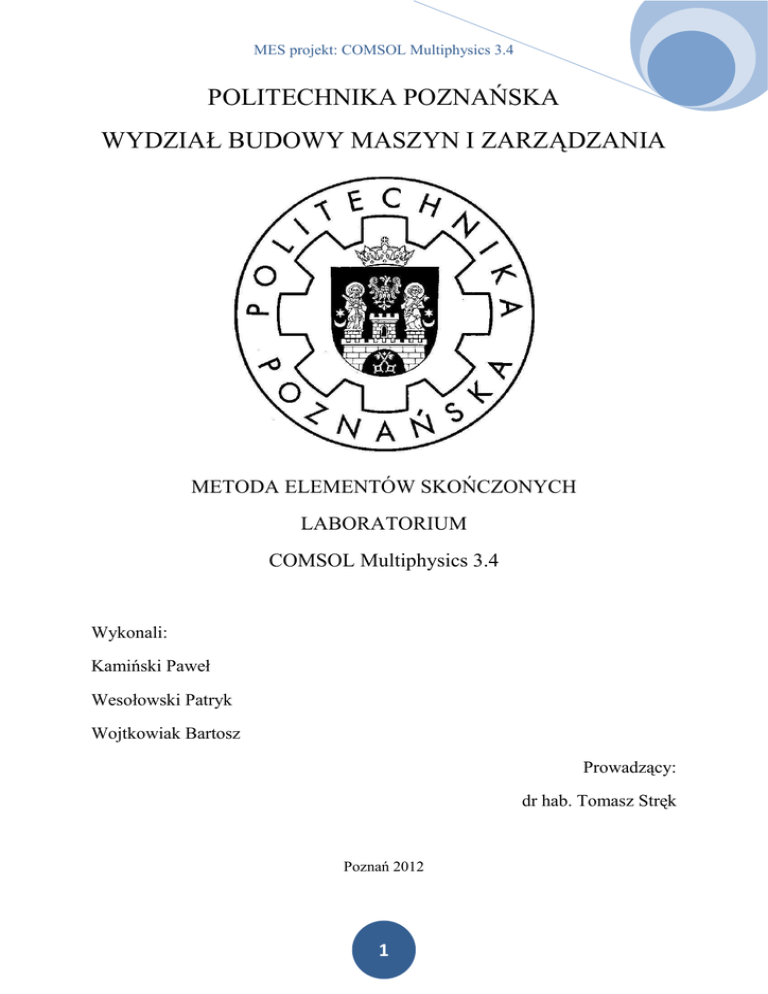 MES projekt: COMSOL Multiphysics 3.4 POLITECHNIKA POZNAŃSKA WYDZIAŁ BUDOWY MASZYN I ZARZĄDZANIA METODA ELEMENTÓW SKOŃCZONYCH LABORATORIUM COMSOL Multiphysics 3.4 Wykonali: Kamiński Paweł Wesołowski Patryk Wojtkowiak Bartosz Prowadzący: dr hab. Tomasz Stręk Poznań 2012 1 MES projekt: COMSOL Multiphysics 3.4 2 MES projekt: COMSOL Multiphysics 3.4 1. Zginanie podpór w zaleŜności od kształtu 1.1 Wstęp Badanie odkształceń obiektów po przyłoŜeniu odpowiedniej siły słuŜy przede wszystkim ukazaniu zachowania obiektu badanego w rzeczywistości. Celem badania pokazanego poniŜej, było ukazanie występujących napręŜeń w podporach o zróŜnicowanej konstrukcji. W tym celu posłuŜono się równaniem Lagrange’a II: · 1.2 Dane wejściowe Rys. 1. Podpora z 3 otworami Rys. 2. Podpora profilowa 3 MES projekt: COMSOL Multiphysics 3.4 1.3 Parametry zadane Rys. 3. Parametry wejściowe do badań 1.4 Utwierdzenie i obciąŜenie próbek Rys. 4. Utwierdzenie próbki z otworami Rys. 5. Utwierdzenie próbki z otworami 4 MES projekt: COMSOL Multiphysics 3.4 Rys. 6. ObciąŜenie próbki obciąŜeniem ciągłym Rys. 7. ObciąŜenie próbki obciąŜeniem ciągłym Dla podpory profilowej zostały zadane identyczne parametry początkowe, dlatego w dalszej części projektu zostanie pokazany otrzymany wynik symulacji. 1.5 Otrzymane wyniki 5 MES projekt: COMSOL Multiphysics 3.4 Jak widać na powyŜszym rysunku nagromadzenie napręŜeń nastąpiło w pobliŜu najbliŜszego wycięcia okręgu, zarówno na górze jak i na dole próbki. Maksymalna wartość odkształcenia wyniosła 4,39 · 10 Pa, minimalna natomiast 189,55 Pa. Powstałe odkształcenia spowodowane są ograniczeniem stopnia swobody próbki. W próbce drugiej, napręŜenia nagromadziły się w górnej części próbki, w miejscu mocowania co spowodowane jest ograniczeniem stopnia swobody. RozłoŜenie napręŜeń jest inne niŜ w przypadku próbki pierwszej. Maksymalne napręŜenie wyniosło 1,43 · 10 Pa, natomiast minimalne 657,26 Pa. Wnioski Na podstawie otrzymanych wyników moŜemy stwierdzić, Ŝe dla zadanego cięŜaru 8000 N, lepiej sprawować się będzie podpora pierwsza, gdyŜ to właśnie w niej występują mniejsze napręŜenia. Powodem jest lepsza konstrukcja podpory pierwszej. 2. Przepływ powietrza 2.1 Wstęp Celem badania jest przepływ powietrza przez płytę chłodzącą do laptopa. 6 MES projekt: COMSOL Multiphysics 3.4 2.2 Dane wejściowe Rys. 8. Określanie właściwości powietrza 7 MES projekt: COMSOL Multiphysics 3.4 Rys. 9. Wprowadzanie danych w oknie Bondary Settings 2.3 Otrzymane wyniki Rys. 10. Wyniki symulacji 8 MES projekt: COMSOL Multiphysics 3.4 Wnioski W płycie chłodzącej dochodzi do duŜych zawirowań powietrza, jednak ogólny i końcowy efekt końcowy rozpływu powietrza jest osiągnięty. Powietrze równomiernie przelatuje do wszystkich otworów chodząc płytę. 3. Przepływ ciepła 3.1 Wstęp Zjawisko przepływu ciepła będzie rozpatrywane na przykładzie podstawki do wyjmowania pizzy z pieca. Jest ona wykonana z drewna – Parana Pine (sosna Brazylijska). Za temperaturę pokojową przyjęto 20˚C ( 293 K). Temperaturę inicjującą przyjęliśmy 140˚C (413 K, jako temperaturę pizzy znajdującej się w piecu). 3.2. Dane wejściowe Model fizyczny został stworzony za pomocą programu Catia D.S. 9 MES projekt: COMSOL Multiphysics 3.4 Następnym krokiem było wczytanie utworzonego modelu w programie Comsol oraz nadanie parametrów wymaganych do przeprowadzenia badania przepływu ciepła min.: - materiału z którego został wykonany model ( waŜny wskaźnik przewodności ciepła); - temperatury pokojowej w którym znajdowałaby się podstawka i w otoczeniu której zachodziło by zjawisko przepływu ciepła; 10 MES projekt: COMSOL Multiphysics 3.4 - określenie powierzchni od której zachodzi inicjacja rozpływu temperaury po przedstawionym obiekcie (w tym przypadku powierzchnią tą jest ta, która przylega bezpośrednio do pizzy w piecu – 413 K); - określenie parametrów taktowania obliczeń - 1 sekunda oraz czasu całego przepływu który wynosi 60 sekund; 11 MES projekt: COMSOL Multiphysics 3.4 - w chwili gdy wszystkie parametry wejściowe zostały określone naleŜy przeprowadzić podział modelu fizycznego na mniejsze figury geometryczne w celu przeprowadzenie obliczeń za pomocą metody elementów skończonych; - w przypadku gdy podział na figury geometryczne został przeprowadzony bez problemów naleŜy przeprowadzić obliczenia, których wynikiem jest otrzymany model wraz z wartościami rozłoŜonymi w procesie przepływu ciepła po czasie 60 sekund poczynając od powierzchni inicjującej w otoczeniu temperatury pokojowej jaka została przyjęta. 3.3. Wnioski Przepływ ciepła, jak widać na w/w rysunku, przebiegł zgodnie z oczekiwaniami. Przesadnie została przyjęta wartość 60 sekund ogrzewania części, na której znajdowała by się gorąca pizza lub która znajdowała by się w piecu. Po czasie jednej minuty rękojeść podstawki ( jej temperatura) nadal zostaje w stanie początkowym przez co osoba obsługująca piec nie jest naraŜona na ryzyko poparzenia. W przypadku gdybyśmy wyjęli pizze z pieca naleŜałoby równieŜ uwzględnić to, Ŝe temperatura ogrzanej pizzy spada więc wynik mógłby się w niewielkim stopniu róŜnić od uzyskanego. 12