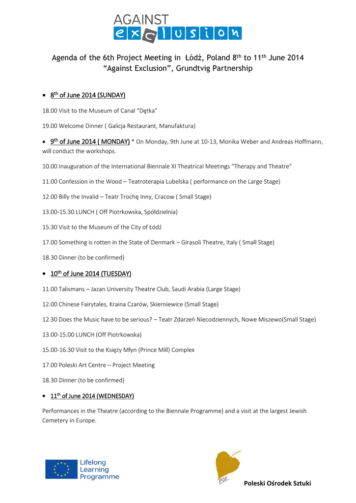 Agenda of the 6th Project Meeting in Łódź, Poland 8th to 11th June 2014 “Against Exclusion”, Grundtvig Partnership 8th of June 2014 (SUNDAY) 18.00 Visit to the Museum of Canal “Dętka” 19.00 Welcome Dinner ( Galicja Restaurant, Manufaktura) 9th of June 2014 ( MONDAY) * On Monday, 9th June at 10-13, Monika Weber and Andreas Hoffmann, will conduct the workshops. 10.00 Inauguration of the International Biennale XI Theatrical Meetings “Therapy and Theatre” 11.00 Confession in the Wood – Teatroterapia Lubelska ( performance on the Large Stage) 12.00 Billy the Invalid – Teatr Trochę Inny, Cracow ( Small Stage) 13.00-15.30 LUNCH ( Off Piotrkowska, Spółdzielnia) 15.30 Visit to the Museum of the City of Łódź 17.00 Something is rotten in the State of Denmark – Girasoli Theatre, Italy ( Small Stage) 18.30 Dinner (to be confirmed) 10th of June 2014 (TUESDAY) 11.00 Talismans – Jazan University Theatre Club, Saudi Arabia (Large Stage) 12.00 Chinese Fairytales, Kraina Czarów, Skierniewice (Small Stage) 12.30 Does the Music have to be serious? – Teatr Zdarzeń Niecodziennych, Nowe Miszewo(Small Stage) 13.00-15.00 LUNCH (Off Piotrkowska) 15.00-16.30 Visit to the Księży Młyn (Prince Mill) Complex 17.00 Poleski Art Centre – Project Meeting 18.30 Dinner (to be confirmed) 11th of June 2014 (WEDNESDAY) Performances in the Theatre (according to the Biennale Programme) and a visit at the largest Jewish Cemetery in Europe. Poleski Ośrodek Sztuki