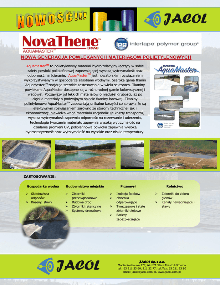 NOWA GENERACJA POWLEKANYCH MATERIAŁÓW POLIETYLENOWYCH AquaMasterTM to polietylenowy materiał hydroizolacyjny łączący w sobie zalety powłoki poliolefinowej zapewniającej wysoką wytrzymałość oraz odporność na ścieranie. AquaMasterTM jest nowatorskim rozwiązaniem wykorzystywanym w gospodarce zasobami wodnymi. Szeroka gama tkanin AquaMasterTM znajduje szerokie zastosowanie w wielu sektorach. Tkaniny powlekane AquaMaster dostępne są w różnorodnej gamie kolorystycznej i wagowej. Począwszy od lekkich materiałów o niedużej grubości, aż po ciężkie materiały o podwójnym splocie tkaniny bazowej. Tkaniny polietylenowe AquaMasterTM zapewniają unikalne korzyści co sprawia że są efektywnym rozwiązaniem zarówno ze storony technicznej jak i ekonomicznej: niewielka waga materiału racjonalizuje koszty transportu, wysoka wytrzymałość zapewnia odporność na rozerwanie i uderzenia, technologia tworzenia materiału zapewnia wysoką wytrzymałość na działanie promieni UV, poliolefinowa powłoka zapewnia wysoką hydrostatyczność oraz wytrzymałość na wysokie oraz niskie temperatury. ZASTOSOWANIE: Gospodarka wodna Budownictwo miejskie Składowiska odpadów Baseny, stawy Zbiorniki przeciwpożarowe Budowa dróg Zbiorniki retencyjne Systemy drenażowe Przemysł Rolnictwo Izolacja ścieków Zbiorniki odparowujące Tymczasowe i stałe zbiorniki olejowe Bariery zabezpieczające Zbiorniki do zbioru glonów Kanały nawadniające i stawy JACOL Sp. z o.o. Modła Królewska 17F, 62-571 Stare Miasto k/Konina tel.: 63 211 23 60, 211 22 77, tel./fax: 63 211 23 80 email: [email protected], www.jacol.com.pl