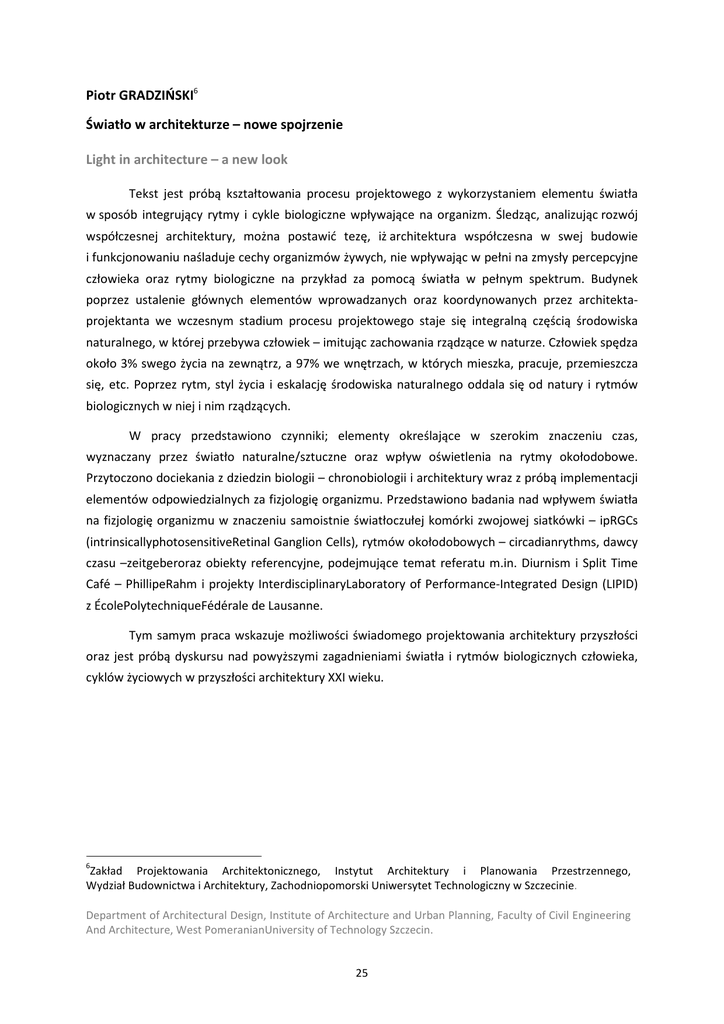 Piotr GRADZIŃSKI6 Światło w architekturze – nowe spojrzenie Light in architecture – a new look Tekst jest próbą kształtowania procesu projektowego z wykorzystaniem elementu światła w sposób integrujący rytmy i cykle biologiczne wpływające na organizm. Śledząc, analizując rozwój współczesnej architektury, można postawić tezę, iż architektura współczesna w swej budowie i funkcjonowaniu naśladuje cechy organizmów żywych, nie wpływając w pełni na zmysły percepcyjne człowieka oraz rytmy biologiczne na przykład za pomocą światła w pełnym spektrum. Budynek poprzez ustalenie głównych elementów wprowadzanych oraz koordynowanych przez architektaprojektanta we wczesnym stadium procesu projektowego staje się integralną częścią środowiska naturalnego, w której przebywa człowiek – imitując zachowania rządzące w naturze. Człowiek spędza około 3% swego życia na zewnątrz, a 97% we wnętrzach, w których mieszka, pracuje, przemieszcza się, etc. Poprzez rytm, styl życia i eskalację środowiska naturalnego oddala się od natury i rytmów biologicznych w niej i nim rządzących. W pracy przedstawiono czynniki; elementy określające w szerokim znaczeniu czas, wyznaczany przez światło naturalne/sztuczne oraz wpływ oświetlenia na rytmy okołodobowe. Przytoczono dociekania z dziedzin biologii – chronobiologii i architektury wraz z próbą implementacji elementów odpowiedzialnych za fizjologię organizmu. Przedstawiono badania nad wpływem światła na fizjologię organizmu w znaczeniu samoistnie światłoczułej komórki zwojowej siatkówki – ipRGCs (intrinsicallyphotosensitiveRetinal Ganglion Cells), rytmów okołodobowych – circadianrythms, dawcy czasu –zeitgeberoraz obiekty referencyjne, podejmujące temat referatu m.in. Diurnism i Split Time Café – PhillipeRahm i projekty InterdisciplinaryLaboratory of Performance-Integrated Design (LIPID) z ÉcolePolytechniqueFédérale de Lausanne. Tym samym praca wskazuje możliwości świadomego projektowania architektury przyszłości oraz jest próbą dyskursu nad powyższymi zagadnieniami światła i rytmów biologicznych człowieka, cyklów życiowych w przyszłości architektury XXI wieku. 6 Zakład Projektowania Architektonicznego, Instytut Architektury i Planowania Przestrzennego, Wydział Budownictwa i Architektury, Zachodniopomorski Uniwersytet Technologiczny w Szczecinie. Department of Architectural Design, Institute of Architecture and Urban Planning, Faculty of Civil Engineering And Architecture, West PomeranianUniversity of Technology Szczecin. 25 The paper attempts about shaping the design process using the element of light in a way that integrates biological rhythms and cycles affecting the organism. Tracking, analyzing the development of contemporary architecture, is possible to create a thesis, that the contemporary architecture in his structure and functioning mimics the characteristics of living organisms, affecting not fully on the human perceptual senses and biological rhythms, for example using a full-spectrum of light. The building, by establishing the main elements introduced and coordinated by the architectdesigner in the early stages of the design process becomes an integral part of the environment in which resides - mimicking the behavior governing in nature. Peoples spends about 3% of life outdoors and 97% indoors, where they lives, works, moves, etc. Through rhythm, lifestyle and environmental escalation is moving away from nature and biological rhythms in it, and its rulers. In the paper presents factors; elements defining the broad sense of the time, determined by natural light / artificial lighting and the impact on circadian rhythms. Quoted inquiry from the areas of biology - chronobiology and architecture, along with the attempt to implement elements responsible for the organism physiolog. Presented the recent studies about the effect of light on the physiology of the organism in the sense of intrinsically photosensitive Retinal ganglion Cells - ipRGCs, circadian rythms, the giver of time - Zeitgeber and reference objects, including paper makers Diurnism and Split Time Café - Philippe Rahm and projects Interdisciplinary Laboratory of Performance-Integrated Design (LIPID) from the ÉcolePolytechniqueFédérale de Lausanne. Thus, the work indicates the possibility of conscious design architecture of the future and is an attempt to discourse on these topics light and human biological rhythms, cycles of life in the future of architecture twenty-first century. Słowa kluczowe: natura, rytmy, biologia, architektura Keywords: nature, rhythms, biology, architecture Bibliografia / References [1] [2] [3] [4] [5] [6] [7] Gradziński P., Integracja budynku ze środowiskiem, Integracja sztuki i techniki w architekturze i urbanistyce, Tom 2, Wydawnictwo Uczelniane Uniwersytet Technologiczno-Przyrodniczy im. J. i J Śniadeckich, Bydgoszcz 2014, 117-127. Gradziński P., Cykl życia architektury analogie architektury z organizmami żywymi, w: Architektura przyszłości, Wydział Architektury Politechniki Wrocławskiej, Wrocław 2014, 167-183. Zabiegała B., Partyka M., Namieśnik J., Jakość powietrza wewnętrznego - analityka i monitoring, w: Nowe horyzonty i wyzwania w analityce i monitoringu środowiskowym, Centrum Doskonałości Analityki i Monitoringu Środowiskowego, 2003, 539-561. Münch M., Bromundt V., Light and chronobiology: implications for health and disease, Dialogues Clinical Neuroscience Vol.14, No.4: 2012, s. 448–453. Kramer A., When the circadian clock becomes blind, Science Vol.347, 2015, 476-477. Rockcastle S., Andersen M., Measuring the dynamics of contrast & daylight variability in architecture: A proof-of-concept methodology, Building and Environment Vol.81, 2014, 320-333. Rahm P., Clement G., Borasi G., Environ(ne)ment: Approaches for Tomorrow. Skira. Bilingual edition. 2007. 26 Światło w architekturze – nowe spojrzenie Light in architecture 