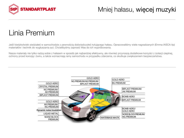 Mniej hałasu, więcej muzyki Linia Premium Jeśli kiedykolwiek siedziałeś w samochodzie z pewnością doświadczyłeś irytującego hałasu. Opracowaliśmy wiele nagradzanych (Emma IASCA itp) materiałów i technik do wygłuszania aut. Chcielibyśmy zaprosić Was do ich wypróbowania. Nasze materiały nie tylko radzą sobie z hałasem w sposób jak najbardziej efektywny, ale również przynoszą dodatkowe korzyści z izolacji cieplnej, ochrony przed korozją i żwiru, a także wzmacniają ramy samochodu w przypadku zderzenia, co skutkuje zwiększeniem bezpieczeństwa. Mniej hałasu, więcej muzyki MATY WYGŁUSZAJĄCE I PIANKI Nazwa/ Cena Zdjęcie Opis BOMB AERO 699 ZŁ Wielowarstwowy materiał tłumiący drgania, z powłoką polimerową na bazie kauczuku butylowego, bitumicznej masy uszczelniającej, folii aluminiowej zewnętrznej powierzchni. Opakowanie/ w opakowaniu Dodatkowe informacje Grubość = 4.2 mm 1,99 m2 5 arkuszy 53x75 cm Nadaje się do: Pokrywy bagażnika, nadkoli, grodzi i podłogi. Grubość = 2,3 mm GOLD AERO 949 ZŁ NG 04 PREMIUM 399 ZŁ Bardzo elastyczny materiał wielowarstwowy, z warstwy polimerowej na bazie kauczuku butylowego oraz folii zewnętrznej powierzchni. 3,98 m2 10 arkuszy 53x75 cm Izolator ciepła. Pianka bardzo elastyczna i trwała, posiada wysokie 3,00 m2 właściwości akustyczne oraz izolacyjne, nie wchłania wilgoci tworzy 4 arkusze 100x75 cm barierę termo-akustyczną, doskonale pochłania hałas. Nadaje się do: Drzwi, dachu, pokrywy bagażnika, deski rozdzielczej, pokrywy silnika, grodzi, podłogi. Grubość = 4,0 mm Nadaje się do: Drzwi i dachu. Mniej hałasu, więcej muzyki PIANKI WYGŁUSZAJĄCE Nazwa/ Cena Zdjęcie NG 08 PREMIUM 429 ZŁ Opis Opakowanie/ w opakowaniu Izolator ciepła. Pianka bardzo elastyczna i trwała, posiada wysokie 3,00 m2 właściwości akustyczne oraz izolacyjne, nie wchłania wilgoci tworzy 4 arkusze 100x75 cm barierę termo-akustyczną, doskonale pochłania hałas. Dodatkowe informacje Grubość = 8,0 mm Nadaje się do: Drzwi, podłogi i podłogi bagażnika. Grubość = 2,3 mm AK 04 PREMIUM 469 ZŁ Bardzo dobry materiał izolacji 3,0 m2 akustycznej w miejscach, które są narażone na wilgoć, zapewnia również 4 arkusze 100x75 cm izolację cieplną. BG 10 PREMIUM 559 ZŁ Materiał absorbujący dźwięk, który jest specjalnie zaprojektowany, aby wytrzymać wysokie temperatury, jest idealnym zastosowaniem w komorze silnika. Nadaje się do: Drzwi, dachu i pokrywy silnika. Grubość = 10.0 mm 2,24 m2 2 arkusze 140x80 cm Nadaje się do: Pokrywy silnika. Mniej hałasu, więcej muzyki PIANKI WYGŁUSZAJĄCE Nazwa/ Cena Zdjęcie Opis Opakowanie/ w opakowaniu Dodatkowe informacje Materiał absorbujący dźwięk, który jest specjalnie zaprojektowany, aby wytrzymać wysokie temperatury, jest idealnym zastosowaniem w komorze silnika. 1.12 m2 1 arkusz 140x80 cm BIPLAST 10C PREMIUM 549 ZŁ Uformowana powierzchnia tego materiału jest specjalnie zaprojektowana, aby zmaksymalizować pochłanianie dźwięku oraz wibracji. 3,00 m2 4 arkusze 100x75 cm Nadaje się do: Drzwi, dachu, tapicerki drzwiowej. NOISEBLOCK PREMIUM 369 ZŁ Bardzo skuteczny materiał izolacyjny dźwięku. Powierzchni tego materiału jest specjalnie zaprojektowany, aby ułatwić proces instalacji i upewnić się, że jest mocno przylega do powierzchni. 1,19 m2 3 arkusze 53x75 cm Nadaje się do: Podłogi. BG 20 PREMIUM 359 ZŁ Grubość = 20.0 mm Nadaje się do: Pokrywy silnika. Mniej hałasu, więcej muzyki HYBRYDY Nazwa/ Cena Zdjęcie CRYSTAL 149 ZŁ Opis Soczewka akustyczna zapewnia 3 korzyści: • Tłumienie drgań przestrzeni wewnątrz drzwi • Pochłanianie dźwięku wewnątrz drzwi • Rozpraszanie zakłóceń fal głośników Opakowanie/ w opakowaniu 2 sztuki 2 arkusze sześciokątne ~19x22 cm Dodatkowe informacje Grubość = 15.0 mm Nadaje się do: Za głośnikami. Dystrybucja w Polsce: Bariera Dźwięku ul. Sarabandy 61 02-868 Warszawa tel. 22 644 40 70 *Podane ceny są cenami detalicznymi brutto