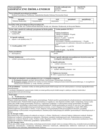 Nazwa przedmiotu Termin realizacji (rok, semestr) IV rok/ 7 semestr GEOFIZYCZNE ŹRÓDŁA ENERGII Kod ECTS 6.10-GZE Nazwa jednostki prowadzącej przedmiot Wydział Przyrodniczo-Techniczny/ Samodzielna Katedra Ochrony Powierzchni Ziemi Studia kierunek Ochrona Środowiska stopień I (inżynierskie) tryb stacjonarne specjalność ----- specjalizacja ----- Nazwisko osoby prowadzącej (osób prowadzących) Prof. zw. dr hab. inż. Czesława Rosik-Dulewska, Dr hab. inż. Mirosław Wiatkowski, dr Krzysztof Badora Formy zajęć, sposób ich realizacji i przypisana im liczba godzin • A. Formy zajęć wykład (W), • B. Sposób realizacji zajęcia w sali dydaktycznej: W C. Liczba godzin: 30W Liczba punktów ECTS: 2 Godziny kontaktowe - udział w wykładach: 30 godz. Konsultacje: 1godz. Razem: 31 godz. = 1p.ECTS Praca własna studenta - korzystanie z literatury przedmiotowej: = 10 godz. - przygotowanie do zaliczenia i obecność na zaliczeniu: 20 godz. Razem 30 godz. = 1 p.ECTS Status przedmiotu • obowiązkowy Suma: 61 godz. – 2 p. ECTS Język wykładowy polski Metody dydaktyczne • wykład z prezentacją multimedialną Forma i sposób zaliczenia oraz podstawowe kryteria oceny lub wymagania egzaminacyjne A. Sposób zaliczenia • wykład: zaliczenie z oceną B. Formy zaliczenia • wykład: zaliczenie pisemne - test C. Podstawowe kryteria W: 50%+1 poprawnych odpowiedzi Określenie przedmiotów wprowadzających wraz z wymogami wstępnymi A. Wymagania formalne: geologia, geomorfologia, meteorologia i klimatologia, hydrologia B. Wymagania wstępne: podstawowa wiedza na temat struktury i funkcjonowania środowiska przyrodniczego, w szczególności abiotycznych elementów, tj. wody, litosfery, powietrza. Cele przedmiotu: - uzyskanie wiedzy na temat geofizycznych źródeł energii oraz ich wykorzystania w rozwoju zagospodarowania przestrzennego - uzyskanie umiejętności zastosowania wiedzy na temat geofizycznych źródeł energii w praktyce ochrony środowiska i zagospodarowania przestrzennego Treść zajęć: A. Problematyka wykładu: Cz I. Energia geotermalna Pojęcie energii geotermalnej. Schemat złoża geotermalnego. Podział zasobów geotermalnych na hydrotermiczne i petrochemiczne oraz ich charakterystyka. Podział źródeł energii geotermalnej ze względu na: stan skupienia nośnika ciepła i temperaturę. Gorące suche skały jako źródło energii geotermalnej. Pozytywy i zagrożenia wynikające z wykorzystania energii geotermalnej. Przykłady bezpośredniego i pośredniego wykorzystania wód geotermalnych. Energia geotermalna na świecie (w tym m.in. moc elektryczna zainstalowana w elektrociepłowniach geotermalnych na świecie, w tym w krajach Unii Europejskiej w latach 2005-2006). Elektrociepłownie geotermalne w Polsce, w tym: objętości wód geotermalnych dla poszczególnych obszarów, przykłady bezpośredniego wykorzystania wód geotermalnych, charakterystyka funkcjonujących zakładów geotermalnych i balneologicznych w Polsce Cz II. Energia wodna Rys historyczny wykorzystania sił wodnych na świecie i w Polsce. Możliwości i celowość budowy elektrowni wodnych. Rodzaje elektrowni wodnych i ich podstawowe parametry. Określenie warunków hydrologicznych rzek. Hydrotechniczne rozwiązania elektrowni wodnych. Budowle wodne. Turbiny wodne. Regulatory turbin wodnych. Pomocnicze wyposażenie mechaniczne. Rola elektrowni wodnych w środowisku, gospodarce i społeczeństwie. Cz III. Energia wiatru Wiatr jako źródło energii odnawialnej, technologie przetwarzania energii wiatru na energię elektryczną, uwarunkowania przyrodnicze, społeczne, ekonomiczne i techniczne lokalizacji elektrowni wiatrowych, oddziaływanie elektrowni wiatrowych na środowisko przyrodnicze oraz człowieka, mikroelektrownie wiatrowe. Wykaz literatury 1. Allen P.A. Procesy kształtujące powierzchnię ziemi. PWN, Warszawa 2000. 2. Bajkiewicz-Grabowska E., Mikulski Z.: Hydrologia Ogólna. PWN, Warszawa 2006 r. 3. Boczar T., 2008, Energetyka wiatrowa, aktualne możliwości wykorzystania. Wyd. II. Arkady. 4. Byczkowski A.: Hydrologia, t. I, II, Wyd. SGGW, 1996 r., 5. Gałka E.: Turbiny Banki – Michella, Instytut Maszyn Przepływowych PAN, Gdańsk, 1990 6. Gmula S., Knapp T., Strzelczyk P. Szczerba Z., 2006. Energetyka wiatrowa. AGH Kraków. 7. Gołębiowski S., Krzemień Z.: Przewodnik inwestora małej elektrowni wodnej, Warszawa, 1998. 8. Hoffmann M.: Małe elektrownie wodne – poradnik, Wydanie II, Towarzystwo Rozwoju Małych Elektrowni Wodnych, Gdańsk 1992. 9. Kapuściński J. i inni.:” Zasady i metodyka dokumentowania zasobów wód termalnych i energii geotermalnej oraz sposoby odprowadzania wód zużytych – poradnik metodyczny” Ministerstwo Ochrony Środowiska Zasobów Naturalnych i Leśnictwa, Warszawa 1997 10. Kapuściński J., Rodzoch A.: „Geotermia Niskotemperaturowa w Polsce i na Świecie” Stan aktualny i perspektywy rozwoju. Uwarunkowania techniczne, środowiskowe i ekonomiczne. Ministerstwo Środowiska Warszawa, 2010. 11. Krzyżanowski W. (i inni): Turbiny rurowe o uproszczonej konstrukcji, Instytut Maszyn Przepływowych PAN, Gdańsk, 1990 12. Lubośny Z., 2009, Farmy wiatrowe w systemie elektroenergetycznym. WNT Warszawa. 13. Łojek A., Okonek A.: Turbiny śmigłowe lewarowe poziome, Instytut Maszyn Przepływowych PAN, Gdańsk, 1990 14. Łojek A., Okonek A.: Turbiny śmigłowe zunifikowane, Instytut Maszyn Przepływowych PAN, Gdańsk, 1990 15. Materiały Konferencyjne Ogólnopolskiego Forum Odnawialnych Źródeł Energii, Sekcja: Mała Energetyka Wodna, lata 1997 – 2002, Kielce, Kraków. 16. Michałowski S., Plutecki J.: Energetyka wodna, Wydawnictwo Naukowo – Techniczne, Warszawa 1975 17. Mikulski Z. Gospodarka wodna. Wydawnictwo Naukowe PWN, Warszawa 1998 r. 18. Mizerski W., 2003, Geologia dynamiczna dla geografów. PWN, Warszawa. 19. Ozga-Zielińska M., Brzeziński J. Hydrologia stosowana. PWN, Warszawa 1997 r., 20. Rosik-Dulewska Cz.: „Rola Niekonwencjonalnych Źródeł En