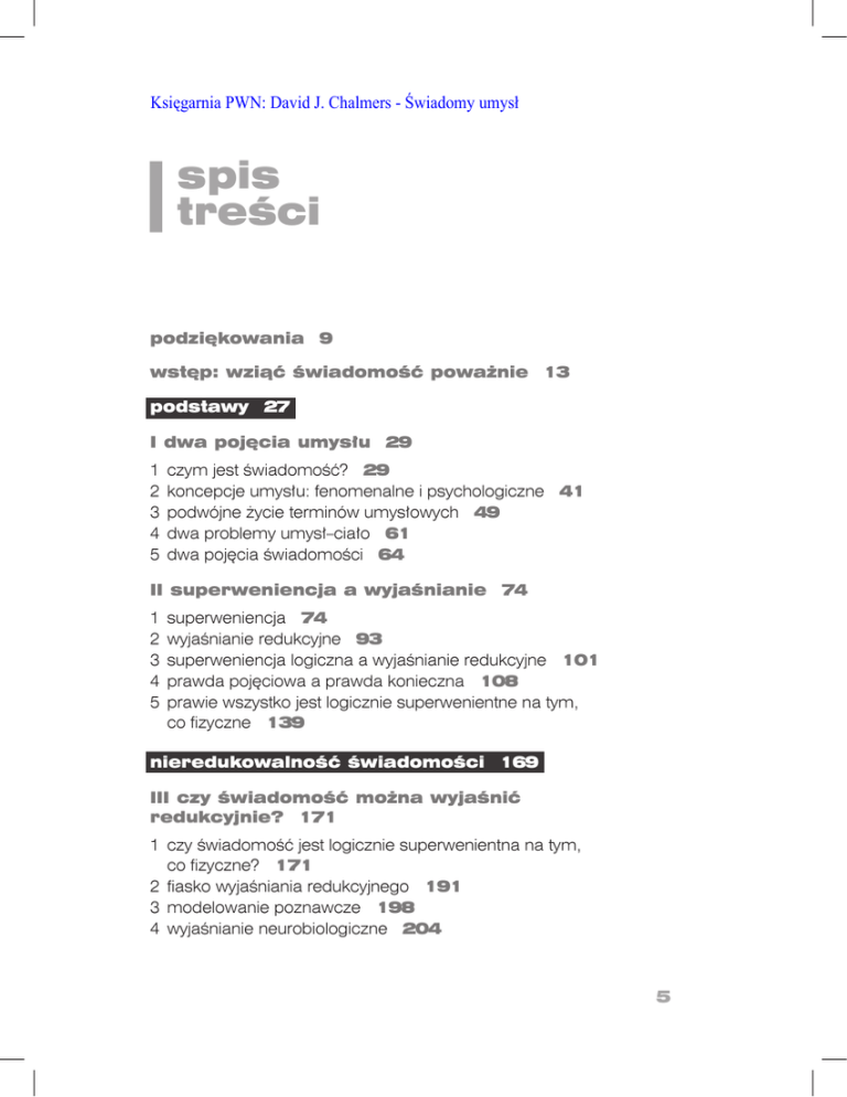 36 PM Księgarnia PWN: David J. Chalmers - Świadomy umysł spis treści podziękowania 9 wstęp: wziąć świadomość poważnie 13 podstawy 27 I dwa pojęcia umysłu 29 1 czym jest świadomość? 29 2 koncepcje umysłu: fenomenalne i psychologiczne 41 3 podwójne życie terminów umysłowych 49 4 dwa problemy umysł–ciało 61 5 dwa pojęcia świadomości 64 II superweniencja a wyjaśnianie 74 1 superweniencja 74 2 wyjaśnianie redukcyjne 93 3 superweniencja logiczna a wyjaśnianie redukcyjne 101 4 prawda pojęciowa a prawda konieczna 108 5 prawie wszystko jest logicznie superwenientne na tym, co fizyczne 139 nieredukowalność świadomości 169 III czy świadomość można wyjaśnić redukcyjnie? 171 1 czy świadomość jest logicznie superwenientna na tym, co fizyczne? 171 2 fiasko wyjaśniania redukcyjnego 191 3 modelowanie poznawcze 198 4 wyjaśnianie neurobiologiczne 204 5 spis treści 5 odwołanie do nowej fizyki 209 6 wyjaśnianie ewolucyjne 212 7 quo vadis, wyjaśnienie redukcyjne? 213 IV dualizm naturalistyczny 216 1 argument przeciwko materializmowi 216 2 zarzuty oparte na konieczności a posteriori 228 3 inne argumenty za dualizmem 243 4 czy to epifenomenalizm? 260 5 geografia logiczna problematyki 277 6 refleksje na temat dualizmu naturalistycznego 293 V paradoks sądu fenomenalnego 298 1 świadomość i poznanie 298 2 paradoks sądu fenomenalnego 304 3 o wyjaśnianiu sądów fenomenalnych 316 4 argumenty przeciwko nieistotności eksplanacyjnej 326 5 argument z samowiedzy 327 6 argument z pamięci 340 7 argument z odniesienia 342 w stronę teorii świadomości 355 VI spójność między świadomością i poznaniem 357 1 w stronę teorii nieredukcyjnej 357 2 zasady spójności 364 3 więcej o pojęciu przytomności 375 4 eksplanacyjna rola zasad spójności 390 5 spójność jako prawo psychofizyczne 404 VII nieobecne qualia, blaknące qualia, tańczące qualia 411 1 zasada niezmienności organizacyjnej 411 2 nieobecne qualia 417 3 blaknące qualia 420 6 spis treści 4 odwrócone qualia 435 5 tańczące qualia 441 6 funkcjonalizm nieredukcyjny 453 VIII świadomość i informacja: kilka spekulacji 456 1 w stronę teorii fundamentalnej 456 2 aspekty informacji 458 3 argumenty na rzecz teorii 472 4 czy przeżycia są wszechobecne? 780 5 metafizyka informacji 493 6 pytania otwarte 504 zastosowania 509 IX mocna sztuczna inteligencja 511 1 świadomość maszynowa 511 2 o implementacji obliczeń 515 3 w obronie mocnej AI 522 4 chiński pokój i inne zarzuty 525 5 zarzuty zewnętrzne 535 6 wnioski 540 X interpretacja mechaniki kwantowej 542 1 dwie tajemnice 542 2 ramy mechaniki kwantowej 543 3 interpretacje mechaniki kwantowej 548 4 interpretacja Everetta 561 5 zarzuty wobec interpretacji Everetta 568 6 wnioski 575 bibliografia 579 indeks nazwisk 595 indeks pojęć 601 7