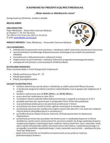 II KONKURS NA PREZENTACJĘ MULTIMEDIALNĄ „ Moje miasto w obiektywie czasu” Zasięg imprezy/działania: konkurs miejski REGULAMIN ORGANIZATOR: Pałac Młodzieży – Pomorskie Centrum Edukacji al. Piastów 7, 70-327 Szczecin Tel. (091) 4 22 52 61, fax. (091) 4 22 52 62 E-mail: [email protected] MIEJSCE IMPREZY: Pałac Młodzieży – Pomorskie Centrum Edukacji CELE KONKURSU: pobudzanie kreatywności twórczej dzieci i młodzieży szkół i placówek oświatowych Szczecina upowszechnianie świadomego dokumentowania zmieniającej się wokół rzeczywistości miejskiej wyszukiwanie i dokumentowanie ciekawych miejsc inspirowanie do powstawania i realizacji ciekawych programów promujących miasto umiejętność korzystania z nowoczesnych źródeł przekazu KATEGORIE WIEKOWE: Prace oceniane będą w trzech kategoriach wiekowych: Szkoły podstawowe klasy IV – VI Szkoły gimnazjalne Szkoły ponadgimnazjalne ZASADY UCZESTNICTWA: konkurs skierowany jest do dzieci i młodzieży ze szkół i placówek Miasta Szczecin w konkursie mogą brać udział uczestnicy indywidualnie oraz w grupie (nie większej niż 3 osoby) konkurs realizowany jest od 8.01.2016 r. do 30.03.2016 r. praca musi być wykonana w roku 2016 na konkurs można nadesłać tylko jedną prezentację ( oryginał oraz kopię na 2 CD ) projekty powinny być opracowane w programie Power Point lub podobnym czas prezentacji jednej pracy nie powinien przekraczać 3 minut prezentacja nie może zawierać treści ogólnie uważanych za nieobyczajne prezentacja powinna być oznakowana logiem autora lub autorów ( nie może być żadnych innych danych identyfikacyjnych w prezentacji ) po konkursie prace będą zwracane autorom, ale kopia pozostanie do dyspozycji Organizatora prezentacje powinny być przesłane lub dostarczone w zamkniętej kopercie w której dodatkowo, oprócz pracy autora/autorów, powinna znaleźć się druga zamknięta koperta oznakowana logiem i zawierająca dane osobowe twórcy/twórców: imię i nazwisko, wiek, adres szkoły lub placówki telefon lub email autora lub rodzica / opiekuna prawnego ( w przypadku uczestnika niepełnoletniego ), imię i nazwisko nauczyciela – opiekuna do prac musi być dołączona: - zgoda autora/autorów na bezpłatne prezentowanie pracy podczas imprezy podsumowującej konkurs - OCENA: oświadczenie, że autor /autorzy są wyłącznymi właścicielami prezentacji i jej zawartości merytorycznej (w przypadku uczestnika niepełnoletniego zgodę i oświadczenie podpisują jego rodzice / opiekunowie prawni )* Organizator powoła jury złożone z doświadczonych artystów fotografików, plastyków oraz przewodników turystycznych pracujących z dziećmi i młodzieżą Jury oceniać będzie: 1. zgodność tematu prezentacji z tematem przewodnim konkursu 2. zawartość merytoryczną prezentacji 3. wkład pracy własnej autora / autorów ( minimum 80 % własnego materiału graficznego i opisowego ) 4. układ graficzny prezentacji 5. wykorzystane źródła wiedzy 6. estetyka pracy NAGRODY: Jury przyzna we wszystkich kategoriach po trzy równorzędne nagrody i trzy wyróżnienia. Wszyscy autorzy prezentacji otrzymają dyplomy uczestnictwa Laureaci i wyróżnieni autorzy otrzymają nagrody rzeczowe. Laureaci i wyróżnieni autorzy prezentacji zostaną poinformowani o miejscu i czasie odebrania nagród i wyróżnień oraz o prezentacji pokonkursowej drogą e-mailową lub telefoniczną. TERMINY I MIEJSCE: Prace należy dostarczyć osobiście lub drogą pocztową w nieprzekraczalnym terminie do 30.03.2016 r. do godz. 14.00. Prace, które wpłyną po tym terminie nie będą rozpatrywane. Wyniki konkursu ukażą się do dnia 4.04.2016 r. na stronie internetowej Pałacu Młodzieży – www.palac.szczecin.pl Uroczyste wręczenie nagród, wyróżnień i dyplomów oraz prezentacja najlepszych prac nastąpi dnia 7.04.2016 r. w Pałacu Młodzieży PCE w Szczecinie podczas Gali Ogólnopolskiego Młodzieżowego Turnieju Turystyczno-Krajoznawczego. UWAGI KOŃCOWE: Prace należy przesłać lub dostarczyć na adres: sekretariat Pałacu Młodzieży – PCE lub Pracownia Turystyczno-Ekologiczna ( sala 202 ) al. Piastów 7, 70-327 Szczecin informacje: tel. (091) 4 22 52 61, fax. (091) 4 22 52 62 Prace – oryginały na CD będzie można odebrać u Organizatora do 30.06.2016 r., w godzinach pracy nauczycieli Pracowni Turystyczno Ekologicznej Pałacu Młodzieży PCE w Szczecinie, w sali 202. Zgodnie z art. 23 ust. 1 pkt. 1 ustawy z 29.08.1997 r. o ochronie danych osobowych (Dz. U. Nr 133, poz. 883 z późn. zm.) dane osobowe zawarte w karcie zgłoszenia wykorzystywane będą jedynie do celów statutowych Pałacu Młodzieży – PCE w Szczecinie. Zgłoszenie na konkurs, jest jednoznaczne z wyrażeniem zgody na publikację zdjęć uczestników na stronie internetowej oraz w publikacjach i folderach Pałacu Młodzieży. Niniejsza zgoda dotyczy wyłącznie publikacji w celach niekomercyjnych.