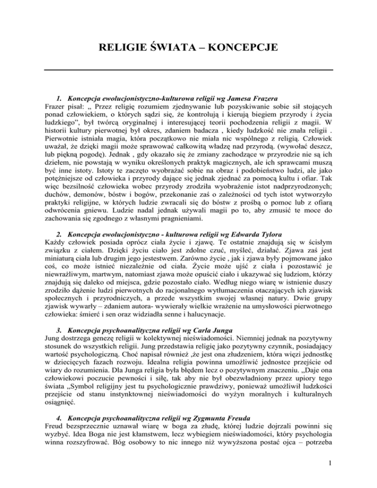 RELIGIE ŚWIATA – KONCEPCJE 1. Koncepcja ewolucjonistyczno-kulturowa religii wg Jamesa Frazera Frazer pisał: „ Przez religię rozumiem zjednywanie lub pozyskiwanie sobie sił stojących ponad człowiekiem, o których sądzi się, Ŝe kontrolują i kierują biegiem przyrody i Ŝycia ludzkiego”, był twórcą oryginalnej i interesującej teorii pochodzenia religii z magii. W historii kultury pierwotnej był okres, zdaniem badacza , kiedy ludzkość nie znała religii . Pierwotnie istniała magia, która początkowo nie miała nic wspólnego z religią. Człowiek uwaŜał, Ŝe dzięki magii moŜe sprawować całkowitą władzę nad przyrodą. (wywołać deszcz, lub piękną pogodę). Jednak , gdy okazało się Ŝe zmiany zachodzące w przyrodzie nie są ich dziełem, nie powstają w wyniku określonych praktyk magicznych, ale ich sprawcami muszą być inne istoty. Istoty te zaczęto wyobraŜać sobie na obraz i podobieństwo ludzi, ale jako potęŜniejsze od człowieka i przyrody dające się jednak zjednać za pomocą kultu i ofiar. Tak więc bezsilność człowieka wobec przyrody zrodziła wyobraŜenie istot nadprzyrodzonych; duchów, demonów, bóstw i bogów, przekonanie zaś o zaleŜności od tych istot wytworzyło praktyki religijne, w których ludzie zwracali się do bóstw z prośbą o pomoc lub z ofiarą odwrócenia gniewu. Ludzie nadal jednak uŜywali magii po to, aby zmusić te moce do zachowania się zgodnego z własnymi pragnieniami. 2. Koncepcja ewolucjonistyczno - kulturowa religii wg Edwarda Tylora KaŜdy człowiek posiada oprócz ciała Ŝycie i zjawę. Te ostatnie znajdują się w ścisłym związku z ciałem. Dzięki Ŝyciu ciało jest zdolne czuć, myśleć, działać. Zjawa zaś jest miniaturą ciała lub drugim jego jestestwem. Zarówno Ŝycie , jak i zjawa były pojmowane jako coś, co moŜe istnieć niezaleŜnie od ciała. śycie moŜe ujść z ciała i pozostawić je niewraŜliwym, martwym, natomiast zjawa moŜe opuścić ciało i ukazywać się ludziom, którzy znajdują się daleko od miejsca, gdzie pozostało ciało. Według niego wiarę w istnienie duszy zrodziło dąŜenie ludzi pierwotnych do racjonalnego wytłumaczenia otaczających ich zjawisk społecznych i przyrodniczych, a przede wszystkim swojej własnej natury. Dwie grupy zjawisk wywarły – zdaniem autora- wywierały wielkie wraŜenie na umysłowości pierwotnego człowieka: śmierć i sen oraz widziadła senne i halucynacje. 3. Koncepcja psychoanalityczna religii wg Carla Junga Jung dostrzega genezę religii w kolektywnej nieświadomości. Niemniej jednak na pozytywny stosunek do wszystkich religii. Jung przedstawia religię jako pozytywny czynnik, posiadający wartość psychologiczną. Choć napisał równieŜ ,Ŝe jest ona złudzeniem, która więzi jednostkę w dziecięcych fazach rozwoju. Idealna religia powinna umoŜliwić jednostce przejście od wiary do rozumienia. Dla Junga religia była błędem lecz o pozytywnym znaczeniu. „Daje ona człowiekowi poczucie pewności i siłę, tak aby nie był obezwładniony przez upiory tego świata „Symbol religijny jest tu psychologicznie prawdziwy, poniewaŜ umoŜliwił ludzkości przejście od stanu instynktownej nieświadomości do wyŜyn moralnych i kulturalnych osiągnięć. 4. Koncepcja psychoanalityczna religii wg Zygmunta Freuda Freud bezsprzecznie uznawał wiarę w boga za złudę, której ludzie dojrzali powinni się wyzbyć. Idea Boga nie jest kłamstwem, lecz wybiegiem nieświadomości, który psychologia winna rozszyfrować. Bóg osobowy to nic innego niŜ wywyŜszona postać ojca – potrzeba 1 takiego bóstwa bierze się z dziecięcych tęsknot za potęŜnym, opiekuńczym ojcem. Porównuje on wiarę do choroby psychicznej, nazywał ja kolektywną neurozą. Dlatego teŜ religia spełnia negatywną rolę w Ŝyciu ludzkim, gdyŜ poddaje człowieka pod władzę sił fikcyjnych. 5. Koncepcja socjologiczna religii wg Emila Durkheima Religia jest głównym czynnikiem integrującym grupę społeczną. Funkcję integracyjną pełni ona przez wspólne wierzenia i obrzędy. Ułatwia teŜ dyscyplinę grupy. Ostatecznym źródłem religii jest społeczeństwo, przedmiot religii (sacrum) jest jedynie symbolem mocy społecznej. Rozpatrywał religię jako zjawisko społeczne, jako fakt kulturowy, jako pierwotny i elementarny przejaw Ŝycia społecznego, będący zarazem czynnikiem konstruktywnym. Przez religię dokonuje się socjalizacja człowieka. Zjawisko religii definiuje Durkhein następująco: ,,Wszelka religia jest systemem solidarnych wierzeń i praktyk odnośnie do rzeczy świętych ... wierzeń i praktyk łączących w jedną wspólnotę moralną zwaną Kościołem, tych , którzy do niej naleŜą” Tworząc socjologiczną koncepcję religii E. Durkheim oparł się głównie na materiale obrazującym wierzenia totemistyczne ludów Australii. Po pierwsze, uwaŜany za przodka rodu totem - jako symbol grupy- ma charakter,, wyobraŜenia zbiorowego”, stanowił przykład społecznego, grupowego wyobraŜenia ,,rzeczy świętej”. Z tego wyobraŜenia wyłonił się kult duchów zmarłych przodków, bóstw, aŜ wreszcie Boga. Po drugie – jako fakt wskazujący na społeczną genezę religii było oŜywianie się Ŝycia religijnego Australijczyków w okresach „schodzenia się” całego plemienia lub rodu, aby dokonać wspólnych obrzędów (w potrzebach). Dla Durkheima człowiek pozostaje wobec bóstwa na stopie bezwzględnej równości: zaleŜy od nich, ale oni teŜ w pewnym sensie zaleŜą od niego. potrzebuje ich pomocy, ale oni potrzebują jego ofiar. 6. Koncepcja socjologiczna religii wg Maxa Webera Religia jest głównym czynnikiem integrującym grupę społeczną. Funkcję integracyjną pełni ona przez wspólne wierzenia i obrzędy. Ułatwia teŜ dyscyplinę grupy. Ostatecznym źródłem religii jest społeczeństwo, przedmiot religii (sacrum) jest jedynie symbolem mocy społecznej. Dokonał systematyzacji pojęć religijnych. Int