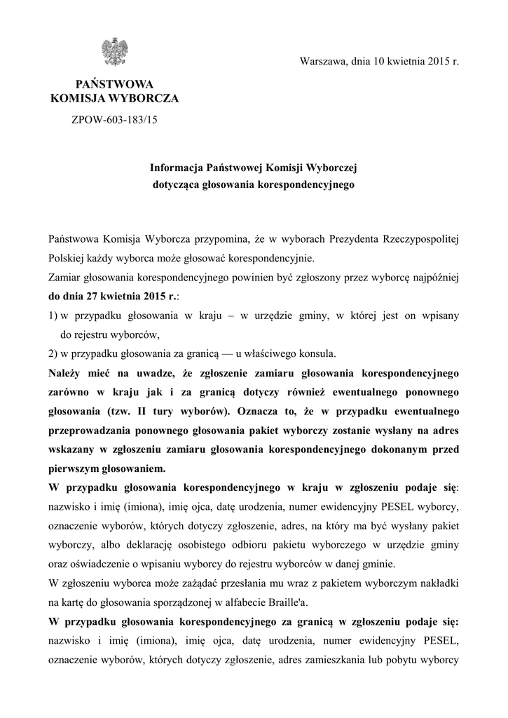 Warszawa, dnia 10 kwietnia 2015 r. PAŃSTWOWA KOMISJA WYBORCZA ZPOW-603-183/15 Informacja Państwowej Komisji Wyborczej dotycząca głosowania korespondencyjnego Państwowa Komisja Wyborcza przypomina, że w wyborach Prezydenta Rzeczypospolitej Polskiej każdy wyborca może głosować korespondencyjnie. Zamiar głosowania korespondencyjnego powinien być zgłoszony przez wyborcę najpóźniej do dnia 27 kwietnia 2015 r.: 1) w przypadku głosowania w kraju – w urzędzie gminy, w której jest on wpisany do rejestru wyborców, 2) w przypadku głosowania za granicą — u właściwego konsula. Należy mieć na uwadze, że zgłoszenie zamiaru głosowania korespondencyjnego zarówno w kraju jak i za granicą dotyczy również ewentualnego ponownego głosowania (tzw. II tury wyborów). Oznacza to, że w przypadku ewentualnego przeprowadzania ponownego głosowania pakiet wyborczy zostanie wysłany na adres wskazany w zgłoszeniu zamiaru głosowania korespondencyjnego dokonanym przed pierwszym głosowaniem. W przypadku głosowania korespondencyjnego w kraju w zgłoszeniu podaje się: nazwisko i imię (imiona), imię ojca, datę urodzenia, numer ewidencyjny PESEL wyborcy, oznaczenie wyborów, których dotyczy zgłoszenie, adres, na który ma być wysłany pakiet wyborczy, albo deklarację osobistego odbioru pakietu wyborczego w urzędzie gminy oraz oświadczenie o wpisaniu wyborcy do rejestru wyborców w danej gminie. W zgłoszeniu wyborca może zażądać przesłania mu wraz z pakietem wyborczym nakładki na kartę do głosowania sporządzonej w alfabecie Braille'a. W przypadku głosowania korespondencyjnego za granicą w zgłoszeniu podaje się: nazwisko i imię (imiona), imię ojca, datę urodzenia, numer ewidencyjny PESEL, oznaczenie wyborów, których dotyczy zgłoszenie, adres zamieszkania lub pobytu wyborcy -2za granicą, adres zamieszkania wyborcy w kraju, tj. miejsce ujęcia w rejestrze wyborców (w odniesieniu do osób przebywających czasowo za granicą), numer ważnego polskiego paszportu oraz miejsce i datę jego wydania (w państwach, w których dowód osobisty jest wystarczającym dokumentem do przekroczenia granicy, w miejsce numeru ważnego polskiego paszportu można podać numer ważnego dowodu osobistego), adres, pod który ma zostać wysłany przez konsula pakiet wyborczy, albo deklarację osobistego odbioru pakietu wyborczego u konsula. Wyborca głosujący w kraju nie później niż dnia 4 maja 2015 r. otrzyma z urzędu gminy pakiet wyborczy, który zostanie doręczony wyłącznie do rąk własnych wyborcy, po okazaniu dokumentu potwierdzającego tożsamość i pisemnym pokwitowaniu odbioru. Jeżeli wyborca we wniosku zadeklarował osobisty odbiór pakietu wyborczego, pakiet ten we wskazanym terminie będzie możliwy do odebrania w urzędzie gminy (w godzinach pracy urzędu). W skład pakietu wyborczego przekazywanego wyborcy wchodzą: koperta zwrotna, karta do głosowania, koperta na kartę do głosowania, oświadczenie o osobistym i tajnym oddaniu głosu na karcie do głosowania, instrukcja głosowania korespondencyjnego i ewentualnie nakładka na kartę do głosowania sporządzona w alfabecie Braille'a — jeżeli wyborca zażądał jej przesłania. Na karcie do głosowania wyborca oddaje głos, w sposób określony w informacji znajdującej się w dolnej części karty do głosowania. Należy pamiętać, że znakiem „x” są dwie linie przecinające się w obrębie kratki przeznaczonej na oddanie głosu. Po oddaniu głosu należy kartę do głosowania umieścić w kopercie oznaczonej „Koperta na kartę do głosowania” i kopertę tę zakleić. Niezaklejenie koperty na kartę do głosowania spowoduje, że karta do głosowania nie będzie uwzględniona przy ustalaniu wyników głosowania. Zaklejoną kopertę na kartę do głosowania należy włożyć do koperty zwrotnej zaadresowanej na adres obwodowej komisji wyborczej. Do koperty zwrotnej należy także włożyć oświadczenie o osobistym i tajnym oddaniu głosu. Przed włożeniem oświadczenia do koperty zwrotnej należy wpisać na nim miejscowość i datę jego sporządzenia oraz własnoręcznie je podpisać. Niewłożenie oświadczenia do koperty zwrotnej lub niepodpisanie go spowoduje, że karta do głosowania nie będzie uwzględniona przy ustalaniu wyników głosowania. Kopertę zwrotną należy zakleić i nadać w placówce Poczty Polskiej na adres obwodowej komisji wyborczej najpóźniej: -3 do 7 maja 2015 r., jeżeli placówka pocztowa znajduje się w gminie, w której wyborca jest ujęty w spisie wyborców, do 6 maja 2015 r. w dowolnej placówce Poczty Polskiej na terenie kraju. Osoba niepełnosprawna może umówić się na odbiór koperty zwrotnej w miejscu i terminie przez nią wskazanym (np. w jej mieszkaniu). W przypadku, gdy odbioru ma dokonać pracownik Poczty Polskiej, należy umówić się z nim najpóźniej na dzień 7 maja 2015 r. Wyborca może przed dniem głosowania osobiście dostarczyć kopertę zwrotną do właściwego urzędu gminy (w godzinach pracy tego urzędu) lub w dniu głosowania, do czasu jego zakończenia, osobiście dostarczyć kopertę zwrotną do obwodowej komisji wyborczej, której adres znajduje się na kopercie zwrotnej. Głosować korespondencyjne nie mogą wyborcy umieszczeni w spisach wyborców w: obwodach głosowania utworzonych w zakładach opieki zdrowotnej, domach pomocy społecznej, zakładach karnych i aresztach śledczych oraz domach studenckich lub zespołach domów studenckich, a ponadto wyborcy, którzy udzielili pełnomocnictwa do głosowania. W przypadku głosowania korespondencyjnego za granicą właściwy konsul, nie później niż dnia 30 kwietnia 2015 r. przekazuje pakiet wyborczy na wskazany przez wyborcę adres przesyłką rejestrowaną w placówce operatora pocztowego świadczącego usługi powszechne albo w inny sposób umożliwiający stwierdzenie odbioru. Wyborca może także osobiście odebrać pakiet wyborczy w konsulacie, jeżeli zadeklarował to 