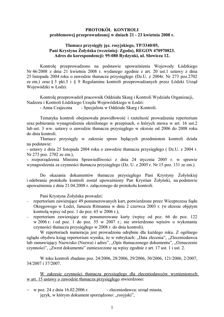 PROTOKÓŁ KONTROLI problemowej przeprowadzonej w dniach 21 - 23 kwietnia 2008 r. Tłumacz przysięgły jęz. rosyjskiego, TP/3340/05, Pani Krystyna Żołyńska (wcześniej: Zgoda), REGON 470970823. Adres do korespondencji: 95-080 Rydzynki, ul. Słowicza 12. Kontrolę przeprowadzono na podstawie upoważnienia Wojewody Łódzkiego Nr 46/2008 z dnia 21 kwietnia 2008 r. wydanego zgodnie z art. 20 ust.1 ustawy z dnia 25 listopada 2004 roku o zawodzie tłumacza przysięgłego (Dz.U. z 2004r. Nr 273 poz.2702 ze zm.) oraz § 3 pkt.3 i § 9 Regulaminu kontroli przeprowadzanych przez Łódzki Urząd Wojewódzki w Łodzi. Kontrolę przeprowadził pracownik Oddziału Skarg i Kontroli Wydziału Organizacji, Nadzoru i Kontroli Łódzkiego Urzędu Wojewódzkiego w Łodzi: - Anna Czajeczna - Specjalista w Oddziale Skarg i Kontroli. Tematyka kontroli obejmowała prawidłowość i rzetelność prowadzenia repertorium oraz pobierania wynagrodzenia określonego w przepisach, o których mowa w art. 16 ust.2 lub ust. 3 ww. ustawy o zawodzie tłumacza przysięgłego w okresie od 2006 do 2008 roku do dnia kontroli. Tłumacz przysięgły w zakresie spraw będących przedmiotem kontroli działa na podstawie: - ustawy z dnia 25 listopada 2004 roku o zawodzie tłumacza przysięgłego ( Dz.U. z 2004 r. Nr 273 poz. 2702 ze zm.), - rozporządzenia Ministra Sprawiedliwości z dnia 24 stycznia 2005 r. w sprawie wynagrodzenia za czynności tłumacza przysięgłego (Dz. U. z 2005 r. Nr 15 poz. 131 ze zm.). Do okazania dokumentów tłumacza przysięgłego Pani Krystyny Żołyńskiej i odebrania protokołu kontroli został upoważniony Pan Krystian Żołyński, na podstawie upoważnienia z dnia 21.04.2008 r. załączonego do protokołu kontroli. Pani Krystyna Żołyńska prowadzi: repertorium zawierające 49 ponumerowanych kart, potwierdzone przez Wiceprezesa Sądu Okręgowego w Łodzi, Janusza Ritmanna w dniu 2 czerwca 2003 r. (w okresie objętym kontrolą wpisy od poz. 1 do poz. 65 w 2006 r.), − repertorium zawierające nie ponumerowane karty (wpisy od poz. 66 do poz. 122 w 2006 r. i od poz. 1 do poz. 55 w 2007 r.; nie stwierdzono wpisów o wykonaniu czynności tłumacza przysięgłego w 2008 r. do dnia kontroli). W repertoriach numeracja jest prowadzona odrębnie dla każdego roku. Z ogólnego oglądu obydwu ksiąg repertorium wynika, że w rubrykach: „Data zlecenia”, „Zleceniodawca lub zamawiający Nazwisko (Nazwa) i adres”, „Opis tłumaczonego dokumentu”, „Oznaczenie czynności”, „Zwrot dokumentu” zamieszczone są wpisy zgodnie z art. 17 ust. 1 i ust. 2. − W toku kontroli zbadano poz. 24/2006, 28/2006, 29/2006, 30/2006, 121/2006, 2/2007, 34/2007 i 37/2007. W zakresie czynności tłumacza przysięgłego dla zleceniodawców wymienionych w art. 15 ustawy o zawodzie tłumacza przysięgłego stwierdzono: − w poz. 24 z dnia 16.02.2006 r. - zleceniodawca: urząd miasta, język, w którym dokument sporządzono: „rosyjski”, 1 uwagi o rodzaju treści, o formie i stanie dokumentu: „Stare pismo odręczne, b. słabo czytelne”, oznaczenie czynności: „tłumaczenie na język polski”, 2 strony, 1 egzemplarz, pobrane wynagrodzenie: „zł 57,50 (1,3 % x 1.769,26 x 125 % x 2 str.), − w poz. 28 z dnia 20.02.2006 r. - zleceniodawca: urząd miasta, język, w którym dokument sporządzono: „rosyjski”, uwagi o rodzaju treści, o formie i stanie dokumentu: „formularz drukowany”, oznaczenie czynności: „tłumaczenie na język polski”, 1 strona, 1 egzemplarz, pobrane wynagrodzenie: „zł 23,00 (1,3 % x 1.769,26”), w poz. 2 z dnia 05.01.2007 r. - zleceniodawca: urząd miasta, język, w którym dokument sporządzono: „rosyjski”, uwagi o rodzaju treści, o formie i stanie dokumentu: „Stare pismo odręczne, b. słabo czytelne”, oznaczenie czynności: „tłumaczenie na język polski”, 2 strony, 1 egzemplarz, pobrane wynagrodzenie: „zł 57,50 (1,3 % x 1.769,26 x 2 strony x 125 %), − w poz. 37 z dnia 11.05.2007 r. - zleceniodawca: urząd miasta, język, w którym dokument sporządzono: „rosyjski”, uwagi o rodzaju treści, o formie i stanie dokumentu: „stare pismo odręczne, b. słabo czytelne (1893 r.), oznaczenie czynności: „tłumaczenie na język polski”, 2 strony, 1 egzemplarz, pobrane wynagrodzenie: „zł 57,50 (1,3 % x 1.769,26 x 2 str x 125 %). − W zakresie czynności tłumacza przysięgłego dla zleceniodawcy niż wymienieni w art. 15 ustawy o zawodzie tłumacza przysięgłego stwierdzono: − w poz. 29 z dnia 23.02.2006 r. bez uwag, − w poz. 30 z dnia 23.02.2006 r. bez uwag, − w poz. 121 z dnia 27.12.2006 r. bez uwag, − w poz. 34 z dnia 17.04.2007 r. bez uwag. innego Na okazanych kopiach poświadczonych tłumaczeń wymieniona została pozycja, pod którą tłumaczenie jest odnotowane w repertorium oraz zawarte stwierdzenie: − w poz. 29/2006 - Ja, mgr Krystyna Zgoda, Tłumacz Przysięgły języka rosyjskiego, zaświadczam zgodność niniejszego tłumaczenia z okazanym mi dokumentem w języku rosyjskim, − w poz. 31/2006 - Ja, mgr Krystyna Zgoda, Tłumacz Przysięgły języka rosyjskiego, zaświadczam zgodność niniejszego tłumaczenia z okazanym mi dokumentem w języku rosyjskim, − w poz. 43/2006 - Ja, mgr Krystyna Zgoda, Tłumacz Przysięgły języka rosyjskiego zaświadczam zgodność niniejszego tłumaczenia z okazanym mi dokumentem w języku rosyjskim. 2 Pani Krystyna Żołyńska otrzymała pieczęć zgodną z wymogami art. 18 ust. 1 ustawy o zawodzie tłumacza przysięgłego i w dniu 23.04.2008 r. złożyła Wojewodzie Łódzkiemu odcisk tej pieczęci i wzór swojego podpisu (pieczęć nie była jeszcze używana do poświadczenia tłumaczenia). Dawna pieczęć została zwrócona w końcu 2008 r. Integralną część protokołu kontroli stanowią załączniki – kserokopie kart repertorium zawierających skontrolowane pozycje. Stosownie do § 21 ust.1 i 2 Regulaminu Kontroli przeprowadzanych przez Łódzki Urząd Wojewódzki w Łodzi, podmiotow