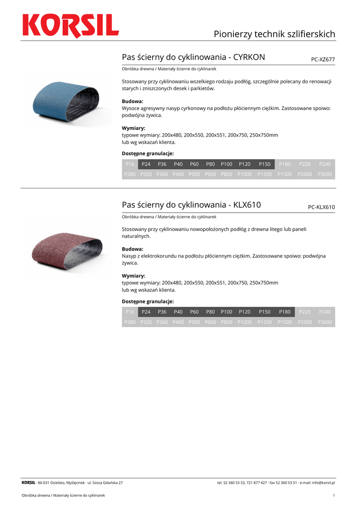 KORSIL Pionierzy technik szlifierskich Pas ścierny do cyklinowania - CYRKON PC-XZ677 Obróbka drewna / Materiały ścierne do cyklinarek Stosowany przy cyklinowaniu wszelkiego rodzaju podłóg, szczególnie polecany do renowacji starych i zniszczonych desek i parkietów. Budowa: Wysoce agresywny nasyp cyrkonowy na podłożu płóciennym ciężkim. Zastosowane spoiwo: podwójna żywica. Wymiary: typowe wymiary: 200x480, 200x550, 200x551, 200x750, 250x750mm lub wg wskazań klienta. Dostępne granulacje: P16 P24 P36 P40 P60 P80 P100 P120 P150 P180 P220 P240 P280 P320 P360 P400 P500 P600 P800 P1000 P1200 P1500 P2000 P3000 Pas ścierny do cyklinowania - KLX610 PC-KLX610 Obróbka drewna / Materiały ścierne do cyklinarek Stosowany przy cyklinowaniu nowopołożonych podłóg z drewna litego lub paneli naturalnych. Budowa: Nasyp z elektrokorundu na podłożu płóciennym ciężkim. Zastosowane spoiwo: podwójna żywica. Wymiary: typowe wymiary: 200x480, 200x550, 200x551, 200x750, 250x750mm lub wg wskazań klienta. Dostępne granulacje: P16 KORSIL · 86-031 Osielsko, Myślęcinek · ul. Szosa Gdańska 27 Obróbka drewna / Materiały ścierne do cyklinarek P24 P36 P40 P60 P80 P100 P120 P150 P180 P220 P240 P280 P320 P360 P400 P500 P600 P800 P1000 P1200 P1500 P2000 P3000 tel. 52 360 53 53, 721 877 427 · fax 52 360 53 51 · e-mail: [email protected] 1 KORSIL Pionierzy technik szlifierskich Płótno ścierne do cyklinowania z roli - CYRKON PC-ZR-XZ677 Obróbka drewna / Materiały ścierne do cyklinarek Stosowany przy cyklinowaniu wszelkiego rodzaju podłóg, szczególnie polecany do renowacji starych i zniszczonych desek i parkietów. Budowa: Wysoce agresywny nasyp cyrkonowy na podłożu płóciennym ciężkim. Zastosowane spoiwo: podwójna żywica. Wymiary: typowe szerokości: 200 i 250mm lub wg wskazań klienta (maksymalnie do szerokości 1350mm). Dostępne granulacje: P16 P24 P36 P40 P60 P80 P100 P120 P150 P180 P220 P240 P280 P320 P360 P400 P500 P600 P800 P1000 P1200 P1500 P2000 P3000 Pad do cyklinowania - CZERWONY PC-P-001 Obróbka drewna / Materiały ścierne do cyklinarek Stosowany na maszynach typu orbitalnego, do delikatnego szlifowania (szlif wykańczający, wycięcie włókien, zmatowienie powierzchni). Budowa: Włókna poliestrowe napylane materiałem ściernym. Wymiary: typowe średnice: 200, 250 i 405mm lub wg wskazań klienta. Dostępne twardości: coarse KORSIL · 86-031 Osielsko, Myślęcinek · ul. Szosa Gdańska 27 Obróbka drewna / Materiały ścierne do cyklinarek medium fine very fine super fine ultra fine tel. 52 360 53 53, 721 877 427 · fax 52 360 53 51 · e-mail: [email protected] 2 KORSIL Pionierzy technik szlifierskich Pad do cyklinowania - CZARNY PC-P-002 Obróbka drewna / Materiały ścierne do cyklinarek Stosowany na maszynach typu orbitalnego, do delikatnego szlifowania (szlif wykańczający, wycięcie włókien, zmatowienie powierzchni). Budowa: Włókna poliestrowe napylane materiałem ściernym. Wymiary: typowe średnice: 200, 250 i 405mm lub wg wskazań klienta. Dostępne granulacje: P16 P24 P36 P40 P60 P80 P100 P120 P150 P180 P220 P240 P280 P320 P360 P400 P500 P600 P800 P1000 P1200 P1500 P2000 P3000 Dostępne twardości: coarse medium fine very fine super fine ultra fine Pad do cyklinowania - BRĄZOWY PC-P-003 Obróbka drewna / Materiały ścierne do cyklinarek Stosowany na maszynach typu orbitalnego, do delikatnego szlifowania (szlif wykańczający, wycięcie włókien, zmatowienie powierzchni). Budowa: Włókna poliestrowe napylane materiałem ściernym. Wymiary: typowe średnice: 200, 250 i 405mm lub wg wskazań klienta. Dostępne granulacje: P16 P24 P36 P40 P60 P80 P100 P120 P150 P180 P220 P240 P280 P320 P360 P400 P500 P600 P800 P1000 P1200 P1500 P2000 P3000 Dostępne twardości: coarse KORSIL · 86-031 Osielsko, Myślęcinek · ul. Szosa Gdańska 27 Obróbka drewna / Materiały ścierne do cyklinarek medium fine very fine super fine ultra fine tel. 52 360 53 53, 721 877 427 · fax 52 360 53 51 · e-mail: [email protected] 3 KORSIL Pionierzy technik szlifierskich Pad do cyklinowania - NIEBIESKI PC-P-004 Obróbka drewna / Materiały ścierne do cyklinarek Stosowany na maszynach typu orbitalnego, do delikatnego szlifowania (szlif wykańczający, wycięcie włókien, zmatowienie powierzchni). Budowa: Włókna poliestrowe napylane materiałem ściernym. Wymiary: typowe średnice: 200, 250 i 405mm lub wg wskazań klienta. Dostępne granulacje: P16 P24 P36 P40 P60 P80 P100 P120 P150 P180 P220 P240 P280 P320 P360 P400 P500 P600 P800 P1000 P1200 P1500 P2000 P3000 Dostępne twardości: coarse medium fine very fine super fine ultra fine Pad do cyklinowania - BIAŁY PC-P-004 Obróbka drewna / Materiały ścierne do cyklinarek Stosowany do czyszczenia, wcierania wszelkiego typu olejów i wosków do ochrony drewna. Budowa: Włókna poliestrowe napylane talkiem. Materiał obojętny - bez zawartości materiału ściernego. Wymiary: typowe średnice: 200, 250 i 405mm lub wg wskazań klienta. Dostępne granulacje: P16 KORSIL · 86-031 Osielsko, Myślęcinek · ul. Szosa Gdańska 27 Obróbka drewna / Materiały ścierne do cyklinarek P24 P36 P40 P60 P80 P100 P120 P150 P180 P220 P240 P280 P320 P360 P400 P500 P600 P800 P1000 P1200 P1500 P2000 P3000 tel. 52 360 53 53, 721 877 427 · fax 52 360 53 51 · e-mail: [email protected] 4 KORSIL Pionierzy technik szlifierskich Pad do cyklinowania - papier ścierny PC-PS Obróbka drewna / Materiały ścierne do cyklinarek Stosowany do obróbki wykańczającej, delikatnego szlifowania na maszynach typu orbitalnego. Budowa: Nasyp elektrokorundu na podłożu papierowym typu F. Zastosowane spoiwo: podwójna żywica. Dwustronny. Wymiary: typowe średnice: 400 i 405mm lub wg wskazań klienta. Dostępne granulacje: P16 P24 P36 P40 P60 P80 P100 P120 P150 P180 P220 P240 P280 P320 P360 P400 P500 P600 P800 P1000 P1200 P1500 P2000 P3000 Krążek fibrowy - CYRKON PC-F-01 Obróbka drewna / Materiały ścierne do cyklinarek Stosowany przy cyklinowaniu ws
