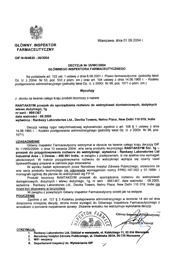 Warszawa, dnia 01.09.2004 r. G£ÓWNY INSPEKTOR FARMACEUTYCZNY GIF-N-N/4630 -36/2004 DECYZJA Nr 35/WC/2004 G£ÓWNEGO INSPEKTORA FARMACEUTYCZNEGO Na podstawie art. 122 ust. 1 ustawy z dnia 6.09.2001 r. Prawo farmaceutyczne Uednolity tekst Dz. U. z 2004r. Nr 53, poz. 533 z póŸno zm.) oraz art. 104 ustawy z dnia 14.06.1960 r. -Kodeks postêpowania administracyjnego Uednolity tekst Dz. U. z 2000r. Nr 98, poz. 1071 z póŸno zm.) Wycofujê z obrotu na terenie ca³ego kraju produkt leczniczy o nazwie RANTAKSYM proszek do sporz¹dzania roztworu do wstrzykiwañ domieœniowych,do¿ylnych wlewu do¿ylnego, 19 nr serii: 9951367 data wa¿noœci:09.2005 wytwórca: Ranbaxy Laboratories Ltd., Devika Towers, NehruPlace, New Delhi 110019, Indie Decyzji nadajê rygor natychmiastowej wykonalnoœci zgodnie z art. 108 § 1 ustawy z dnia 14.06.1960 r. -Kodeks postêpowania administracyjnego Oednolity tekst Dz. U. z 2000r. Nr 98, poz. 1071). UZASADNIENIE G³ówny Inspektor Farmaceutyczny wstrzyma³ w obrocie na terenie ca³ego kraju decyzj¹ GIF Nr 11/WS/2004r. z dnia 13 sierpnia 2004r. w/w seriê produktu leczniczego RANTAKSYM fiol. 19proszek do przygotowywania roztworu do wstrzykniêæ, wytwórca: Ranbaxy Laboratories Ltd Industrial Area -3 Dewas -455 001 Indie, w zwi¹zku z podejrzeniem, i¿ nie spe³nia ona wymagañ jakoœciowych. W trakcie przygotowywania roztworu do wstrzykniêæ wytr¹ca siê czarny osad dyskwalifikuj¹cy preparat w zakresie jego stosowania. W wyniku badañ wykonanych przez Narodowy Instytut Zdrowia Publicznego, orzeczono ¿e w/w seria produktu leczniczego nie odDowiada wymaganiom normy FPRC-187-002 z 01.1998r. i monografii ogólnej dla p³ynów do wstrzykiwañ wg FP VI. Produkt leczniczy RANTAKSYM proszek do sporz¹dzania roztworu do wstrzykiwañ domiêœniowych, do¿ylnych i wlewu do¿ylnego, 19, nr serii: 9951367, data wa¿noœci: 09.2005, wytwórca: Ranbaxy Laboratories Ltd., Devika Towers, Nehru Place, New Delhi 110 019, Indie niê. mo¿e bvæ stosowanv w lecznictwie. W zwi¹zku z powy¿szym G³ówny Inspektor Farmaceutyczny orzek³ jak na wstêpie. POUCZENIE Zgodnie z art. 127 § 3 Kodeksu postêpowania administracyjnego w terminie 14 dni od dnia dorêczenia niniejszej decyzji, strona mo¿e wyst¹piæ do G³ównego Inspektora Farmaceutycznego z wnioskiem o ponowne rozpatrzenie sprawy. Z³o¿enie wniosku nie wstrzymuje wykonania decyzji. ~ :-- ./³,GH F4;f> !,'I'~~-~ ~ ,! ,;::!;.: OTRZYMUJ¥: 1. 2. 3. 4. ~NieWÓjt I ~eutyczny ;@-~ 1';- 12~~::/~~';~~ \~ 'C""""-'l"~~/".C;;'.'" '"_./ .'0.-,,- ,'c' ,'" '- ".. ,/" ( =7 RanbaxyLaboratories Ltd. Oddzia³w warszawie, ul. Kubickiego 11, 02-954Wars Narodowy Instytut Zdrowia Publicznego, ul. Che³mska30/34, 00-725Warszawa WIF-wszyscy DepartamentInspekcji ds. WytwarzaniaGIF :/'" ~ .