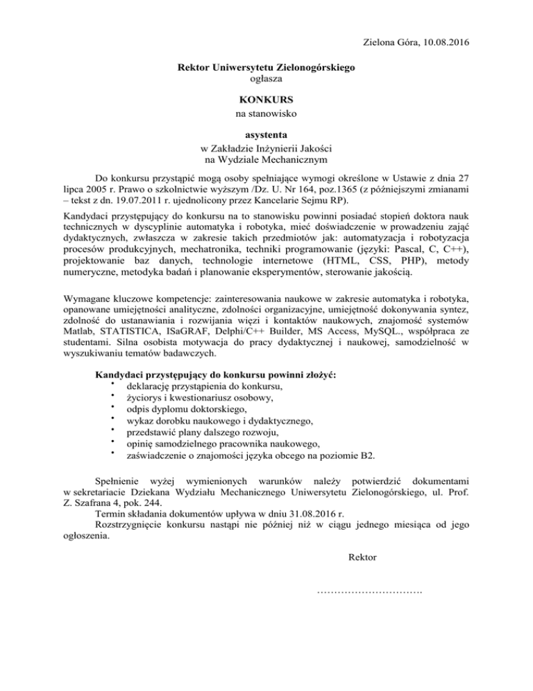 Zielona Góra, 10.08.2016 Rektor Uniwersytetu Zielonogórskiego ogłasza KONKURS na stanowisko asystenta w Zakładzie Inżynierii Jakości na Wydziale Mechanicznym Do konkursu przystąpić mogą osoby spełniające wymogi określone w Ustawie z dnia 27 lipca 2005 r. Prawo o szkolnictwie wyższym /Dz. U. Nr 164, poz.1365 (z późniejszymi zmianami – tekst z dn. 19.07.2011 r. ujednolicony przez Kancelarie Sejmu RP). Kandydaci przystępujący do konkursu na to stanowisku powinni posiadać stopień doktora nauk technicznych w dyscyplinie automatyka i robotyka, mieć doświadczenie w prowadzeniu zająć dydaktycznych, zwłaszcza w zakresie takich przedmiotów jak: automatyzacja i robotyzacja procesów produkcyjnych, mechatronika, techniki programowanie (języki: Pascal, C, C++), projektowanie baz danych, technologie internetowe (HTML, CSS, PHP), metody numeryczne, metodyka badań i planowanie eksperymentów, sterowanie jakością. Wymagane kluczowe kompetencje: zainteresowania naukowe w zakresie automatyka i robotyka, opanowane umiejętności analityczne, zdolności organizacyjne, umiejętność dokonywania syntez, zdolność do ustanawiania i rozwijania więzi i kontaktów naukowych, znajomość systemów Matlab, STATISTICA, ISaGRAF, Delphi/C++ Builder, MS Access, MySQL., współpraca ze studentami. Silna osobista motywacja do pracy dydaktycznej i naukowej, samodzielność w wyszukiwaniu tematów badawczych. Kandydaci przystępujący do konkursu powinni złożyć:  deklarację przystąpienia do konkursu,  życiorys i kwestionariusz osobowy,  odpis dyplomu doktorskiego,  wykaz dorobku naukowego i dydaktycznego,  przedstawić plany dalszego rozwoju,  opinię samodzielnego pracownika naukowego,  zaświadczenie o znajomości języka obcego na poziomie B2. Spełnienie wyżej wymienionych warunków należy potwierdzić dokumentami w sekretariacie Dziekana Wydziału Mechanicznego Uniwersytetu Zielonogórskiego, ul. Prof. Z. Szafrana 4, pok. 244. Termin składania dokumentów upływa w dniu 31.08.2016 r. Rozstrzygnięcie konkursu nastąpi nie później niż w ciągu jednego miesiąca od jego ogłoszenia. Rektor ………………………….