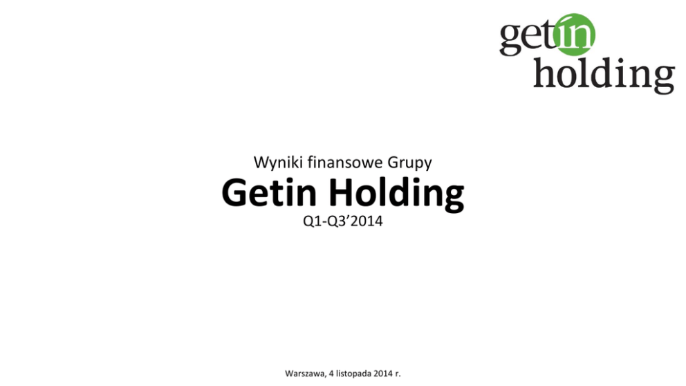 Tytuł testowy Wyniki finansowe Grupy Getin Holding Q1-Q3’2014 Warszawa, 4 listopada 2014 r. Grupa Getin Holding Podsumowanie najważniejszych wydarzeń Q3’2014 Getin Holding • zamknięcie transakcji zakupu VB Leasing w Polsce i Rumunii, kapitał + dług = 3,4 mld PLN • 106,0 mln PLN zysku netto1) w Q3, wobec 63,2 mln PLN w Q3’2013 Grupa Idea Bank Polska | Regularny wzrost wyniku z działalności operacyjnej i akwizycyjnej • 121,6 mln PLN zysku netto w Q3 Grupa Carcade i Idea Bank Rosja | Stabilizacja wyników pomimo pogorszenia sytuacji rynkowej • 8,0 mln PLN zysku netto w Q3 • wzrost sprzedaży o 10,7% w ujęciu Q3/Q2 • stabilizacja kosztów ryzyka na poziomie zbliżonym do Q2 Grupa Romanian International Bank | Skokowy wzrost skali biznesu dzięki przejęciu portfela VBL Rumunia • 49,8 mln PLN zysku netto w Q3 • x5,5 krotny wzrost aktywów kredytowych i leasingowych w ciągu kwartału (x2,4 wzrost sumy bilansowej) Grupa Idea Bank Białoruś | Pierwsze efekty korekty modelu biznesowego • 14,1 mln PLN zysku netto w Q3 • spadek kosztów rezerw do poziomu 0,8 mln PLN w Q3 Grupa Idea Bank Ukraina | Skalowanie modelu biznesowego 1) • 17,3 mln PLN straty netto – ryzyko kredytowe – eskalacja działań wojennych w Donbasie w Q3 • zamknięcie 17 oddziałów … przypisany akcjonariuszom jednostki dominującej Grupy Getin Holding 2 Grupa Getin Holding Struktura wyniku finansowego za Q1-Q3’2014 mln PLN | r/r Przychody z tytułu odsetek Koszty z tytułu odsetek Q1-Q3'2014 Q1-Q3'2013 * 1 174,0 1 020,2 Q1-Q3'2014 / Q1-Q3'2013 * (mln PLN) +15,1% -652,6 -618,7 +5,5% Wynik z tytułu odsetek 521,4 401,5 +29,9% Wynik z tytułu prowizji i opłat 289,9 323,9 -10,5% Pozostałe przychody i koszty operacyjne netto 273,8 82,3 x3,3 1 085,2 807,7 +34,4% Koszty działania -617,2 -488,6 +26,3% Koszty rezerw -170,6 -121,6 +40,3% Zysk (strata) brutto 297,4 197,6 +50,5% Podatek dochodowy -56,0 -12,4 x4,5 Zysk (strata) netto 241,4 185,2 +30,3% Udziały niekontrolujące -61,7 -18,0 x3,4 Zysk netto akcjonariuszy jednostki dominującej 179,7 167,2 +7,5% Przychody operacyjne netto Kontrybucja grup biznesowych do skonsolidowanego wyniku netto1) 99,3 69,12) 186,6 15,0 -36,9 52,7 21,6 11,3 -169,9 -123,02) 179,7 54,62) 77,72) Grupa IB Polska 78,42) Grupa IB Białoruś Grupa IB Ukraina Grupa RIB Carcade & IB Rosja MW Trade Holding Korekty konsolidacyjne Grupa Getin Holding 78,4 mln PLN wpływu transakcji nabycia spółek VB Leasing na zysk1) netto. Poprawa wyniku odsetkowego i prowizyjnego polskich spółek operacyjnych o odpowiednio 143,2 mln PLN i 32,2 mln PLN przy wzroście kosztów działania o 92,4 mln PLN oraz kosztów rezerw o 8,4 mln PLN. Spółki zagraniczne (poza Ukrainą) x2,5 poprawiły swoje wyniki w ujęciu kwartalnym. 1) … przypisany akcjonariuszom jednostki dominującej Grupy Getin Holding 2) Wpływ nabycia VB Leasing w Polsce i Rumunii * Dane przekształcone 3 Grupa Getin Holding Podstawowe parametry finansowe Aktywa Kapitał własny Zysk netto1) (mln PLN) (mln PLN) (mln PLN) +25,1% x2,6 +43,9% +4,7% 12 954,6 954,6 12 808,4 22 808,4 +29,2% 19 215,5 215,5 19 +3,1% 145,3 22 145,3 -60,5% 106,0 245,5 22 245,5 81,7 13 353,9 13 353,9 63,2 +27,9% 41,3 32,3 2013-09-30 2013-12-31 2014-09-30 2013-09-30 2013-12-31 2014-09-30 Q3'2013 Q4'2013 Q1'2014 Q2'2014 Q3'2014 Saldo kredytów netto osiągnęło poziom 7,7 mld PLN (+1,9 mld PLN r/r) przy jednoczesnym wzroście salda depozytów do 11,3 mld PLN (+4,5 mld PLN r/r). Wskaźnik K/D na koniec Q3 wyniósł 70,6% (vs 85,6% rok wcześniej). Należności leasingowe wzrosły do 4,6 mld PLN (+2,9 mld PLN r/r). Zatrudnienie w Grupie osiągnęło poziom 7,3 tys. etatów (+14,2% r/r) – konsolidacja 5 nowych spółek w Grupie (RIB, GetBack, Idea Money oraz VBL Polska i Rumunia). Wzrost kapitałów Grupy o 563,0 mln PLN (+25,1%) od początku roku, za dzięki podniesieniu kapitału w Idea Bank Polska oraz zatrzymaniu zysków bieżących. Zysk netto1) za Q3 był 2,6x wyższy od wypracowanego w Q2. 1) … przypisany akcjonariuszom jednostki dominującej Grupy Getin Holding * Dane przekształcone 4 Grupa Getin Holding Nabycie spółek VB Leasing w Polsce i Rumunii Rynek leasingowy w Polsce i Rumunii Rynek leasingu w Polsce Sens ekonomiczny nabycia stan na H1'2014 Grupa Idea Bank VB Leasing Polska Grupa VB Leasing Rumunia RIB saldo należności kredytowych i leasingowych 5 629,7 2 829,7 108,5 513,2 sprzedaż kredytowa i leasingowa 1 737,9 817,1 0,0 168,4 wynik odsetkowy 132,7 56,2 5,9 2,6 zysk netto 65,0 25,2 1) 2,8 10,0 1 Getin + Idea + VBL 2 Europejski Fundusz Leasingowy 3 Raiffeisen-Leasing Polska 4 mLeasing 5 Millennium Leasing 6 BZWBK Leasing 7 PKO Leasing + PKO Leasing Pro 8 ING Lease Polska 9 Pekao Leasing 10 BNP Paribas Leasing Solutions …… Doszacowanie do 100% rynku Rynek leasingu w Rumunii 1 Unicredit Leasing 2 Impuls Leasing 3 Porsche Leasing 4 Raiffeisen Leasing 5 BRD Sogelease 6 VB Leasing Romania 7 Garanti(Motoractive) Leasing 8 BCR Leasing 9 RCI LEASING 10 TIRIAC Leasing …… Doszacowanie do 100% rynku 1) wyłączono wpływ zwrotu VAT na 61,2 mln PLN Wartość sprzedaży w H1'2014 (mln PLN) 2 332,3 1 803,7 1 636,4 1 490,0 1 378,0 1 372,4 1 337,4 1 292,1 895,4 695,3 … 21 050,0 Wartość sprzedaży w H1'2014 (mln PLN) 535,7 236,4 211,8 199,4 180,0 168,4 142,0 140,5 120,5 96,6 … 2 698,6 Udział rynkowy (%) 11,1% 8,6% 7,8% 7,1% 6,5% 6,5% 6,4% 6,1% 4,3% 3,3% … Udział rynkowy (%) 19,9% 8,8% 7,8% 7,4% 6,7% 6,2% 5,3% 5,2% 4,5% 3,6% … 5 Grupa Getin Holding Struktura Grupy Kapitałowej RUMUNIA POLSKA Polska Wg. stanu na 30.09.2014 Rosja Białoruś Ukraina Rumunia 6 GRUPA Grupa Idea Bank Polska Regularny wzrost wyniku z działalności operacyjnej i akwizycyjnej mln PLN | r/r Przychody z tytułu odsetek Q1-Q3'2014 Q1-Q3'2013 * Q1-Q3'2014 / Q1-Q3'2013 * 467,5 286,5 +63,2% -234,3 -194,8 +20,3% Wynik z tytułu odsetek 233,2 91,7 x2,5 Wynik z tytułu prowizji i opłat 199,4 186,1 +7,1% Pozostałe przychody i koszty operacyjne netto 137,9