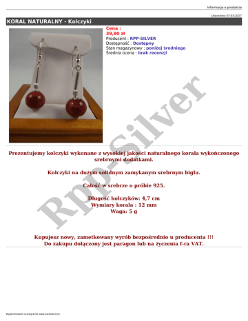 Informacje o produkcie Utworzono 07-03-2017 KORAL NATURALNY - Kolczyki Cena : 39,90 zł pp -S ilv er Producent : RPP-SILVER Dostępność : Dostępny Stan magazynowy : poniżej średniego Średnia ocena : brak recenzji Prezentujemy kolczyki wykonane z wysokiej jakości naturalnego korala wykończonego srebrnymi dodatkami. Kolczyki na dużym solidnym zamykanym srebrnym biglu. R Całość w srebrze o próbie 925. Długość kolczyków: 4,7 cm Wymiary korala : 12 mm Waga: 5 g Kupujesz nowy, zametkowany wyrób bezpośrednio u producenta !!! Do zakupu dołączony jest paragon lub na życzenia f-ra VAT. Wygenerowano w programie www.oscGold.com