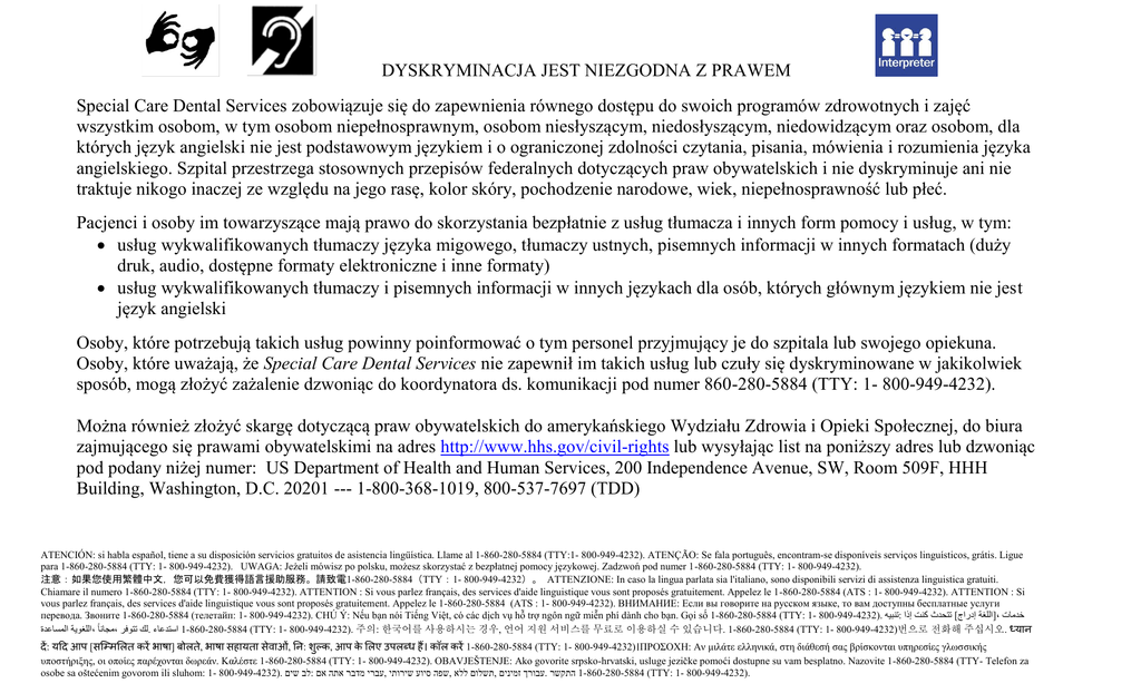 DYSKRYMINACJA JEST NIEZGODNA Z PRAWEM Special Care Dental Services zobowiązuje się do zapewnienia równego dostępu do swoich programów zdrowotnych i zajęć wszystkim osobom, w tym osobom niepełnosprawnym, osobom niesłyszącym, niedosłyszącym, niedowidzącym oraz osobom, dla których język angielski nie jest podstawowym językiem i o ograniczonej zdolności czytania, pisania, mówienia i rozumienia języka angielskiego. Szpital przestrzega stosownych przepisów federalnych dotyczących praw obywatelskich i nie dyskryminuje ani nie traktuje nikogo inaczej ze względu na jego rasę, kolor skóry, pochodzenie narodowe, wiek, niepełnosprawność lub płeć. Pacjenci i osoby im towarzyszące mają prawo do skorzystania bezpłatnie z usług tłumacza i innych form pomocy i usług, w tym: usług wykwalifikowanych tłumaczy języka migowego, tłumaczy ustnych, pisemnych informacji w innych formatach (duży druk, audio, dostępne formaty elektroniczne i inne formaty) usług wykwalifikowanych tłumaczy i pisemnych informacji w innych językach dla osób, których głównym językiem nie jest język angielski Osoby, które potrzebują takich usług powinny poinformować o tym personel przyjmujący je do szpitala lub swojego opiekuna. Osoby, które uważają, że Special Care Dental Services nie zapewnił im takich usług lub czuły się dyskryminowane w jakikolwiek sposób, mogą złożyć zażalenie dzwoniąc do koordynatora ds. komunikacji pod numer 860-280-5884 (TTY: 1- 800-949-4232). Można również złożyć skargę dotyczącą praw obywatelskich do amerykańskiego Wydziału Zdrowia i Opieki Społecznej, do biura zajmującego się prawami obywatelskimi na adres http://www.hhs.gov/civil-rights lub wysyłając list na poniższy adres lub dzwoniąc pod podany niżej numer: US Department of Health and Human Services, 200 Independence Avenue, SW, Room 509F, HHH Building, Washington, D.C. 20201 --- 1-800-368-1019, 800-537-7697 (TDD) ATENCIÓN: si habla español, tiene a su disposición servicios gratuitos de asistencia lingüística. Llame al 1-860-280-5884 (TTY:1- 800-949-4232). ATENÇÃO: Se fala português, encontram-se disponíveis serviços linguísticos, grátis. Ligue para 1-860-280-5884 (TTY: 1- 800-949-4232). UWAGA: Jeżeli mówisz po polsku, możesz skorzystać z bezpłatnej pomocy językowej. Zadzwoń pod numer 1-860-280-5884 (TTY: 1- 800-949-4232). 注意:如果您使用繁體中文,您可以免費獲得語言援助服務。請致電1-860-280-5884(TTY:1- 800-949-4232)。 ATTENZIONE: In caso la lingua parlata sia l'italiano, sono disponibili servizi di assistenza linguistica gratuiti. Chiamare il numero 1-860-280-5884 (TTY: 1- 800-949-4232). ATTENTION : Si vous parlez français, des services d'aide linguistique vous sont proposés gratuitement. Appelez le 1-860-280-5884 (ATS : 1- 800-949-4232). ATTENTION : Si vous parlez français, des services d'aide linguistique vous sont proposés gratuitement. Appelez le 1-860-280-5884 (ATS : 1- 800-949-4232). ВНИМАНИЕ: Если вы говорите на русском языке, то вам доступны бесплатные услуги перевода. Звоните 1-860-280-5884 (телетайп: 1- 800-949-4232). CHÚ Ý: Nếu bạn nói Tiếng Việt, có các dịch vụ hỗ trợ ngôn ngữ miễn phí dành cho bạn. Gọi số 1-860-280-5884 (TTY: 1- 800-949-4232). تنبيه: ]اللغة إدراج[ تتحدث كنت إذا، خدمات اللغوية المساعدة، ًمجانا، لك تتوفر. استدعاء1-860-280-5884 (TTY: 1- 800-949-4232). 주의: 한국어를 사용하시는 경우, 언어 지원 서비스를 무료로 이용하실 수 있습니다. 1-860-280-5884 (TTY: 1- 800-949-4232)번으로 전화해 주십시오. ध्यान दें : यदद आप [सम्मिलित करें भाषा] बोिते, भाषा सहायता सेवाओं, नन: शुल्क, आप के लिए उपिब्ध हैं। कॉि करें 1-860-280-5884 (TTY: 1- 800-949-4232)।ΠΡΟΣΟΧΗ: Αν μιλάτε ελληνικά, στη διάθεσή σας βρίσκονται υπηρεσίες γλωσσικής υποστήριξης, οι οποίες παρέχονται δωρεάν. Καλέστε 1-860-280-5884 (TTY: 1- 800-949-4232). OBAVJEŠTENJE: Ako govorite srpsko-hrvatski, usluge jezičke pomoći dostupne su vam besplatno. Nazovite 1-860-280-5884 (TTY- Telefon za osobe sa oštećenim govorom ili sluhom: 1- 800-949-4232). לב שים: עברי מדבר אתה אם, שפה סיוע שירותי, תשלום ללא, עבורך זמינים. התקשר1-860-280-5884 (TTY: 1- 800-949-4232).