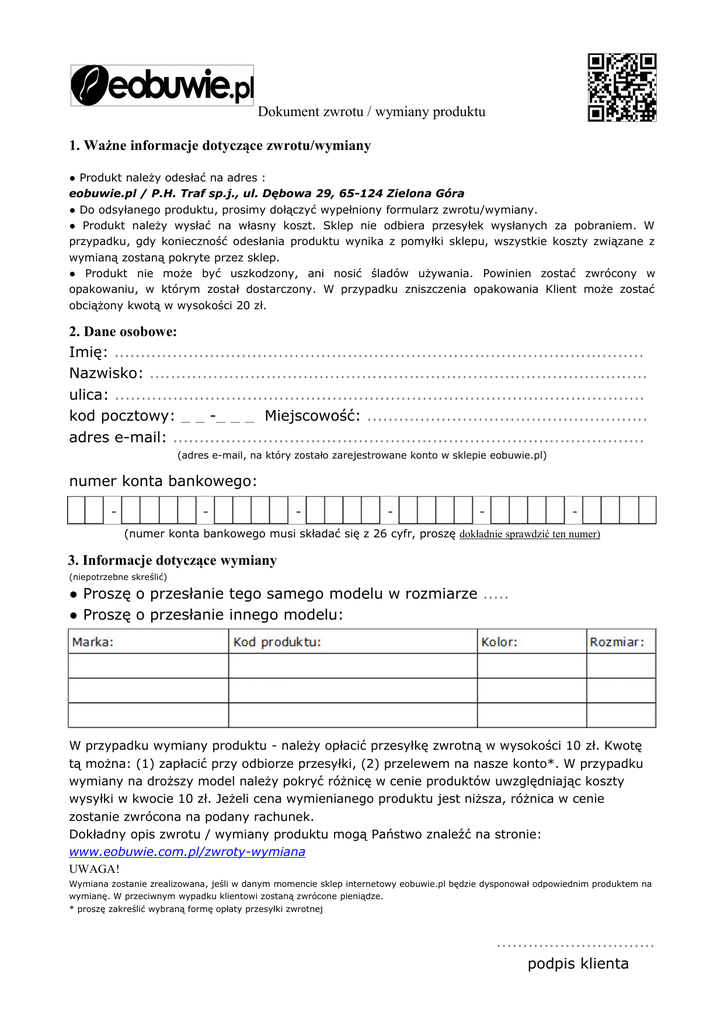 Dokument zwrotu / wymiany produktu 1. Ważne informacje dotyczące zwrotu/wymiany ● Produkt należy odesłać na adres : eobuwie.pl / P.H. Traf sp.j., ul. Dębowa 29, 65-124 Zielona Góra ● Do odsyłanego produktu, prosimy dołączyć wypełniony formularz zwrotu/wymiany. ● Produkt należy wysłać na własny koszt. Sklep nie odbiera przesyłek wysłanych za pobraniem. W przypadku, gdy konieczność odesłania produktu wynika z pomyłki sklepu, wszystkie koszty związane z wymianą zostaną pokryte przez sklep. ● Produkt nie może być uszkodzony, ani nosić śladów używania. Powinien zostać zwrócony w opakowaniu, w którym został dostarczony. W przypadku zniszczenia opakowania Klient może zostać obciążony kwotą w wysokości 20 zł. 2. Dane osobowe: Imię: .................................................................................................... Nazwisko: .............................................................................................. ulica: .................................................................................................... kod pocztowy: _ _ -_ _ _ Miejscowość: ..................................................... adres e-mail: ......................................................................................... (adres e-mail, na który zostało zarejestrowane konto w sklepie eobuwie.pl) numer konta bankowego: (numer konta bankowego musi składać się z 26 cyfr, proszę dokładnie sprawdzić ten numer) 3. Informacje dotyczące wymiany (niepotrzebne skreślić) ● Proszę o przesłanie tego samego modelu w rozmiarze ..... ● Proszę o przesłanie innego modelu: W przypadku wymiany produktu - należy opłacić przesyłkę zwrotną w wysokości 10 zł. Kwotę tą można: (1) zapłacić przy odbiorze przesyłki, (2) przelewem na nasze konto*. W przypadku wymiany na droższy model należy pokryć różnicę w cenie produktów uwzględniając koszty wysyłki w kwocie 10 zł. Jeżeli cena wymienianego produktu jest niższa, różnica w cenie zostanie zwrócona na podany rachunek. Dokładny opis zwrotu / wymiany produktu mogą Państwo znaleźć na stronie: www.eobuwie.com.pl/zwroty-wymiana UWAGA! Wymiana zostanie zrealizowana, jeśli w danym momencie sklep internetowy eobuwie.pl będzie dysponował odpowiednim produktem na wymianę. W przeciwnym wypadku klientowi zostaną zwrócone pieniądze. * proszę zakreślić wybraną formę opłaty przesyłki zwrotnej .............................. podpis klienta