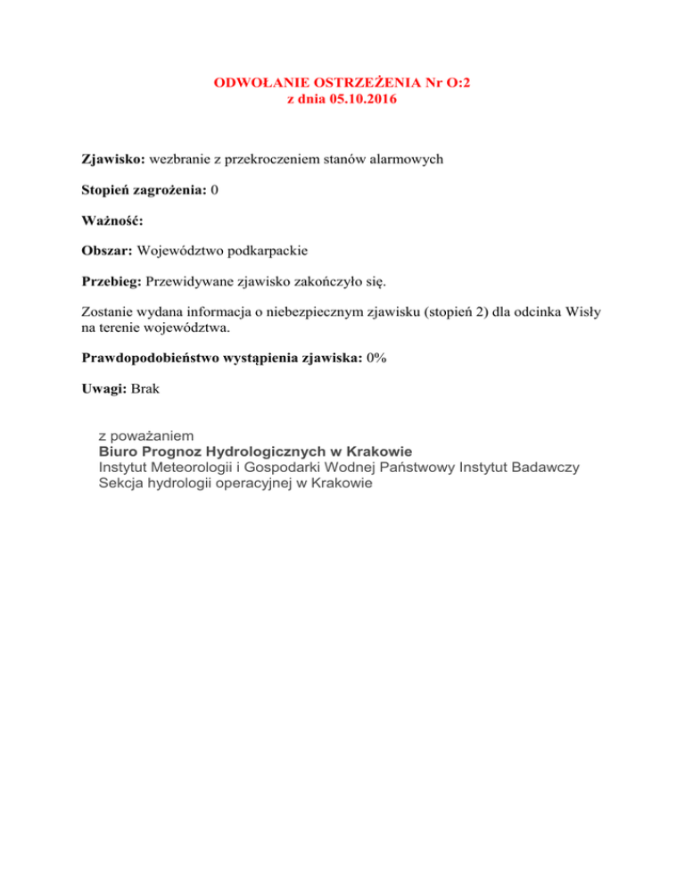ODWOŁANIE OSTRZEŻENIA Nr O:2 z dnia 05.10.2016 Zjawisko: wezbranie z przekroczeniem stanów alarmowych Stopień zagrożenia: 0 Ważność: Obszar: Województwo podkarpackie Przebieg: Przewidywane zjawisko zakończyło się. Zostanie wydana informacja o niebezpiecznym zjawisku (stopień 2) dla odcinka Wisły na terenie województwa. Prawdopodobieństwo wystąpienia zjawiska: 0% Uwagi: Brak z poważaniem Biuro Prognoz Hydrologicznych w Krakowie Instytut Meteorologii i Gospodarki Wodnej Państwowy Instytut Badawczy Sekcja hydrologii operacyjnej w Krakowie