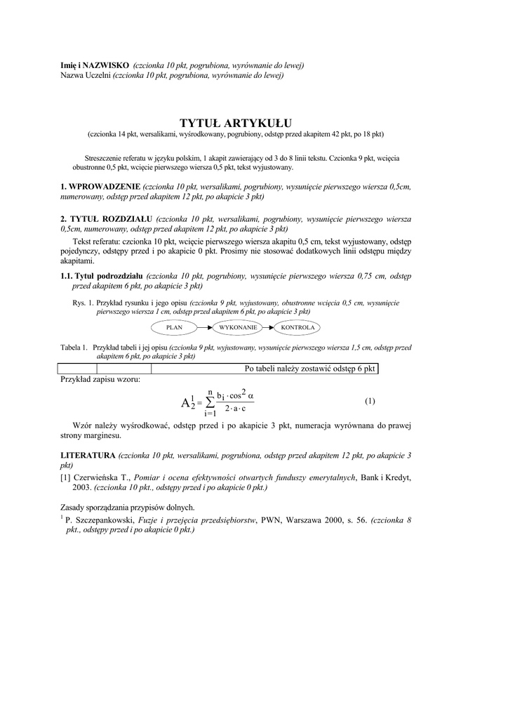 Imię i NAZWISKO (czcionka 10 pkt, pogrubiona, wyrównanie do lewej) Nazwa Uczelni (czcionka 10 pkt, pogrubiona, wyrównanie do lewej) TYTUŁ ARTYKUŁU (czcionka 14 pkt, wersalikami, wyśrodkowany, pogrubiony, odstęp przed akapitem 42 pkt, po 18 pkt) Streszczenie referatu w języku polskim, 1 akapit zawierający od 3 do 8 linii tekstu. Czcionka 9 pkt, wcięcia obustronne 0,5 pkt, wcięcie pierwszego wiersza 0,5 pkt, tekst wyjustowany. 1. WPROWADZENIE (czcionka 10 pkt, wersalikami, pogrubiony, wysunięcie pierwszego wiersza 0,5cm, numerowany, odstęp przed akapitem 12 pkt, po akapicie 3 pkt) 2. TYTUŁ ROZDZIAŁU (czcionka 10 pkt, wersalikami, pogrubiony, wysunięcie pierwszego wiersza 0,5cm, numerowany, odstęp przed akapitem 12 pkt, po akapicie 3 pkt) Tekst referatu: czcionka 10 pkt, wcięcie pierwszego wiersza akapitu 0,5 cm, tekst wyjustowany, odstęp pojedynczy, odstępy przed i po akapicie 0 pkt. Prosimy nie stosować dodatkowych linii odstępu między akapitami. 1.1. Tytuł podrozdziału (czcionka 10 pkt, pogrubiony, wysunięcie pierwszego wiersza 0,75 cm, odstęp przed akapitem 6 pkt, po akapicie 3 pkt) Rys. 1. Przykład rysunku i jego opisu (czcionka 9 pkt, wyjustowany, obustronne wcięcia 0,5 cm, wysunięcie pierwszego wiersza 1 cm, odstęp przed akapitem 6 pkt, po akapicie 3 pkt) PLAN WYKONANIE KONTROLA Tabela 1. Przykład tabeli i jej opisu (czcionka 9 pkt, wyjustowany, wysunięcie pierwszego wiersza 1,5 cm, odstęp przed akapitem 6 pkt, po akapicie 3 pkt) Po tabeli należy zostawić odstęp 6 pkt Przykład zapisu wzoru: n b ⋅ cos 2 α (1) ∑ i2⋅ a⋅ c i=1 Wzór należy wyśrodkować, odstęp przed i po akapicie 3 pkt, numeracja wyrównana do prawej strony marginesu. A12 = LITERATURA (czcionka 10 pkt, wersalikami, pogrubiona, odstęp przed akapitem 12 pkt, po akapicie 3 pkt) [1] Czerwieńska T., Pomiar i ocena efektywności otwartych funduszy emerytalnych, Bank i Kredyt, 2003. (czcionka 10 pkt., odstępy przed i po akapicie 0 pkt.) Zasady sporządzania przypisów dolnych. 1 P. Szczepankowski, Fuzje i przejęcia przedsiębiorstw, PWN, Warszawa 2000, s. 56. (czcionka 8 pkt., odstępy przed i po akapicie 0 pkt.) ZASADY PRZYGOTOWANIA REFERATU • Liczba stron powinna być parzysta i nie przekraczać 6 stron łącznie z rysunkami, tabelami, literaturą i streszczeniem. • Treść referatu prosimy napisać w edytorze Word, czcionką Times New Roman, zachowując dla wszystkich akapitów pojedynczy odstęp między wierszami. • Układ referatu powinien być opracowany zgodnie ze schematem na poprzedniej stronie. • Referaty powinny być napisane w formacie A4, przy czym należy zastosować następujące marginesy: górny i dolny – 5,3 cm, lewy i prawy – 4,1 cm. Nie należy wprowadzać numeracji stron. Na wydruku należy strony referatu ponumerować ołówkiem w lewym dolnym rogu. • Stosowane skróty powinny być zgodne z obowiązującymi zasadami. • Wszystkie rysunki, wykresy i tabele powinny być umieszczone bezpośrednio w tekście lub wypełniać całe strony (nie powinny przekraczać marginesów, w układzie pionowym). Rysunki należy zgrupować. • Numery i tytuły rysunków, wykresów oraz tabel należy umieścić nad nimi (wyrównanie do lewej), a wskazanie źródła pod nimi (również wyrównanie do lewej). • Wykaz literatury, jedynie cytowanej w pracy, powinien być zestawiony na końcu referatu w porządku alfabetycznym. • Dla całego tekstu pracy należy stosować przypisy dolne o numeracji ciągłej. • Referat prosimy przesłać pocztą elektroniczną na podany w ulotce adres email. • Teksty referatów nie spełniające powyższych wymagań mogą zostać nie opublikowane.