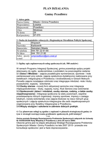 PLAN DZIAŁANIA Gminy Przedbórz 1. Adres gmin Nazwa Gminy Województwo Miejscowość Ulica Nr domu Kod pocztowy Miasto i Gmina Przedbórz Łódzkie Przedbórz Mostowa 29 97-570 2. Osoba do kontaktów roboczych z Regionalnym Ośrodkiem Polityki Społecznej Imię Wojciech Nazwisko Karbownik Stanowisko Sekretarz Miasta Nr telefonu 044 781 22 61-65 Nr faksu 044 781 21 80 Adres poczty [email protected] e-mail 3. Ogólny opis zaplanowanych usług społecznych (ok. 500 znaków) W ramach Programu Integracji Społecznej, gmina przewiduje spójny projekt skierowany do ogółu społeczeństwa z podziałem na poszczególne zadania: 3.1.Dzieci i Młodzież – zajęcia pozalekcyjne wyrównawcze, sportowe i koła zainteresowań przy szkole, zajęcia opiekuńczo-dydaktyczne realizowane przy świetlicach: integracyjnej w Przedborzu i środowiskowej w Górach Mokrych. Ponadto zajęcia rozwijające zdolności oraz integrujące młodzież –koła i kluby pozaszkolne, wyjazdy, wolontariat. 3.2.Osoby starsze –rozwój form aktywizacji seniorów oraz integracja międzypokoleniowa – kluby, wyjazdy, kursy, Klub Seniora oraz wolontariat. 3.3.Społeczność (dzieci i młodzież, osoby starsze, rodziny, a także osoby niepełnosprawne) - Integracja społeczna na wielu poziomach, wspólne przedsięwzięcia różnych organizacji, imprezy sportowe, imprezy o zasięgu lokalnym, rozwój wolontariatu oraz zajęcia klubowe na rzecz różnych grup społecznych i zajęcia opiekuńczo-integracyjne dla osób niepełnosprawnych organizowane przy Świetlicy Integracyjnej w Przedborzu. 3.4.Wizyty studyjne i szkolenia w zakresie dobrych praktyk. 4. Czy planowane usługi są zgodne z zapisami w planach strategicznych gminy (w tym w strategii rozwiązywania problemów społecznych, jeśli istnieje)? TAK Gmina posiada Strategię Rozwiązywania Problemów Społecznych załącznik do Uchwały Nr XXXIII/245/06 Rady Miejskiej w Przedborzu z dnia 29 marca 2006r. Obecnie gmina jest na etapie aktualizacji Strategii Rozwiązywania Problemów Społecznych Miasta i Gminy Przedbórz na lata 2007 2015– przeszła ona konsultacje społeczne i jest w fazie dopracowywania . Planowane przedsięwzięcia są zgodne z zapisami strategii, wypracowanymi metoda partycypacyjną i na warsztatach strategicznych z moderatorem: 1. Cel strategiczny Stworzenie dzieciom i młodzieży perspektyw rozwoju – Cele szczegółowe: 1.1.Rozszerzenie oferty zajęć pozalekcyjnych i pozaszkolnych ukierunkowanych na podniesienie wiedzy i umiejętności dzieci i młodzieży. 1.2.Rozszerzenie oferty zajęć pozalekcyjnych i pozaszkolnych ukierunkowanych na wzrost tożsamości lokalnej i integrację społeczną . 1.3.Zwiększenie możliwości uczestnictwa młodzieży w przedsięwzięciach organizowanych na terenie Gminy i poza nią: współpraca lokalna i międzynarodowa.. 2. Cel strategiczny Aktywizacja społeczna osób niepełnosprawnych Cele szczegółowe : 2.1.Zwiększenie ilości atrakcyjnych form spędzania wolnego czasu oraz umożliwiających rozwój dla osób niepełnosprawnych. 2.2.Zwiększenie dostępności dla osób niepełnosprawnych do form umożliwiających integrację społeczną. 2.3.Zwiększenie dostępności do usług opiekuńczych i medycznych, specjalistycznych. 3. Cel strategiczny Zwiększenie integracji międzypokoleniowej i zapewnienie samorozwoju oraz uczestnictwa w życiu społecznym osób starszych. Cele szczegółowe 3.1.Zwiększenie dostępności do usług edukacyjnych, opiekuńczych i medycznych dla osób starszych. 3.2.Zwiększenie ilości atrakcyjnych form spędzania wolnego czasu oraz umożliwiających rozwój dla seniorów. 3.3.Zwiększenie ilości form aktywnego uczestnictwa osób starszych w życiu Gminy (współdziałanie pomiędzy klubami i organizacjami młodzieżowymi, seniorami oraz innymi grupami społecznymi, wolontariat , samopomoc sąsiedzka etc). 4. Cel strategiczny Podniesienie poziomu integracji społecznej 4.1.Zwiększenie ilości przedsięwzięć angażujących różne grupy społeczne – imprezy o zasięgu lokalnym, wyjazdy, kursy, konkursy, organizacje zrzeszające różne grupy społeczne etc. 4.2.Angażowanie osób starszych w działalność społeczną – Klub Seniora ale i wykorzystanie umiejętności i doświadczenia zawodowego i życiowego seniorów na rzecz działań międzypokoleniowych. 4.3.Podniesienie aktywności społecznej mieszkańców na rzecz środowiska lokalnego. Jeśli NIE, proszę o wyjaśnienie rozbieżności. 5. Prognozowany harmonogram realizacji Planu Działania Główne etapy ROK 2008 ROK 2009 realizacji Planu Działania Kwartały I II III IV I Przygotowanie dokumentacji konkursowej X Ogłoszenie konkursu X X Rozstrzygnięcie konkursu i podpisanie umowy z usługodawcą X X II III IV Realizacja usług X X X X Monitoring i ewaluacja X X X X Rozliczenie i sprawozdawczość gminy X 6. Plan zapotrzebowania na środki finansowe TABELA 6.1. Rodzaje usług* zgodnie z podziałem w punkcie 3, np.: % kwoty objętej Planem Działania Kwota (w złotych) Usługi dla dzieci i młodzieży. 291.043,05 78,65 % Usługi dla osób starszych 23 000 6,22% Społeczność - usługi łączone dla różnych grup społecznych 40 000 10,81% Wsparcie szkoleniowe (szkolenia, warsztaty, wizyty studyjne, itp.) – do 10% alokacji 16 000 4,32% 370.043,05 100 % Razem: • • kurs Euro tabela NBP z 14.04.2008r. 73/A/NBP/2008 1€ = 3,4295 PLN kwota alokowana 107.900€ x 3,4295 PLN = 370.043,05 PLN TABELA 6.2. Podział kwot Kwota Kwota objęta Planem Działania Kwota pozostająca nadal w dyspozycji gminy RAZEM TABELA 6.3. Kwota w rozbiciu na kwartały* Kwartały Kwota (w złotych) zł % 370.043,05 100% 370.043,05 100% ROK 2008 I II - III RAZEM ROK 2009 IV I II III IV 180 000 65 000 65 000 60.043,05 370.043,05 7. Oświadczam, że informacje zawarte w niniejszym opisie usług społecznych są zgodne z prawdą. Wyrażam zgodę na udostępnienie niniejszego planu innym instytucjom oraz ekspertom dokonującym ewaluacji i oceny. Im