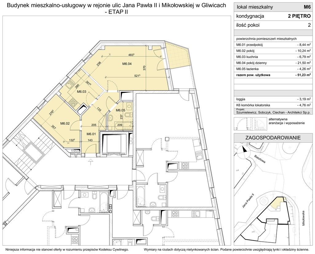 Budynek mieszkalno-usługowy w rejonie ulic Jana Pawła II i Mikołowskiej w Gliwicach - ETAP II lokal mieszkalny M6 2 PIĘTRO kondygnacja ilość pokoi 2 powierzchnia pomieszczeń mieszkalnych - 8,44 m2 M6.01 przedpokój - 10,24 m2 M6.02 pokój 4835 - 21,50 m2 M6.04 pokój dzienny 370 M6.04 23 8 - 6,79 m2 M6.03 kuchnia - 4,26 m2 M6.05 łazienka - 51,23 m2 razem pow. użytkowa 5215 28 0 26 75 M6.03 35 7 - 3,19 m2 K6 komórka lokatorska - 4,76 m2 Projekt: M6.05 Szumielewicz, Sobczyk, Ciechan - Architekci Sp.p. 237 27 65 13 3 loggia M6.02 205 alternatywna aranżacja i wyposażenie 209 M6.01 ZAGOSPODAROWANIE 143 j-23 8/2 012 1325 i j-23 8/2 012 g Ba sz tow a x 18 Mikołowska Ja na Pa wł a II 17 m4 4 m5 Niniejsza informacja nie stanowi oferty w rozumieniu przepisów Kodeksu Cywilnego. Wymiary na rzutach dotyczą nietynkowanych ścian. Podane powierzchnie uwzględniają tynki i okładziny ścienne.