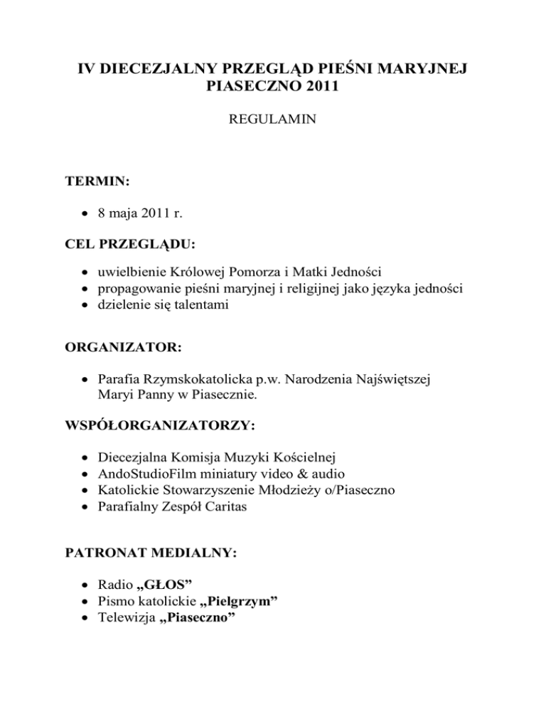IV DIECEZJALNY PRZEGLĄD PIEŚNI MARYJNEJ PIASECZNO 2011 REGULAMIN TERMIN: · 8 maja 2011 r. CEL PRZEGLĄDU: · uwielbienie Królowej Pomorza i Matki Jedności · propagowanie pieśni maryjnej i religijnej jako języka jedności · dzielenie się talentami ORGANIZATOR: · Parafia Rzymskokatolicka p.w. Narodzenia Najświętszej Maryi Panny w Piasecznie. WSPÓŁORGANIZATORZY: · · · · Diecezjalna Komisja Muzyki Kościelnej AndoStudioFilm miniatury video & audio Katolickie Stowarzyszenie Młodzieży o/Piaseczno Parafialny Zespół Caritas PATRONAT MEDIALNY: · Radio „GŁOS” · Pismo katolickie „Pielgrzym” · Telewizja „Piaseczno” ZAŁOŻENIA PRZEGLĄDU: 1. Przegląd ma charakter konkursu. 2. Zespoły i schole występują w dwóch kategoriach wiekowych: ü I kategoria do lat 13 ü II kategoria od lat 13 wzwyż. (75 % członków grupy decyduje o tym, w jakiej kategorii wiekowej występuje dany zespół). 3. Dla uczestników, którzy zajmą I, II, III miejsce przewidywane są nagrody pieniężne, lub inne nagrody i wyróżnienia przewidziane przez organizatorów. KRYTERIA OCENY JURY: · Intonacja, emisja głosu i dykcja · Aranżacja partii wokalnej i instrumentalnej, zgodność z wzorami w zakresie wykonawstwa poszczególnych instrumentów, prawidłowość instrumentacji w wykorzystaniu potencjału zespołu w zakresie posiadanych głosów. · Dobór repertuaru: a) proporcje brzmieniowe między grupami wykonawczymi b) kontrast wyrazowy pomiędzy utworami c) różnorodność opracowania muzycznego d) adaptacja utworów do własnego instrumentarium lub kompozycje własne. · Bogactwo harmoniczno – melodyczne wykonywanych kompozycji. · Ogólny wyraz artystyczny. ORGANIZACJA PRZEGLĄDU 8 maja (niedziela) · Od godziny 9.00 – próby akustyczne zespołów przy Studzience. · godz. 10.30 - uroczysta Msza Święta w kościele parafialnym w Piasecznie. · po Mszy Świętej przejście z kościoła parafialnego w miejsce objawień NMP do Studzienki. · otwarcie IV Diecezjalnego Przeglądu Pieśni Maryjnej w Piasecznie. · przesłuchania konkursowe. · narada jury, ogłoszenie wyników i wręczenie nagród. · zamknięcie IV Diecezjalnego Przeglądu Pieśni Maryjnej Piaseczno 2011 WARUNKI UCZESTNICTWA W PRZEGLĄDZIE ORAZ INFORMACJE DODATKOWE · W konkursie mogą uczestniczyć wszystkie schole i zespoły działające przy parafiach na terenie Diecezji Pelplińskiej. · Grupa występująca zobowiązana jest przygotować trzy utwory (dwa maryjne, jeden dowolny). · Utwór maksymalnie może liczyć dwie zwrotki. · Wymagana jest aranżacja muzyczna wykonywana na żywo, organizator dopuszcza podkład półmechaniczny (np. keyboard) · Zakwalifikowanie się do konkursu następuje na podstawie Karty Zgłoszenia, podpisanej przez księdza Proboszcza i opiekuna zespołu. · Zgłoszenia należy przesyłać na adres podany na końcu regulaminu (zgłoszenia można przesyłać drogą pocztową, elektroniczną, faksem bądź telefoniczną) do dnia 30.04.2011r. · Werdykt jury jest ostateczny · Organizatorzy zastrzegają sobie prawo do wykonywania zdjęć, nagrań fonograficznych, nagrań wideo mających na celu dokumentację i promocję Przeglądu; za wykorzystanie tychże materiałów wykonawcom nie przysługuje prawo do wynagrodzenia · Koszty przejazdu i ubezpieczenia pokrywają uczestnicy · Organizator nie odpowiada za rzeczy pozostawione podczas trwania imprezy · W trakcie Przeglądu zespoły mogą rozprowadzać swoje płyty. ORGANIZATORZY ZAPEWNIAJĄ: · profesjonalne nagłośnienie · gorący posiłek · dyplomy uczestnictwa dla wszystkich grup występujących w Przeglądzie. · dobrą zabawę i miłą atmosferę. · Organizator zapewnia obsługę medyczną podczas trwania imprezy. PIEŚŃ DO WSPÓLNEGO WYKONANIA: „Abba Ojcze” Adres: Biuro DPPM 83 – 123 Piaseczno tel. (058) 5351423; 781535400 tel. fax. (058) 5351424 email: [email protected] www.sanktuarium-piaseczno.pl