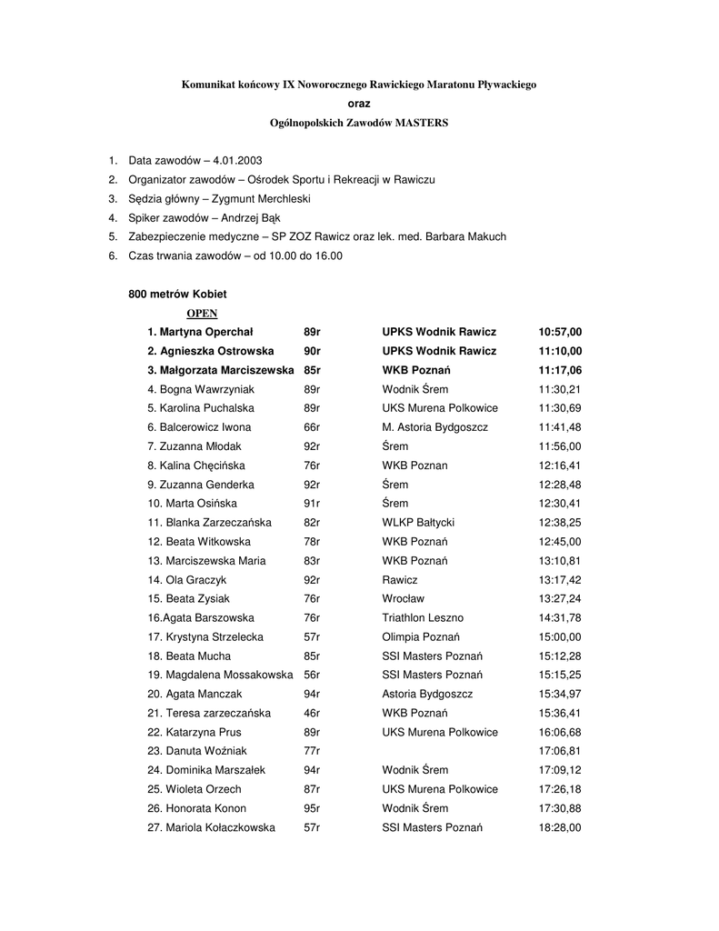 Komunikat ko cowy IX Noworocznego Rawickiego Maratonu Pływackiego oraz Ogólnopolskich Zawodów MASTERS 1. Data zawodów – 4.01.2003 2. Organizator zawodów – O rodek Sportu i Rekreacji w Rawiczu 3. S dzia główny – Zygmunt Merchleski 4. Spiker zawodów – Andrzej B k 5. Zabezpieczenie medyczne – SP ZOZ Rawicz oraz lek. med. Barbara Makuch 6. Czas trwania zawodów – od 10.00 do 16.00 800 metrów Kobiet OPEN 1. Martyna Operchał 89r UPKS Wodnik Rawicz 10:57,00 2. Agnieszka Ostrowska 90r UPKS Wodnik Rawicz 11:10,00 3. Małgorzata Marciszewska 85r WKB Pozna 11:17,06 4. Bogna Wawrzyniak 89r Wodnik rem 11:30,21 5. Karolina Puchalska 89r UKS Murena Polkowice 11:30,69 6. Balcerowicz Iwona 66r M. Astoria Bydgoszcz 11:41,48 7. Zuzanna Młodak 92r 8. Kalina Ch ci ska 76r 9. Zuzanna Genderka 92r rem 12:28,48 10. Marta Osi ska 91r rem 12:30,41 11. Blanka Zarzecza ska 82r WLKP Bałtycki 12:38,25 12. Beata Witkowska 78r WKB Pozna 12:45,00 13. Marciszewska Maria 83r WKB Pozna 13:10,81 14. Ola Graczyk 92r Rawicz 13:17,42 15. Beata Zysiak 76r Wrocław 13:27,24 16.Agata Barszowska 76r Triathlon Leszno 14:31,78 17. Krystyna Strzelecka 57r Olimpia Pozna 15:00,00 18. Beata Mucha 85r SSI Masters Pozna 15:12,28 19. Magdalena Mossakowska 56r SSI Masters Pozna 15:15,25 20. Agata Manczak 94r Astoria Bydgoszcz 15:34,97 21. Teresa zarzecza ska 46r WKB Pozna 15:36,41 22. Katarzyna Prus 89r UKS Murena Polkowice 16:06,68 23. Danuta Wo niak 77r 24. Dominika Marszałek 94r Wodnik rem 17:09,12 25. Wioleta Orzech 87r UKS Murena Polkowice 17:26,18 26. Honorata Konon 95r Wodnik rem 17:30,88 27. Mariola Kołaczkowska 57r SSI Masters Pozna 18:28,00 rem WKB Poznan 11:56,00 12:16,41 17:06,81 28. Maria Pastwa 53r Start Pozna 20.47,74 29. Danuta Banaszak 41r WKB Pozna 22:30,81 30. Alina Wieczorkiewicz 40r PSP Masters Pło sk 27:02,75 do lat 13 1. Zuzanna Młodak 92r rem 11:56,00 2. Zuzanna Genderka 92r rem 12:28,48 3. Marta Osi ska 91r rem 12:30,41 4. Ola Graczyk 92r Rawicz 13:17,42 5. Ma czak Agata 94r Astoria Bydgoszcz 15:34,97 6. Marszałek Dominika 94r Wodnik rem 17:09,12 7. Honorata Konon 95r Wodnik rem 17:30,88 1. Kalina Ch ci ska 76r WKB Pozna 12:16,41 2. Beata Witkowska 78r WKB Pozna 12:45,00 3. Beata Zysiak 76r Wrocław 13:27,24 4. Barszowska Agata 76r Triathlon Leszno 14:31,78 5. Wo niak Danuta 77r K-25 17:06,81 K-35 1. Iwona Balcerowicz 66r Astoria Bydgoszcz REKORD POLSKI 11:41,48 K-45 1. Krystyna Strzelecka 57r Olimpia Pozna 15:00,00 2. Magdlena Mossakowska 56r SSI Masters Pozna 15:15,25 3. Mariola Kołaczkowska 57r SSI Masters Pozna 18:25,00 53r Start Pozna 20:47,74 46r WLKP Klub Pozna 15:36,41 K-50 1. Maria Pastwa K-55 1. Teresa Zarzecza ska K-66 1. Danuta Banaszak 41r WKB Pozna 22:30,81 2. Alina Wieczorkiewicz 40r PSP Masters Pło sk 27:02,75 Najstarsza zawodniczka: Alina Wieczorkiewicz PSP Masters Pło sk - 1940r Najmłodsza zawodniczka: Honorata Konon Rawicz – 1995 1500 metrów M OPEN czyzn 1. Marcin Nowakowski 66r WKS l sk Wrocław 16:51,02 2. Tomasz Młody 88r Wodnik Rawicz 18:46,04 3. Paweł Markowski 90r Wodnik Rawicz 19:03,31 4. Marcin Nowacki 90r Wodnik Rawicz 19:04,10 5. Marcin Tomaszewski 88r Wodnik rem 19:50,00 6. Kamil Pruchnik 89r Wodnik Rawicz 20:09,26 7. Krzysztof Augustyniak 81r MKS Płetwal Polkowice 20:16,37 8. Jakub Ma czak 71r M. Astoria Bydgoszcz 20:23,00 9. Dawid Michałowski 91r Wodnik Rawicz 20:58,6 10. Jacek Lelewski 65r Wrocław 21:22,12 11. Robert St pniak 69r M.Astoria Bydgoszcz 21:33,59 12. Jacek Ha czyk 65r Pływalnia roda 22:02,45 13. Łukasz Kisło 83r Triathlon Leszno 22:02,73 14. Zygmunt Ciepły 52r WKTRI Wrocław 22:07,58 15. Jacek Thiem 63r Warta Pozna 22:32,00 16. Grzegorz Figielski 53r WSP Warszawa 22:35,78 17. Bartek Le niak 86r UKS Murena Polkowice 22:50,65 18. Zbigniew Pietraszewski 55r Olimpia Masters Pozna 22:55,84 19. Filip Orłowski 82r AZS OAM Pozna 22:59,97 20. Wawrzyniec Ma czak 48r M.Astoria Bydgoszcz 23:30,94 21. Roman Bartkowiak 49r Wodnik rem 23:36,91 22. Adam Łagoda 91r 23. Bogdan Dubi ski 53r 24. Piotr Pieprzyk 89r Wodnik Rawicz 24:08,58 25. Bogusław Wawrzyniak 65 Ostrów Wlkp. 24:21,00 26. Paweł Łukaszewicz 55r SSI Masters Pozna 24:24,08 27. Jacek Beszterada 60r SSI Masters Pozna 24:26,10 28. Wiesław Szmyt 62r SSI Masters Pozna 24:50,32 29. Robert Kapita czyk 67r SSI Start Pozna 25:00,78 30. Edmund Łapi ski 48r WKTRIU Wrocław 25:10,30 31. Jerzy Neumann 44r SSI Masters Pozna 25:14,75 32. Janisław Osi słowski 42r Olimpia Pozna 25:20,09 33. Jacek Adamski 60r SSI Masters Pozna 25:28,12 34. Mieczysław Wróblewski 56r WKTRIU Wrocław 25:36,50 35. Jacek Lesi ski 44r Olimpia Pozna 25:58,06 36. Robert Kozelka 75r Rawicz 26:12,45 37. Paweł Barszowski 70r Triathlon Leszno 26:28,17 38. Stanisław Regen 48r Start Pozna 26:36,60 39. Zygmunt Lewandowski 37r M.Astoria Bydgoszcz 26:55,14 40. Paweł Ziober 77r WKTRIU Wrocław 26:56,21 rem 23:44,06 24:02,15 41. Maciej Beszterada 59r Ssi Start Pozna 26:57,22 42. Piotr Nowak 77r 43. Robert Ozga 78r 44. Grzegorz Młody 57r 45. Andrzej Lewandowski 59r 46. Paweł Wo niak 69r 47. Krzysztof Ka mierowski 61r Ostrów Wlkp. 28:05,12 48. Bogdan Puchalski 56r UKS Murena Polkowice 28:21,25 49. Waldemar Cebula 57r Wrocławski klub Triathlonowy 28:25,47 50. Jarosław Szymczak 57r TS Olimpia Pozna 29:41,12 51. Wojciech Niewiada 38r Olimpia Pozna 29:55,24 52. Darek Szulc 64r Wodnik rem 29:58,82 53. Marcin Nowicki 66r 54. Marek Kozielczyk 94r Wodnik rem 30:58,40 55. Andrzej Dworczak 78r Wodnik rem 30:59,00 56. Ryszard Sielski 37r WSP Warszawa 31:11,41 57. Roman Szydłowski 52r Wodnik rem 34:91,25 58. Jerzy Gendek 47r 59. Wojciech Wawrzyniak 94r Ostrów Wlkp. 36:21,00 60. Paweł Ziemli ski 91r Wodnik Rawicz 38:44,00 61. Edmund Szmyt 34r SSI Start Pozna 39:31,50 62. Piotr Hantkiewicz 95r rem 42:28,35 63. Władysław Trawi ski 23r Rawicz 51:00,00 64. Krzysztof Pawłowski 59r SSI Masters Pozna 27:00,13 Pływalnia roda Wlkp. 27:10,00 27:32,60 Kórnik 27:36,50 27:53,18 30:19,00 35:36,00 nie uko czył dyst Do 13 lat 1. Dawid Mic