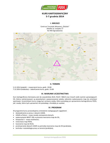 KURS KARTOGRAFICZNY 5-7 grudnia 2014 I. MIEJSCE Centrum Turystyki Aktywnej „Żelazko” Żelazko ul. Jurajska 17 42-440 Ogrodzieniec II. TERMIN 5.12.2014 (piątek) – rozpoczęcie kursu, godz. 19:00 7.12.2014 (niedziela) – zakooczenie kursu, godz. 15:00 III. WARUNKI UCZESTNICTWA Kurs kartograficzny kierowany jest do zawodników BnO, RJnO i NBnO oraz innych osób czynnie uprawiających OS, którzy zainteresowani są pozyskaniem zaawansowanej wiedzy odnośnie wykonywania map do orientacji sportowej. Uczestnikami kursu mogą byd zarówno osoby, które posiadają już uprawnienia kartograficzne PZOS, jak i osoby, które tych uprawnieo nie posiadają i chciałyby je uzyskad. IV. PROGRAM W programie kursu przewidujemy omówienie następujących zagadnieo: doświadczenia w pracy z danymi LIDAR, LIDAR w Polsce – nowy zasady zamawiania danych, wykorzystanie BDOT 10k w procesie tworzenia map do OS, Geoportal 2 - nowe możliwości, nowa baza map PZOS, tworzenie map do RJnO, przetwarzanie danych LIDAR na potrzeby tworzenia map do OS (praktyka), technika i metodologia pracy w terenie (praktyka), Komisja Kartograficzna PZOS praca w terenie - zajęcia indywidualne (praktyka), generalizacja danych LIDAR podczas pracy w terenie (praktyka), podstawy i tajniki pracy z programem OCAD (praktyka), praca w programie OCAD - zajęcia indywidualne. Szczegółowy program kursu wraz z dokładnym harmonogramem czasowym zostanie przedstawiony w późniejszym terminie. V. CO NOWEGO W 2014? Kurs stanowi rozszerzenie wiedzy, która została przekazana uczestnikom podczas zeszłorocznej edycji. Jego głównym celem jest przekazanie uczestnikom wiedzy, która pozwoli im doskonalid umiejętności tworzenia map do OS. Zajęcia będą miały w dużo większym stopniu wymiar praktyczny, niż teoretyczny. Nie oznacza to, że osoby, które nie uczestniczyły w kursie w roku poprzednim nie mogę wziąd w nim udziału w tym roku. Przeciwnie - takie osoby są również mile widziane. Wszystkich uczestników prosimy przed kursem o zapoznanie się z zeszłorocznymi materiałami szkoleniowymi. VI. PROWADZĄCY Wojciech Dwojak, Kostiantyn Majasow, Jacek Morawski, Piotr Pietroo VII. ZGŁOSZENIA Zgłoszenia na kurs przyjmowane są do dnia 23 listopada 2014 poprzez formularz zgłoszeniowy. Limit to 50 osób, a o udziale w kursie decyduje kolejnośd zgłoszeo. Minimalna liczba zgłoszeo niezbędna do organizacji kursu to 25 osób - w przypadku zgłoszenia mniejszej liczby uczestników organizator zastrzega sobie prawo do odwołania kursu. VIII. KOSZTY Koszt udziału w kursie to 100PLN od uczestnika. Dodatkowo uczestnicy mają możliwośd wykupienia zakwaterowania w Centrum Turystyki Aktywnej „Żelazko” w cenie 140PLN/os. Cena obejmuje dwa noclegi oraz wyżywienie od śniadania w sobotę do obiadu w niedzielę. Zapotrzebowanie na noclegi prosimy zgłaszad przez formularz zgłoszeniowy. Wszelkie płatności przyjmowane będą na miejscu. IX. SPRZĘT Uczestnicy biorący udział w kursie powinni w miarę możliwości zaopatrzyd się w: komputer, odbiornik GPS (jeśli ktoś posiada), podkładkę do rysowania w formacie A4, kolorowe cienkopisy do pisania, gumkę recepturkę, ubiór i buty do prac w terenie. X. UZYSKANIE LICENCJI KARTOGRAFA SPORTOWEGO Osoby, które poprzez udział w kursie chciałyby uzyskad uprawnienia kartografa sportowego PZOS będą miały za zadanie wykonad w ramach kursu małą mapę obszaru testowego, która potwierdzi podstawowe umiejętności i zasady tworzenia map do BnO. ZAPRASZAMY! Komisja Kartograficzna PZOS