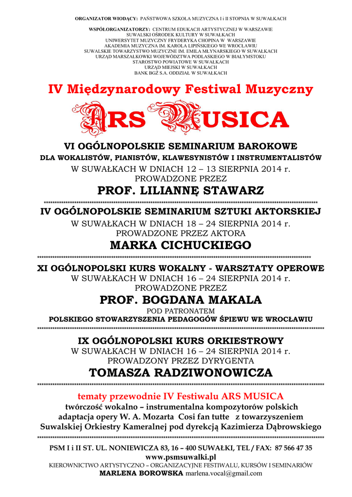 ORGANIZATOR WIODĄCY: PAŃSTWOWA SZKOŁA MUZYCZNA I i II STOPNIA W SUWAŁKACH WSPÓŁORGANIZATORZY: CENTRUM EDUKACJI ARTYSTYCZNEJ W WARSZAWIE SUWALSKI OŚRODEK KULTURY W SUWAŁKACH UNIWERSYTET MUZYCZNY FRYDERYKA CHOPINA W WARSZAWIE AKADEMIA MUZYCZNA IM. KAROLA LIPIŃSKIEGO WE WROCŁAWIU SUWALSKIE TOWARZYSTWO MUZYCZNE IM. EMILA MŁYNARSKIEGO W SUWAŁKACH URZĄD MARSZAŁKOWKI WOJEWÓDZTWA PODLASKIEGO W BIAŁYMSTOKU STAROSTWO POWIATOWE W SUWAŁKACH URZĄD MIEJSKI W SUWAŁKACH BANK BGŻ S.A. ODDZIAŁ W SUWAŁKACH IV Międzynarodowy Festiwal Muzyczny VI OGÓLNOPOLSKIE SEMINARIUM BAROKOWE DLA WOKALISTÓW, PIANISTÓW, KLAWESYNISTÓW I INSTRUMENTALISTÓW W SUWAŁKACH W DNIACH 12 – 13 SIERPNIA 2014 r. PROWADZONE PRZEZ PROF. LILIANNĘ STAWARZ ****************************************************************************************************************************** IV OGÓLNOPOLSKIE SEMINARIUM SZTUKI AKTORSKIEJ W SUWAŁKACH W DNIACH 18 – 24 SIERPNIA 2014 r. PROWADZONE PRZEZ AKTORA MARKA CICHUCKIEGO ****************************************************************************************************************************** XI OGÓLNOPOLSKI KURS WOKALNY - WARSZTATY OPEROWE W SUWAŁKACH W DNIACH 16 – 24 SIERPNIA 2014 r. PROWADZONE PRZEZ PROF. BOGDANA MAKALA POD PATRONATEM POLSKIEGO STOWARZYSZENIA PEDAGOGÓW ŚPIEWU WE WROCŁAWIU ************************************************************************************************************************************ IX OGÓLNOPOLSKI KURS ORKIESTROWY W SUWAŁKACH W DNIACH 16 – 24 SIERPNIA 2014 r. PROWADZONY PRZEZ DYRYGENTA TOMASZA RADZIWONOWICZA ************************************************************************************************************************************ tematy przewodnie IV Festiwalu ARS MUSICA twórczość wokalno – instrumentalna kompozytorów polskich adaptacja opery W. A. Mozarta Cosi fan tutte z towarzyszeniem Suwalskiej Orkiestry Kameralnej pod dyrekcją Kazimierza Dąbrowskiego ************************************************************************************************************************************ PSM I i II ST. UL. NONIEWICZA 83, 16 – 400 SUWAŁKI, TEL / FAX: 87 566 47 35 www.psmsuwalki.pl KIEROWNICTWO ARTYSTYCZNO – ORGANIZACYJNE FESTIWALU, KURSÓW I SEMINARIÓW MARLENA BOROWSKA [email protected]