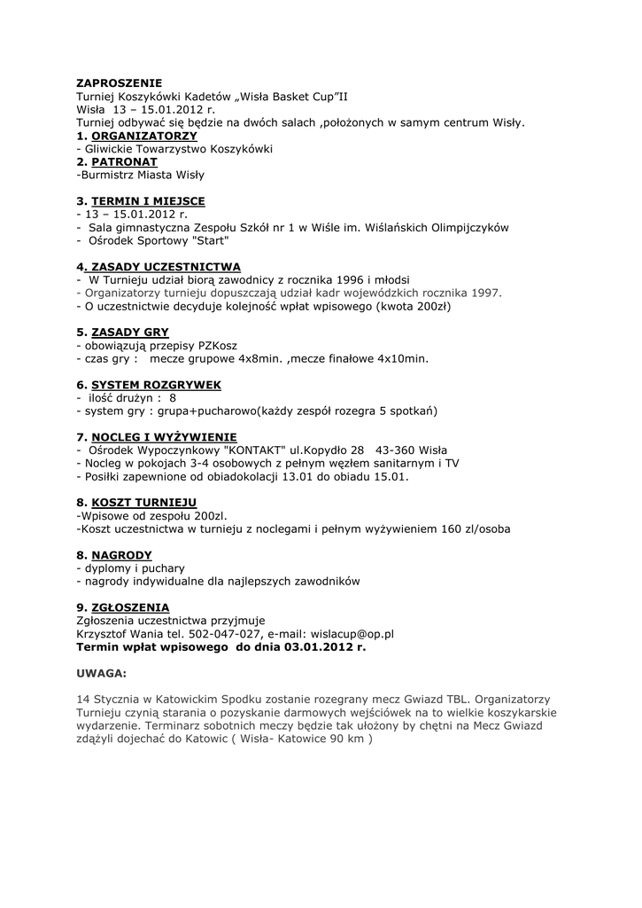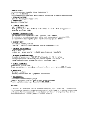 ZAPROSZENIE Turniej Koszykówki Kadetów „Wisła Basket Cup”II Wisła 13 – 15.01.2012 r. Turniej odbywać się będzie na dwóch salach ,położonych w samym centrum Wisły. 1. ORGANIZATORZY - Gliwickie Towarzystwo Koszykówki 2. PATRONAT -Burmistrz Miasta Wisły 3. TERMIN I MIEJSCE - 13 – 15.01.2012 r. - Sala gimnastyczna Zespołu Szkół nr 1 w Wiśle im. Wiślańskich Olimpijczyków - Ośrodek Sportowy "Start" 4. ZASADY UCZESTNICTWA - W Turnieju udział biorą zawodnicy z rocznika 1996 i młodsi - Organizatorzy turnieju dopuszczają udział kadr wojewódzkich rocznika 1997. - O uczestnictwie decyduje kolejność wpłat wpisowego (kwota 200zł) 5. ZASADY GRY - obowiązują przepisy PZKosz - czas gry : mecze grupowe 4x8min. ,mecze finałowe 4x10min. 6. SYSTEM ROZGRYWEK - ilość drużyn : 8 - system gry : grupa+pucharowo(każdy zespół rozegra 5 spotkań) 7. NOCLEG I WYŻYWIENIE - Ośrodek Wypoczynkowy "KONTAKT" ul.Kopydło 28 43-360 Wisła - Nocleg w pokojach 3-4 osobowych z pełnym węzłem sanitarnym i TV - Posiłki zapewnione od obiadokolacji 13.01 do obiadu 15.01. 8. KOSZT TURNIEJU -Wpisowe od zespołu 200zl. -Koszt uczestnictwa w turnieju z noclegami i pełnym wyżywieniem 160 zl/osoba 8. NAGRODY - dyplomy i puchary - nagrody indywidualne dla najlepszych zawodników 9. ZGŁOSZENIA Zgłoszenia uczestnictwa przyjmuje Krzysztof Wania tel. 502-047-027, e-mail: [email protected] Termin wpłat wpisowego do dnia 03.01.2012 r. UWAGA: 14 Stycznia w Katowickim Spodku zostanie rozegrany mecz Gwiazd TBL. Organizatorzy Turnieju czynią starania o pozyskanie darmowych wejściówek na to wielkie koszykarskie wydarzenie. Terminarz sobotnich meczy będzie tak ułożony by chętni na Mecz Gwiazd zdążyli dojechać do Katowic ( Wisła- Katowice 90 km )