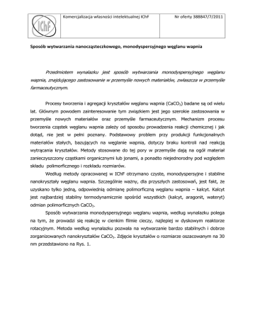 Komercjalizacja własności intelektualnej IChF Nr oferty 388847/7/2011 Sposób wytwarzania nanocząsteczkowego, monodyspersyjnego węglanu wapnia Przedmiotem wynalazku jest sposób wytwarzania monodyspersyjnego węglanu wapnia, znajdującego zastosowanie w przemyśle nowych materiałów, zwłaszcza w przemyśle farmaceutycznym. Procesy tworzenia i agregacji kryształów węglanu wapnia (CaCO3) badane są od wielu lat. Głównym powodem zainteresowanie tym związkiem jest jego szerokie zastosowania w przemyśle nowych materiałów oraz przemyśle farmaceutycznym. Mechanizm procesu tworzenia cząstek węglanu wapnia zależy od sposobu prowadzenia reakcji chemicznej i jak dotąd, nie jest w pełni poznany. Podstawowy problem przy produkcji funkcjonalnych materiałów stałych, bazujących na węglanie wapnia, dotyczy braku kontroli nad reakcją wytrącania kryształów. Metody stosowane do tej pory w przemyśle dają na ogół materiał zanieczyszczony cząstkami organicznymi lub jonami, a ponadto niejednorodny pod względem składu polimorficznego i rozkładu rozmiarów. Według metody opracowanej w IChF otrzymano czyste, monodyspersyjne i stabilne nanokryształy węglanu wapnia. Szczególnie ważny, dla przyszłych zastosowań, jest fakt, że uzyskano tylko jedną, odpowiednią odmianę polimorficzną węglanu wapnia – kalcyt. Kalcyt jest najbardziej stabilny termodynamicznie spośród wszystkich (kalcyt, aragonit, wateryt) odmian polimorficznych CaCO3. Sposób wytwarzania monodyspersyjnego węglanu wapnia, według wynalazku polega na tym, że prowadzi się reakcję w cienkim filmie cieczy, najlepiej w dyskowym reaktorze rotacyjnym. Metoda według wynalazku pozwala na wytwarzanie bardzo stabilnych i dobrze zorganizowanych nanokryształów CaCO3. Zdjęcie kryształów o rozmiarze oszacowanym na 30 nm przedstawiono na Rys. 1. Komercjalizacja własności intelektualnej IChF Nr oferty 388847/7/2011 Rys. 1. Mikrograficzny obraz nanokryształów węglanu wapnia otrzymanych sposobem według wynalazku Kontakt z twórcą wynalazku Prof. dr hab. Paweł Gierycz – tel. (22) 343 3288; [email protected] Kontakt z pełnomocnikiem ds. Wdrożeń i Patentów Marcin Izydorzak – tel. (22) 343 3239 lub (22) 343 3072; [email protected]