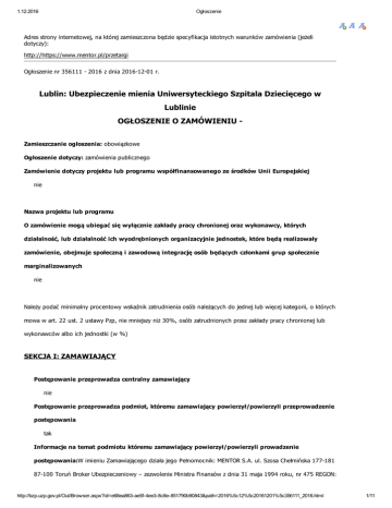 1.12.2016 Ogłoszenie Adres strony internetowej, na której zamieszczona będzie specyfikacja istotnych warunków zamówienia (jeżeli dotyczy): http://https://www.mentor.pl/przetargi Ogłoszenie nr 356111 2016 z dnia 20161201 r. Lublin: Ubezpieczenie mienia Uniwersyteckiego Szpitala Dziecięcego w Lublinie OGŁOSZENIE O ZAMÓWIENIU Zamieszczanie ogłoszenia: obowiązkowe Ogłoszenie dotyczy: zamówienia publicznego Zamówienie dotyczy projektu lub programu współfinansowanego ze środków Unii Europejskiej nie Nazwa projektu lub programu O zamówienie mogą ubiegać się wyłącznie zakłady pracy chronionej oraz wykonawcy, których działalność, lub działalność ich wyodrębnionych organizacyjnie jednostek, które będą realizowały zamówienie, obejmuje społeczną i zawodową integrację osób będących członkami grup społecznie marginalizowanych nie Należy podać minimalny procentowy wskaźnik zatrudnienia osób należących do jednej lub więcej kategorii, o których mowa w art. 22 ust. 2 ustawy Pzp, nie mniejszy niż 30%, osób zatrudnionych przez zakłady pracy chronionej lub wykonawców albo ich jednostki (w %) SEKCJA I: ZAMAWIAJĄCY Postępowanie przeprowadza centralny zamawiający nie Postępowanie przeprowadza podmiot, któremu zamawiający powierzył/powierzyli przeprowadzenie postępowania tak Informacje na temat podmiotu któremu zamawiający powierzył/powierzyli prowadzenie postępowania:W imieniu Zamawiającego działa jego Pełnomocnik: MENTOR S.A. ul. Szosa Chełmińska 177181 87100 Toruń Broker Ubezpieczeniowy – zezwolenie Ministra Finansów z dnia 31 maja 1994 roku, nr 475 REGON: http://bzp.uzp.gov.pl/Out/Browser.aspx?id=e68ea863ae5f4ee38c8e851790b90843&path=2016%5c12%5c20161201%5c356111_2016.html 1/11 1.12.2016 Ogłoszenie 870245914 NIP: 9560003240 Wpisany do rejestru przedsiębiorców prowadzonego przez Sąd Rejonowy w Toruniu, VII Wydział Gospodarczy Krajowego Rejestru Sądowego pod nr KRS 0000031423, opłaconym w całości kapitale zakładowym w wysokości 706 200 zł Tel.: 56 669 33 00 Fax: 56 669 33 04/05 Strona WWW: http://www.mentor.pl Postępowanie jest przeprowadzane wspólnie przez zamawiających nie Jeżeli tak, należy wymienić zamawiających, którzy wspólnie przeprowadzają postępowanie oraz podać adresy ich siedzib, krajowe numery identyfikacyjne oraz osoby do kontaktów wraz z danymi do kontaktów: Postępowanie jest przeprowadzane wspólnie z zamawiającymi z innych państw członkowskich Unii Europejskiej nie W przypadku przeprowadzania postępowania wspólnie z zamawiającymi z innych państw członkowskich Unii Europejskiej – mające zastosowanie krajowe prawo zamówień publicznych: Informacje dodatkowe: I. 1) NAZWA I ADRES: Uniwersytecki Szpital Dziecięcy w Lublinie, krajowy numer identyfikacyjny 43004054100000, ul. ul. prof. Antoniego Gębali 6, 20093 Lublin, woj. lubelskie, państwo Polska, tel. 817 185 125, email [email protected], faks 817 185 125. Adres strony internetowej (URL): www.usdlublin.pl i www.mentor.pl I. 2) RODZAJ ZAMAWIAJĄCEGO: Inny: Samodziely Publiczny Załad Opieki Zdrowotnej I.3) WSPÓLNE UDZIELANIE ZAMÓWIENIA (jeżeli dotyczy): Podział obowiązków między zamawiającymi w przypadku wspólnego przeprowadzania postępowania, w tym w przypadku wspólnego przeprowadzania postępowania z zamawiającymi z innych państw członkowskich Unii Europejskiej (który z zamawiających jest odpowiedzialny za przeprowadzenie postępowania, czy i w jakim zakresie za przeprowadzenie postępowania odpowiadają pozostali zamawiający, czy zamówienie będzie udzielane przez każdego z zamawiających indywidualnie, czy zamówienie zostanie udzielone w imieniu i na rzecz pozostałych zamawiających): I.4) KOMUNIKACJA: Nieograniczony, pełny i bezpośredni dostęp do dokumentów z postępowania można uzyskać pod adresem (URL) tak https://www.mentor.pl/przetargi http://bzp.uzp.gov.pl/Out/Browser.aspx?id=e68ea863ae5f4ee38c8e851790b90843&path=2016%5c12%5c20161201%5c356111_2016.html 2/11 1.12.2016 Ogłoszenie Adres strony internetowej, na której zamieszczona będzie specyfikacja istotnych warunków zamówienia tak https://www.mentor.pl/przetargi Dostęp do dokumentów z postępowania jest ograniczony więcej informacji można uzyskać pod adresem nie Oferty lub wnioski o dopuszczenie do udziału w postępowaniu należy przesyłać: Elektronicznie nie adres Dopuszczone jest przesłanie ofert lub wniosków o dopuszczenie do udziału w postępowaniu w inny sposób: nie Wymagane jest przesłanie ofert lub wniosków o dopuszczenie do udziału w postępowaniu w inny sposób: tak Inny sposób: w wersji pisemnej, osobiście, za pośrednictwem operatora pocztowego, kuriera Adres: Mentor S.A., ul. Szosa Chełmińska 177181, 87100 Toruń Komunikacja elektroniczna wymaga korzystania z narzędzi i urządzeń lub formatów plików, które nie są ogólnie dostępne nie Nieograniczony, pełny, bezpośredni i bezpłatny dostęp do tych narzędzi można uzyskać pod adresem: (URL) SEKCJA II: PRZEDMIOT ZAMÓWIENIA II.1) Nazwa nadana zamówieniu przez zamawiającego: Ubezpieczenie mienia Uniwersyteckiego Szpitala http://bzp.uzp.gov.pl/Out/Browser.aspx?id=e68ea863ae5f4ee38c8e851790b90843&path=2016%5c12%5c20161201%5c356111_2016.html 3/11 1.12.2016 Ogłoszenie Dziecięcego w Lublinie Numer referencyjny: U2/2016 Przed wszczęciem postępowania o udzielenie zamówienia przeprowadzono dialog techniczny nie II.2) Rodzaj zamówienia: II.3) Informacja o możliwości składania ofert częściowych Zamówienie podzielone jest na części: Nie II.4) Krótki opis przedmiotu zamówienia (wielkość, zakres, rodzaj i ilość dostaw, usług lub robót budowlanych lub określenie zapotrzebowania i wymagań ) a w przypadku partnerstwa innowacyjnego określenie zapotrzebowania na innowacyjny produkt, usługę lub roboty budowlane: Przedmiotem zamówienia jest ubezpieczenie mienia Uniwersyteckiego Szpitala Dziecięcego w Lublinie. Przedmiot zamówienia obejmu