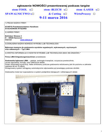zgłoszenie NOWOŚCI prezentowanej podczas targów stom-TOOL x□ stom -BLECH x□ stom -LASER x□ SPAWALNICTWO x□ & Cutting x□ WirtoProcesy □ 9-11 marca 2016 1) PEŁNA NAZWA FIRMY: STARYS Przedstawicielstwo Handlowe STACHOWIAK RYSZARD 2) ADRES FIRMY: Bollnäser Strasse 2 D – 30629 Hannover Internet www.starys.pl 3) DOKŁADNA NAZWA NOWEGO WYROBU LUB TECHNOLOGII: Bębnowa maszyna do gratowania wyrobów wypalanych, wykrawanych, wycinanych oraz odlewanych – Typ LIMA 4) KRÓTKA INFORMACJA O NOWYM WYROBIE LUB TECHNOLOGII (MAX 350 ZNAKÓW) * Firma LIMA Entgratungsmaschinen przedstawia: Gratowarka bębnowa LIMA – gratuje, zaokrągla krawędzie, oczyszcza powierzchnie, usuwa zgorzelinę, korozję, oraz odtłuszcza detale. Dzięki zamkniętej konstrukcji, hałas emitowany podczas gratowania redukowany jest do poziomu w zakresie zaledwie 68 do 76 dB(A). Zintegrowany system odciągowy automatycznie odprowadza pył powstający podczas obróbki. Gratowarka może być wyposażona w system podajników ładujących i odbierających detale 1