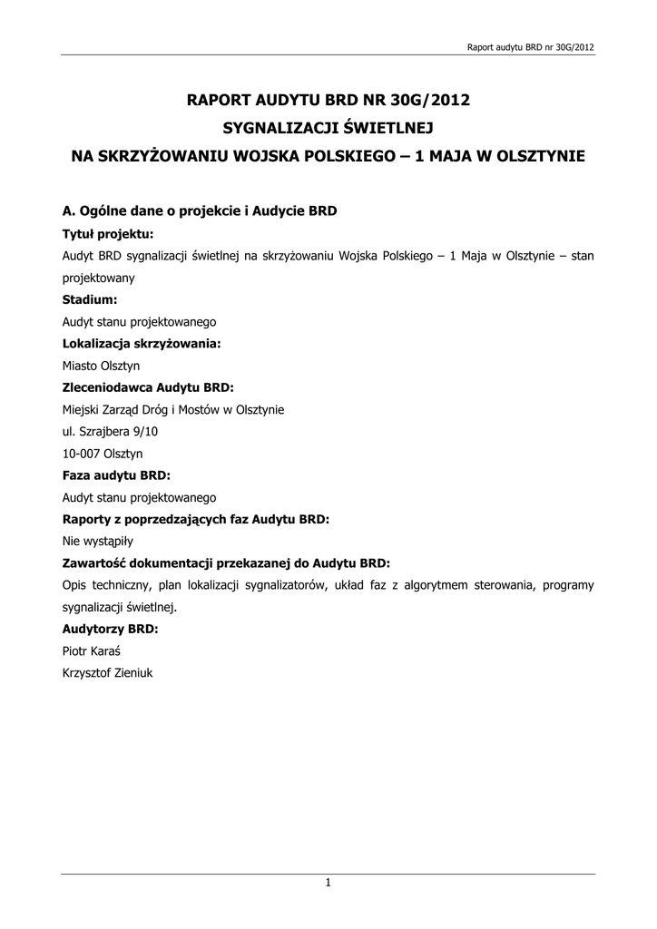 Raport audytu BRD nr 30G/2012 RAPORT AUDYTU BRD NR 30G/2012 SYGNALIZACJI ŚWIETLNEJ NA SKRZYŻOWANIU WOJSKA POLSKIEGO – 1 MAJA W OLSZTYNIE A. Ogólne dane o projekcie i Audycie BRD Tytuł projektu: Audyt BRD sygnalizacji świetlnej na skrzyżowaniu Wojska Polskiego – 1 Maja w Olsztynie – stan projektowany Stadium: Audyt stanu projektowanego Lokalizacja skrzyżowania: Miasto Olsztyn Zleceniodawca Audytu BRD: Miejski Zarząd Dróg i Mostów w Olsztynie ul. Szrajbera 9/10 10-007 Olsztyn Faza audytu BRD: Audyt stanu projektowanego Raporty z poprzedzających faz Audytu BRD: Nie wystąpiły Zawartość dokumentacji przekazanej do Audytu BRD: Opis techniczny, plan lokalizacji sygnalizatorów, układ faz z algorytmem sterowania, programy sygnalizacji świetlnej. Audytorzy BRD: Piotr Karaś Krzysztof Zieniuk 1 Raport audytu BRD nr 30G/2012 B. Szczegółowe dane o stanie istniejącym 1. Charakterystyka skrzyżowania i krzyżujących się dróg: a) Klasa i funkcja krzyżujących się dróg: ul. Wojska Polskiego ul. 1 Maja b) dozwolona przepisami prędkość ul. Wojska Polskiego – 50 km/h / 60 km/h ul. 1 Maja – 50 km/h / 60 km/h c) szkic planu sytuacyjnego 2 Raport audytu BRD nr 30G/2012 C. Ocena Audytora BRD Problem Nr 1 2 3 4 5 1. Geometria skrzyżowania z sygnalizacją 6 7 8 9 10 11 2. Sygnalizacja świetlna 1 2 3 Pytanie kontrolne Czy lokalizacja skrzyżowania jest korzystna pod względem BRD z uwagi na ukształtowanie dróg; Czy wlot nie jest zlokalizowany na łuku po wewnętrznej stronie? Czy lokalizacja skrzyżowania jest korzystna z uwagi na ukształtowanie niwelety; czy nie jest to lokalizacja na łuku pionowym wypukłym? Czy lokalizacja skrzyżowania na łuku poziomym lub pionowym nie powoduje wyraźnych zagrożeń BRD? Czy geometria skrzyżowania nie obejmuje zbyt dużych poszerzeń wlotów (zwiększenia liczb pasów ruchu)? Czy dodane na wlotach pasy na wprost nie musza być likwidowane bezpośrednio na wylotach? Czy występują wjazdy w obszarze skrzyżowania i czy mogą one zagrażać BRD? Czy linie zatrzymań nie są zlokalizowane zbyt daleko, powodując niepotrzebne wydłużenie dróg ewakuacji pojazdów przy zmianie faz? Czy pasy na wylocie są jednoznacznym przedłużeniem pasów na wlocie? Czy kolizje relacji skrętnych z pieszymi na wlotach i wylotach są rozwiązane bezpiecznie? Czy nie dotyczą skrętów z dwóch pasów ruchu? Czy na skrzyżowaniu nie pozostawiono zbyt długich przejść dla pieszych bez wysp azylu, powodując zbyt długie czasy ewakuacji? Czy geometria skrzyżowania umożliwia jego eksploatację bez sygnalizacji? Czy występują problemy związane z sąsiedztwem innych skrzyżowań (strefy akumulacji, przeplatanie, oznakowanie, czytelność sygnalizatorów)? Czy prawidłowo przyjęto wzajemną kolizyjność relacji w programach sygnalizacji? Czy realizowany na skrzyżowaniu układ faz sterowania zagraża BRD? Czy w programie sygnalizacji uwzględniono bezkolizyjne fazy dla relacji w lewo? Jeśli nie to, czy powinny być uwzględnione? 3 Odpowiedź TAK Komentarz TAK TAK TAK NIE NIE NIE TAK NIE TAK TAK NIE NIE NIE NIE TAK NIE TAK Nie zagraża BRD Raport audytu BRD nr 30G/2012 Problem Nr 4 5 6 7 8 9 10 11 12 13 14 15 3. Przekrój poprzeczny 1 2 3 4 Pytanie kontrolne Czy poprawnie uwzględniono potrzeby i BRD pieszych i rowerzystów? Czy długości sygnałów zielonych i czasów ewakuacji są odpowiednie? Czy piesi przechodzą w jednym cyklu czy etapowo? Czy każda z części przejścia ma odpowiednie długości sygnałów i sygnalizatory? Czy prawidłowo uwzględniono potrzeby specjalnych użytkowników (np. słabo widzący)? Czy sygnalizacja jest dobrze rozpoznawalna? Czy sygnalizatory są dobrze widoczne? Czy wszystkie strumienie ruchu są objęte sygnalizacją (w tym skręty w prawo)? Czy zapewniono w przypadku strumieni o wzajemnej dopuszczalnej kolizji dojazd/dojście do punktu kolizji strumienia nadrzędnego przed strumieniem podporządkowanym? Czy realizacja „zielonej strzałki” stwarza zagrożenie dla BRD? Czy zapewniona jest widoczność końca kolejki pojazdów? Czy wskazane jest uwzględnienie przesunięć sygnałów zielonych dla pieszych i dla rowerzystów? Czy jest potrzebne i przewidziane uprzedzające ostrzeganie przed odosobnioną sygnalizacją? Czy ewentualne wjazdy z zabudowy w obrębie skrzyżowania są uwzględnione w programie sygnalizacji? Czy przyjęto prawidłowe długości czasów międzyzielonych? Czy uwzględniono w przekroju wszystkie niezbędne dla danych warunków elementy, w tym: chodniki, ścieżki rowerowe, pasy dzielące w środku? Czy miejsca oczekiwania, w szczególności wyspy azylu zapewniają dostatecznie dużą powierzchnie dla pieszych i rowerzystów? Czy zapewnione jest sprawne odprowadzenie wody z obszaru wlotów i tarczy skrzyżowania? Czy występują drzewa w przekroju lub w pobliżu drogi i mogą one zagrażać pojazdom, które wskutek poślizgu wypadną z drogi? 4 Odpowiedź Komentarz TAK TAK TAK Nie dotyczy TAK TAK TAK TAK NIE TAK NIE NIE Nie dotyczy TAK TAK TAK Nie dotyczy Nie dotyczy Piesi przechodzą w jednym cyklu Raport audytu BRD nr 30G/2012 Problem Nr 5 6 7 1 2 3 4 5 4. Widoczność, dostrzegalność i czytelność skrzyżowania 6 7 8 9 10 Pytanie kontrolne Czy elementy przekroju poprzecznego (np. bariery, znaki, zieleń, parkowanie w zatokach) nie powodują ograniczeń widoczności, zwłaszcza w relacji kierowca/pieszy? Czy rozwój istniejącej zieleni nie spowoduje ograniczeń widoczności i zagrożeń na jezdni (liście, kruche i łamliwe gałęzie, inne zawilgocenie)? Czy istniejące stałe przeszkody są zabezpieczone lub zlokalizowane dostatecznie daleko od krawędzi jezdni? Czy stałe elementy przekroju nie będą powodować ograniczeń widoczności? Czy mogą wystąpić zagrożenia ograniczeń pól widoczności? Czy znaki drogowe i sygnały sygnalizacji mogą być zasłaniane przez stałe lub tymczasowe przeszkody (np. parkujące pojazdy, drzewa)? Czy znaki drogowe i sygnały sygnalizac