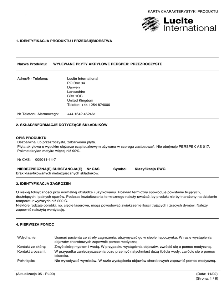KARTA CHARAKTERYSTYKI PRODUKTU 1. IDENTYFIKACJA PRODUKTU I PRZEDSIĘBIORSTWA Nazwa Produktu: WYLEWANE PŁYTY AKRYLOWE PERSPEX: PRZEZROCZYSTE Adres/Nr Telefonu: Lucite International PO Box 34 Darwen Lancashire BB3 1QB United Kingdom Telefon: +44 1254 874000 Nr Telefonu Alarmowego: +44 1642 452461 2. SKŁAD/INFORMACJE DOTYCZĄCE SKŁADNIKÓW OPIS PRODUKTU Bezbarwna lub przezroczysta, zabarwiona płyta. Płyta akrylowa o wysokim ciężarze cząsteczkowym używana w szeregu zastosowań. Nie obejmuje PERSPEX AS 017. Polimetakrylan metylu: więcej niż 90%. Nr CAS: 009011-14-7 NIEBEZPIECZNA(E) SUBSTANCJA(E) Nr CAS Brak klasyfikowanych niebezpiecznych składników. Symbol Klasyfikacja EWG 3. IDENTYFIKACJA ZAGROŻEŃ O niskiej toksyczności przy normalnej obsłudze i użytkowaniu. Rozkład termiczny spowoduje powstanie trujących, drażniących i palnych oparów. Podczas kształtowania termicznego należy uważać, by produkt nie był narażony na działanie temperatur wyższych niż 200 C. Niektóre rodzaje obróbki, np. cięcie laserowe, mogą powodować zwiększenie ilości trujących i żrących dymów. Należy zapewnić należytą wentylację. 4. PIERWSZA POMOC Wdychanie: Kontakt ze skórą: Kontakt z oczami: Połknięcie: Usunąć pacjenta ze strefy zagrożenia, utrzymywać go w cieple i spoczynku. W razie wystąpienia objawów chorobowych zapewnić pomoc medyczną. Zmyć skórę mydłem i wodą. W przypadku wystąpienia objawów, zwrócić się o pomoc medyczną. W przypadku zanieczyszczenia oczu przemyć natychmiast dużą ilością wody, zwrócic się o pomoc lekarska. Nie wywoływać wymiotów. W razie wystąpienia objawów chorobowych zapewnić pomoc medyczną. (Aktualizacja 05 - PL00) (Data: 11/02) (Strona: 1 / 6) KARTA CHARAKTERYSTYKI PRODUKTU Nazwa Produktu: WYLEWANE PŁYTY AKRYLOWE PERSPEX: PRZEZROCZYSTE Dalsza Opieka Medyczna Leczenie objawowe i terapia pomocnicza, według wskazań. 5. POSTĘPOWANIE W PRZYPADKU POŻARU Spalanie powoduje wydzielanie trujących, drażniących i palnych oparów. Środki Gaśnicze: Sprzęt Przeciwpożarowy: rozpylona woda, piana, suchy proszek lub CO2. W razie pożaru należy nosić niezależny aparat oddechowy i odpowiedni ubiór ochronny. 6. POSTĘPOWANIE W PRZYPADKU UWOLNIENIA Drobne wióry i kurz należy zbierać i przekazywać do odpadów w bezpieczny sposób. 7. OBCHODZENIE SIĘ Z PRODUKTEM I MAGAZYNOWANIE 7.1. OBCHODZENIE SIĘ Z PRODUKTEM Płyty te są ciężkie i nieporęczne. Należy obchodzić się z nimi ostrożnie, szczególnie w miejscach wietrznych lub na zewnątrz. W razie złamania lub odłupania, powstałe krawędzie mogą być ostre i powodować skaleczenia skóry i oczu. Zastosować środki ostrożności – uwaga na wyładowania elektrostatyczne Zagrożenia Procesowe Wszystkie polimery ulegają degradacji do pewnego stopnia w temperaturze przetwarzania i efekt ten narasta ze wzrostem temperatury. W normalnych warunkach, gdy temperatury kształtowania termicznego nie przekroczą 200 stopni C, produkty rozkładu termicznego będą zawierać metakrylan metylu. Niektóre rodzaje obróbki, np. cięcie laserowe, mogą powodować zwiększenie ilości trujących i żrących dymów. Należy zapewnić należytą wentylację. 7.2. MAGAZYNOWANIE Nie przechowywać w bardzo ciepłym miejscu. Przechowywać pionowo na ramach A. Temperatura Przechowywania: Czas Przechowywania: poniżej 40 °C Nieokreślony w podanych warunkach przechowywania 8. KONTROLE NARAŻENIA / OCHRONA OSOBISTA Należy zapewnić odpowiednią wentylację, wraz ze stosownym miejscowym wyciągiem, jeżeli możliwe jest powstanie pyłów, dymów lub oparów. Należy rozważyć metody pracy i potencjalny zakres zagrożenia ponieważ mogą one określić czy niezbędny jest wyższy poziom ochrony. Należy stosować miejscowy wyciąg w pobliżu głowicy tnącej przy cięciu laserem. Tam gdzie odpowiednie elementy regulacji nie są zainstalowane lub są niewystarczające, należy nosić odpowiedni sprzęt ochronny. Poniższe informacje podano jako ogólne wytyczne (Aktualizacja 05 - PL00) (Data: 11/02) (Strona: 2 / 6) KARTA CHARAKTERYSTYKI PRODUKTU Nazwa Produktu: WYLEWANE PŁYTY AKRYLOWE PERSPEX: PRZEZROCZYSTE Aparaty Oddechowe: Ochrona Oczu: Rękawiczki: Inne: STANDARDOWE OBCHODZENIE SIĘ: Zwykle nie wymagany Proces technologiczny: Kurz: Może być stosowna odpowiednia maska przeciwpyłowa lub respirator pyłowy z filtrem typu P. (EN141/EN143). Opar: Jeżeli prawdopodobne są wysokie poziomy powyżej granicy narażenia zawodowego Może być stosowna odpowiednia maska z filtrem typu A. (EN141/EN143). Należy nosić osłonę na oczy/twarz. Okulary ochronne/pełna osłona na twarz. Ostre krawędzie mogą powodować zranienia. Nosić odpowiednie rękawice. Nosić odpowiednią odzież ochronną. Informacje odnośnie zagrożeń technologicznych znajdują się w rozdz.7, „Obchodzenie się z produktem i Magazynowanie". Poniższe wartości odnoszą się do substancji, które mogą powstać w wyniku obróbki termicznej NIEBEZPIECZNA(E) SUBSTANCJA(E) LTEL 8hr TWA STEL STEL Notes ppm mg/mł ppm mg/mł Metakrylan metylu 50 208 100 416 COM COM: Firma zamierza kontrolować oddziaływanie w miejscu pracy do tej granicy 9. WŁAŚCIWOŚCI FIZYKOCHEMICZNE Postać: Barwa: Wartość pH: Temperatura Wrzenia (st C): Temperatura Topnienia (st C): Punkt Zapłonu (st C): Granice Zapalności: Temperatura Samozapłonu (st C): Własności Wybuchowe: Własności Utleniające: Ciśnienie Pary (mm Hg): Ciśnienie Pary (Pa): Gęstość (g/ml): Rozpuszczalność (woda): Rozpuszczalność (inne rozpuszczalniki): Współczynnik Podziału: Temperatura Rozkładu (st C): Temperatura Krzepnięcia (st C): Temperatura Mięknienia (st C): Lepkość (mPa.s): (Aktualizacja 05 - PL00) płyta bezbarwna lub zabarwiona Nie ma zastosowania Nie ma zastosowania Nie ma zastosowania 11.5 (MMA) Płyta nie ma temperatury zapłonu Nie ma zastosowania 421 (MMA) Niewybuchowy Nie utleniający Nie ma zastosowania Nie ma zastosowania 1.19 n
