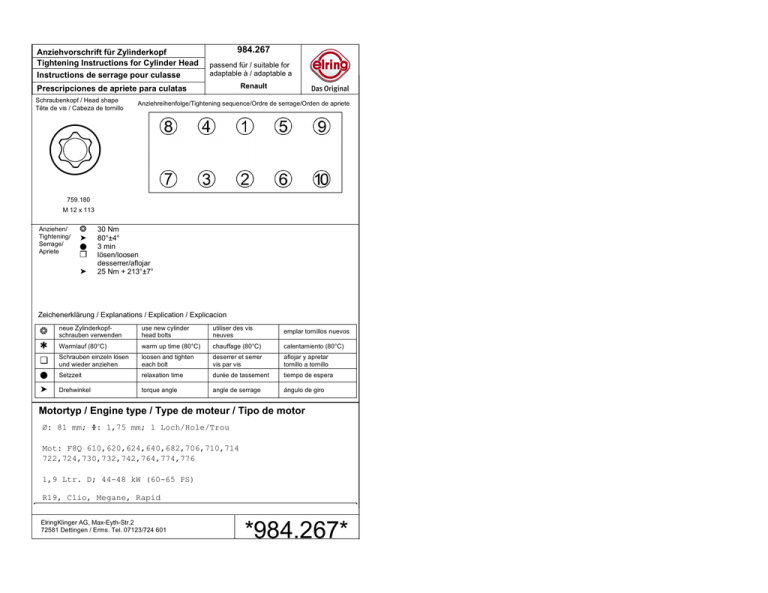Anziehvorschrift für Zylinderkopf Tightening Instructions for Cylinder Head Instructions de serrage pour culasse 984.267 passend für / suitable for adaptable à / adaptable a Renault Prescripciones de apriete para culatas Schraubenkopf / Head shape Tête de vis / Cabeza de tornillo Anziehreihenfolge/Tightening sequence/Ordre de serrage/Orden de apriete 759.180 M 12 x 113 Anziehen/ Tightening/ Serrage/ Apriete ❂ ➤ ● ❐ ➤ 30 Nm 80°±4° 3 min lösen/loosen desserrer/aflojar 25 Nm + 213°±7° Zeichenerklärung / Explanations / Explication / Explicacion ❂ neue Zylinderkopfschrauben verwenden use new cylinder head bolts utiliser des vis neuves emplar tornillos nuevos ✱ Warmlauf (80°C) warm up time (80°C) chauffage (80°C) calentamiento (80°C) ❏ Schrauben einzeln lösen und wieder anziehen loosen and tighten each bolt deserrer et serrer vis par vis aflojar y apretar tornillo a tornillo ● Setzzeit relaxation time durée de tassement tiempo de espera ➤ Drehwinkel torque angle angle de serrage ángulo de giro Motortyp / Engine type / Type de moteur / Tipo de motor Ø: 81 mm; ¿: 1,75 mm; 1 Loch/Hole/Trou Mot: F8Q 610,620,624,640,682,706,710,714 722,724,730,732,742,764,774,776 1,9 Ltr. D; 44-48 kW (60-65 PS) R19, Clio, Megane, Rapid ElringKlinger AG, Max-Eyth-Str.2 72581 Dettingen / Erms. Tel. 07123/724 601 *984.267*