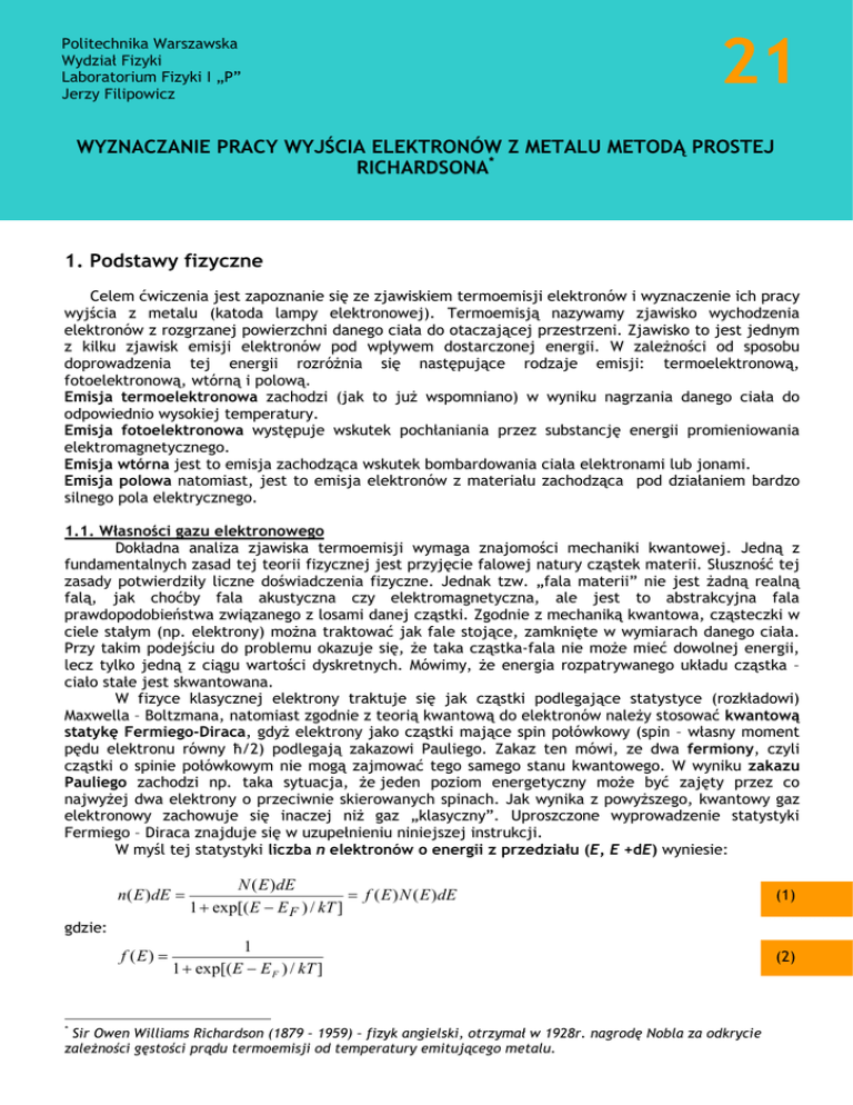21 Politechnika Warszawska Wydział Fizyki Laboratorium Fizyki I „P” Jerzy Filipowicz WYZNACZANIE PRACY WYJŚCIA ELEKTRONÓW Z METALU METODĄ PROSTEJ RICHARDSONA* * 1. Podstawy fizyczne Celem ćwiczenia jest zapoznanie się ze zjawiskiem termoemisji elektronów i wyznaczenie ich pracy wyjścia z metalu (katoda lampy elektronowej). Termoemisją nazywamy zjawisko wychodzenia elektronów z rozgrzanej powierzchni danego ciała do otaczającej przestrzeni. Zjawisko to jest jednym z kilku zjawisk emisji elektronów pod wpływem dostarczonej energii. W zaleŜności od sposobu doprowadzenia tej energii rozróŜnia się następujące rodzaje emisji: termoelektronową, fotoelektronową, wtórną i polową. Emisja termoelektronowa zachodzi (jak to juŜ wspomniano) w wyniku nagrzania danego ciała do odpowiednio wysokiej temperatury. Emisja fotoelektronowa występuje wskutek pochłaniania przez substancję energii promieniowania elektromagnetycznego. Emisja wtórna jest to emisja zachodząca wskutek bombardowania ciała elektronami lub jonami. Emisja polowa natomiast, jest to emisja elektronów z materiału zachodząca pod działaniem bardzo silnego pola elektrycznego. 1.1. Własności gazu elektronowego Dokładna analiza zjawiska termoemisji wymaga znajomości mechaniki kwantowej. Jedną z fundamentalnych zasad tej teorii fizycznej jest przyjęcie falowej natury cząstek materii. Słuszność tej zasady potwierdziły liczne doświadczenia fizyczne. Jednak tzw. „fala materii” nie jest Ŝadną realną falą, jak choćby fala akustyczna czy elektromagnetyczna, ale jest to abstrakcyjna fala prawdopodobieństwa związanego z losami danej cząstki. Zgodnie z mechaniką kwantowa, cząsteczki w ciele stałym (np. elektrony) moŜna traktować jak fale stojące, zamknięte w wymiarach danego ciała. Przy takim podejściu do problemu okazuje się, Ŝe taka cząstka-fala nie moŜe mieć dowolnej energii, lecz tylko jedną z ciągu wartości dyskretnych. Mówimy, Ŝe energia rozpatrywanego układu cząstka – ciało stałe jest skwantowana. W fizyce klasycznej elektrony traktuje się jak cząstki podlegające statystyce (rozkładowi) Maxwella – Boltzmana, natomiast zgodnie z teorią kwantową do elektronów naleŜy stosować kwantową statykę Fermiego-Diraca, gdyŜ elektrony jako cząstki mające spin połówkowy (spin – własny moment pędu elektronu równy ħ/2) podlegają zakazowi Pauliego. Zakaz ten mówi, ze dwa fermiony, czyli cząstki o spinie połówkowym nie mogą zajmować tego samego stanu kwantowego. W wyniku zakazu Pauliego zachodzi np. taka sytuacja, Ŝe jeden poziom energetyczny moŜe być zajęty przez co najwyŜej dwa elektrony o przeciwnie skierowanych spinach. Jak wynika z powyŜszego, kwantowy gaz elektronowy zachowuje się inaczej niŜ gaz „klasyczny”. Uproszczone wyprowadzenie statystyki Fermiego – Diraca znajduje się w uzupełnieniu niniejszej instrukcji. W myśl tej statystyki liczba n elektronów o energii z przedziału (E, E +dE) wyniesie: n( E )dE = N ( E )dE = f ( E ) N ( E )dE 1 + exp[( E − E F ) / kT ] (1) gdzie: f (E) = * 1 1 + exp[(E − E F ) / kT ] Sir Owen Williams Richardson (1879 – 1959) – fizyk angielski, otrzymał w 1928r. nagrodę Nobla za odkrycie zaleŜności gęstości prądu termoemisji od temperatury emitującego metalu. (2) Wyznaczanie pracy wyjścia elektronów z metalu metodą Richardsona 2 jest funkcją rozkładu Fermiego-Diraca określającą prawdopodobieństwo obsadzenia przez elektron poziomu o energii E. EF oznacza energię (poziom) Fermiego. N(E)dE – jest liczbą moŜliwych stanów energetycznych elektronu leŜących w przedziale energii E, E+dE; k – stała Boltzmana, T – temperatura ciała. Kształt funkcji rozkładu f(E) i funkcji n(E) przedstawia rysunek 1. Dla poziomu obsadzonego przez dwa elektrony – f(E) = 1, przez jeden – f(E) = ½ a dla pustego f(E) = 0. W temperaturze 0 K elektrony obsadzają moŜliwe najniŜsze dozwolone poziomy energetyczne, a więc od najniŜszych do coraz wyŜszych. W tej temperaturze (0 K) najwyŜszym obsadzonym poziomem jest poziom energii Fermiego EF. Poziomy wyŜsze od poziomu Fermiego są nieobsadzone, czyli f(E) = 0. a) f(E) f(E) T=0K 1 T>0K kT 1 1/2 1/2 kT 0 0 E F b) n(E) EF E n(E) T=0K 0 E T>0K E F E 0 E F E Rys.1. a) Funkcja rozkładu Fermiego – Diraca f(E) dla 0 K i dla T > 0 K; b) Funkcja n(E) równa iloczynowi funkcji f(E)N(E) dla 0 K i dla T > 0 K . W temperaturze T > 0 K większość elektronów swobodnych metalu ma nadal energię poniŜej poziomu Fermiego, a tylko niewielki procent elektronów ma energię przewyŜszającą poziom Fermiego. Jak widać z rysunku 1a, dla T = 0 K, gdy E = EF, to f(E) = ½ czyli dla energii Fermiego średnie prawdopodobieństwo obsadzenia poziomu wynosi ½ (jeden elektron na dany poziom). Część elektronów moŜe mieć energię wystarczającą do pokonania naturalnej bariery potencjału przy powierzchni metalu. NaleŜy się spodziewać, Ŝe liczba takich elektronów będzie wzrastała wraz z temperaturą. 1.2. Termoemisja Zakładamy, Ŝe elektrony swobodne stanowią pewnego rodzaju gaz wypełniający objętość metalu i ich energia jest sumą energii kinetycznej i potencjalnej, gdzie energia kinetyczna jest dodatnia a potencjalna ujemna. Powierzchnia metalu, jak wspomniano uprzednio, stanowi barierę potencjału dla elektronów, którą muszą pokonać, jeśli chcą wyrwać się z metalu. Zakładamy teŜ, Ŝe powierzchnia metalu jest gładka i Ŝe poza nią rozciąga się próŜnia. Stany energetyczne poniŜej poziomu Fermiego są w zdecydowanej większości obsadzone; obsadzenie bardzo szybko maleje przy przejściu do energii powyŜej poziomu Fermiego. E Wyznaczanie pracy wyjścia elektronów z metalu metodą Richardsona 3 EC kT W próŜnia EF kT x Powierzchnia metalu Rys.2. Poziomy energetyczne w pobliŜu powierzchni metalu. W = EC – EF zdefiniowane jest jako tzw. praca wyjścia, czyli energia potrzebna do przeniesienia elektronu z poziomu