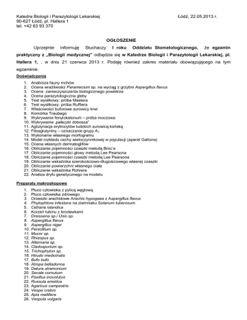 Katedra Biologii i Parazytologii Lekarskiej 90-627 Łódź, pl. Hallera 1 tel. +42 63 93 370 Łódź, 22.05.2013 r. OGŁOSZENIE Uprzejmie informuję Słuchaczy I roku Oddziału Stomatologicznego, że egzamin praktyczny z „Biologii medycznej” odbędzie się w Katedrze Biologii i Parazytologii Lekarskiej, pl. Hallera 1, , w dniu 21 czerwca 2013 r. Podaję również zakres materiału obowiązującego na tym egzaminie: Doświadczenia 1. 2. 3. 4. 5. 6. 7. 8. 9. 10. 11. 12. 13. 14. 15. 16. 17. 18. 19. 20. 21. 22. Anabioza fauny mchów Ocena wrażliwości Paramecium sp. na wyciąg z grzybni Aspergillus flavus Ocena zanieczyszczenia biologicznego powietrza Ocena parazytologiczna gleby Test wysiłkowy: próba Mastera Test wysiłkowy: próba Ruffiera Właściwości buforowe surowicy krwi Komórka Traubego Wykrywanie fenyloketonurii – próba moczowa Wykrywanie „pałeczki dobosza” Aglutynacja erytrocytów ludzkich surowicą końską Fitoaglutyniny – oznaczanie grupy A1 Wykonanie własnego morfogramu Model rozkładu cechy wieloczynnikowej w populacji (aparat Galtona) Ocena własnych dermatoglifów Obliczanie pojemności czaszki metodą Broc’a Obliczanie pojemności głowy metodą Lee Pearsona Obliczanie pojemności czaszki metodą Lee Pearsona Obliczanie wskaźnika szerokościowo-długościowego własnej czaszki Obliczanie powierzchni własnego ciała Obliczanie wskaźnika Rohrera Analiza dryfu genetycznego na modelu Preparaty makroskopowe 1. 2. 3. 4. 5. 6. 7. 8. 9. 10. 11. 12. 13. 14. 15. 16. 17. 18. 19. 20. 21. 22. 23. 24. 25. 26. Płuco człowieka z pylicą węglową Płuco człowieka zdrowego Orzeszki arachidowe Arachis hypogaea z Aspergillus flavus Phytophtora infestans na ziemniaku Solanum tuberosum Cetraria islandica Korzeń łubinu z brodawkami Dreissena sp.i Unio sp. Aspergillus flavus Aspergillus niger Penicillium sp. Mucor sp. Rhizopus sp. Alternaria sp. Cladosporium sp. Trichophyton sp. Hirudo medicinalis Bufo bufo Atropa belladonna Datura stramonium Secale cornutum Paxillus inovolutus Russula emetica Agaricus campestris Vespa crabro Apis mellifera Vespula vulgaris Preparaty mikroskopowe 1. 2. 3. 4. 5. 6. 7. 8. 9. 10. 11. 12. 13. Streptomyces sp. Trichuris trichiura - jaja Płuco człowieka z pylicą węglową Cetraria islandica Żądło pszczoły Żądło osy Pyłek Lilium sp. Mutanty Drosophila sp. Perforacja włosa w teście przynęty włosowej Entomophtora muscae na skrzydle muchy Allium sp. – podziały mitotyczne w stożku wzrostu korzenia Chromosomy metafazowe człowieka Chromosomy politeniczne Drosophila sp. Zagadnienia praktyczne – obowiązuje znajomość podstaw teoretycznych zjawisk/zagadnień lub doświadczeń oraz znajomość ich znaczenia praktycznego i możliwości oceny. 1. Anabioza 2. Mikotoksyny 3. Antybioza 4. Mutualizm 5. Fitoncydy 6. Metody oceny wpływu czynnika abiotycznego na populację 7. Ocena parazytologiczna gleby 8. Wymagania mikrobiologiczne dotyczące jakości wody przeznaczonej do spożycia 9. Zanieczyszczenia aerosfery 10. Organizm jako układ regulacji 11. Testy wysiłkowe 12. Utrzymanie stałości pH krwi człowieka 13. Komórka Traubego 14. Fenyloketonuria 15. Alkaptonuria 16. Analiza rodowodów 17. Układ grupowy ABO i Rh 18. Wykrywanie antygenu D na erytrocytach 19. Wykrywanie wydzielania substancji grupowych układu ABO 20. Fitoaglutyniny erytrocytów ludzkich 21. Zaburzenia w prawidłowym widzeniu barw 22. Chromatyna płciowa żeńska 23. Chromatyna płciowa męska 24. Morfogram 25. Dziedziczenie zdolności umysłowych 26. Powierzchnia ciała człowieka 27. Pojemność czaszki/głowy człowieka 28. Wskaźnik szerokościowo-długościowy głowy 29. Wskaźnik Rohrera 30. Dermatoglify 31. Dryf genetyczny Adiunkt Zakładu Biologii i Parazytologii Lekarskiej UM Dr n. med. Anna Wójcik