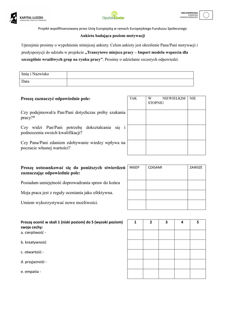 Projekt współfinansowany przez Unię Europejską w ramach Europejskiego Funduszu Społecznego Ankieta badająca poziom motywacji Uprzejmie prosimy o wypełnienie niniejszej ankiety. Celem ankiety jest określenie Pana/Pani motywacji i predyspozycji do udziału w projekcie „Tranzytowe miejsca pracy – Import modelu wsparcia dla szczególnie wrażliwych grup na rynku pracy”. Prosimy o udzielanie szczerych odpowiedzi. Imię i Nazwisko Data Proszę zaznaczyć odpowiednie pole: TAK W NIEWIELKIM STOPNIU NIE CZASAMI ZAWSZE Czy podejmował/a Pan/Pani dotychczas próby szukania pracy?* Czy widzi Pan/Pani potrzebę dokształcania się i podnoszenia swoich kwalifikacji? Czy Pana/Pani zdaniem zdobywanie wiedzy wpływa na poczucie własnej wartości? Proszę ustosunkować się do poniższych stwierdzeń NIGDY zaznaczając odpowiednie pole: Posiadam umiejętność doprowadzania spraw do końca Moja praca jest z reguły oceniania jako efektywna. Umiem wykorzystywać nowe możliwości. Proszę ocenić w skali 1 (niski poziom) do 5 (wysoki poziom) swoje cechy: a. cierpliwość b. kreatywność c. otwartość d. przyjazność e. empatia - 1 2 3 4 5 Projekt współfinansowany przez Unię Europejską w ramach Europejskiego Funduszu Społecznego Proszę wstawić „X” w kratce ze stwierdzeniem, które najbardziej Pana/ią charakteryzuje lider społeczny (autorytet lokalny) osoba komunikatywna umiejętność poruszania się w lokalnych sieciach organizacji i instytucji osoba potrafiąca występować publicznie i zawierać głos w debacie społecznej motor wszelkich inicjatyw i źródło pomysłów osoba rozpoznawalna Czy posiada Pan/i prawo jazdy Kat. B TAK NIE Czy posiada Pan/i umiejętność obsługi komputera? Jeśli tak to w jakim stopniu? TAK NIE Podstawowym zaawansowanym średniozaawansowanym Proszę krótko opisać dlaczego chce Pan/Pani podjąć zatrudnienie w charakterze Animatora osób starszych? ………………………………………………………………………………………………………………… ………………………………………………………………………………………………………………… ………………………………………………………………………………………………………………… ………………………………………………………………………………………………………………… ………………………………………………………………………………………………………………… ………………………………………………………………………………………………………………… ………………………………………………………………………………………………………………… ………………………………………………………………………………………………………………… ………………………………………………………………………………………………………………… ………………………………………………………………………………………………………………… ………………………………………………………………………………………………………………… ………………………………………………………………………………………………………………… ………………………………………………………………………………………………………………… ………………………………………………………………………………………………………………… ………………………………………………………………………………………………………………… ………………………………………………………………………………………………………………… ………………………………………………………………………………………………………………… ………………………………………………………………………………………………………………… ………………………………………………………………………………………………………………… ………………………………………………………………………………………………………………… ………………………………………………………………………………………………………………… ………………………………………………………………………………………………………………… ………………………………………………………………………………………………………………… Projekt współfinansowany przez Unię Europejską w ramach Europejskiego Funduszu Społecznego Jakich korzyści oczekuje Pan/Pani po przystąpieniu do szkolenia? (proszę zaznaczyć 3 najbardziej znaczące pozycje): znalezienie zatrudnienia podniesienie kwalifikacji wzrost samooceny rozwijanie umiejętności społecznych (podejmowanie decyzji, stawianie celów, radzenie sobie ze stresem) zdobycie umiejętności zawodowych zwiększenie wiary w siebie zdobycie doświadczenia – szansa na realizację zainteresowań zwiększenie aktywności społecznej inne (jakie?)……………………………………………………………………………. Jakie są Pana/Pani oczekiwania związane z treścią i formą zajęć w ramach szkolenia „Akademia Animatora osób starszych” ………………………………………………………………………………………………………………… ………………………………………………………………………………………………………………… ……………………………