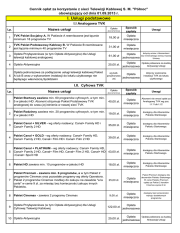 Cennik opłat za korzystanie z sieci Telewizji Kablowej S. M. "Północ" obowiązujący od dnia 01.09.2013 r. I. Usługi podstawowe I.I Analogowa TVK Opłata Nazwa usługi Lp. abonamentowa Sposób zapłaty Uwagi 1 TVK Pakiet Socjalny A. W Pakiecie A reemitowane jest łącznie minimum 18 programów TV 18,00 zł Opłata miesięczna 2 TVK Pakiet Podstawowy Kablowy B. W Pakiecie B reemitowane jest łącznie minimum 40 programów TV 31,00 zł Opłata miesięczna 3 Opłata Przyłączeniowa (w tym Opłata Aktywacyjna) dla Usługi telewizji kablowej analogowej 61,00 zł Opłata jednorazowa 4 Opłata Aktywacyjna 25,00 zł. Opłata Opłata pobierana za każdą Aktywację Usługi jednorazowa 5 Opłata jednorazowa za podłączenie usługi telewizji kablowej Pakiet A lub B wraz z wykonaniem instalacji do lokalu użytkowego nie będącego własnością Spółdzielni dotyczy umów z Abonentami bez minimalnego okresu trwania Umowy wg kalk. powykonawc zej Opłata jednorazowa dotyczy wykonania instalacji TVK do lokalu użytkowego Opłata Sposób zapłaty Uwagi I.II. Cyfrowa TVK Lp. Nazwa usługi 1 Pakiet Startowy zawiera min. 60 programów cyfrowych, w tym min. 5 w jakości HD. Abonent otrzymuje Pakiet Podstawowy TVK analogowej do czasu jej istnienia w naszej sieci TVK 40,00 zł. Opłata miesięczna Abonent nie wnosi opłat za Analogową TVK wg poz. I.I.1 lub I.I.2 2 Pakiet Rodzinny zawiera min. 20 programów cyfrowych, w tym min. 2 w jakości HD 19,00 zł. Opłata miesięczna dostępny dla Abonentów Pakietu Startowego 3 Pakiet Canal + SILVER - wg oferty nadawcy: Canal+ Family HD i Canal+ Family 2 HD 35,00 zł. Opłata miesięczna dostępny dla Abonentów Pakietu Startowego. 4 Pakiet Canal + GOLD - wg oferty nadawcy: Canal+ Family HD, Canal+ Family 2 HD, Canal+ Film HD i Canal+ Film 2 HD 39,00 zł. Opłata miesięczna dostępny dla Abonentów Pakietu Startowego 5 Pakiet Canal + PLATINUM - wg oferty nadawcy: Canal+ Family HD, Canal+ Family 2 HD, Canal+ Film HD, Canal+ Film 2 HD, Canal+ HD 43,00 zł. i Canal+ Sport HD Opłata miesięczna dostępny dla Abonentów Pakietu Startowego. 6 Pakiet HD zawiera min. 10 programów w jakości HD Opłata miesięczna dostępny dla Abonentów Pakietu Startowego 7 Pakiet Premium - zawiera min. 6 programów, a w tym Pakiet 2 programów Cinemax oraz pozostałe programy wg oferty Operatora. Pakiet 2 programów Cinemax możliwy do zakupu na zasadzie "a la carte" w cenie 9 zł. za miesiąc bez konieczności zakupu innych Pakietów. 25,00 zł. Opłata miesięczna Pakiet Premium dostępny dla abonentów Pakietu Startowego. W cenie Pakietu Premium opłata za Pakiet 2 kanałów Cinemax wynosi 9 zł. 8 Pakiet Cinemax - zawiera 2 programy Cinemax 9,00 zł. Opłata miesięczna dostepny bez konieczności wykupu dodatkowych programów 9 Opłata Przyłączeniowa (w tym Opłata Aktywacyjna) dla Usługi Cyfrowej Telewizji Kablowej 122,00 zł. Opłata jednorazowa 25,00 zł. Opłata Opłata pobierana za każdą Aktywację Usługi jednorazowa 10 Opłata Aktywacyjna abonamentowa 18,00 zł. II. Usługi dodatkowe TVK Nazwa usługi Lp. 1 Opłata jednorazowa za podłączenie dodatkowego (-ych) gniazda TVK w mieszkaniu 2 Opłata jednorazowa za przeniesienie usługi TVK do innego lokalu mieszkalnego (polega na odłączeniu sygnału w dotychczasowym mieszkaniu i aktywacji Opłata brutto Sposób zapłaty Uwagi wg kalkulacji powykon. Opłata jednorazowa Opłata za każdą zleconą uslugę 16,00 zł Opłata jednorazowa Opłata za każdą zleconą uslugę usługi w nowym mieszkaniu, nie obejmuje wykonania instalacji) 3 Opłata jednorazowa za dodatkowe zlecone prace na sieci TVK Opłata za zmianę pakietu TVK analogowej: 4 4.1 - Pakiet A na Pakiet B 10,00 zł 4.2 - Pakiet B na Pakiet A 10,00 zł Opłata za zmianę pakietu TVK cyfrowej: 5 Opłata Opłata za każdą zleconą uslugę jednorazowa Opłata za każdą zmianę pakietu wg kalk. Powykon. Opłata jednorazowa Opłata za każdą zmianę pakietu(-ów) dokonywaną w jednym czasie 5.1 - dodanie kolejnego Pakietu cyfrowego, zamiana Pakietów 10,00 zł 5.2 - zmniejszenie ilości Pakietów cyfrowych 10,00 zł 6 Miesięczna opłata za użytkowanie sprzętu ( dekoder STB lub moduł CI ) 10,00 zł 7 Opłata jednorazowa za bezpodstawne wezwanie konserwatora 20,00 zł. 9 Cena za moduł CI Conax 110,00 zł. Opłata jednorazowa lub w ratach Sprzęt objęty 24 miesięczną gwarancją 10 Cena za Set Top Box HD oferowany przez Operatora (TechniStar K1, Opticum HD X2 lub sprzęt podobnej klasy) 420,00 zł. Opłata jednorazowa lub w ratach Sprzęt objęty 24 miesięczną gwarancją 900 zł. Opłata jednorazowa lub w ratach Sprzęt objęty 24 miesięczną gwarancją 122,00 zł. Opłata jednorazowa 11 Cena za STB Technisat DigiCorder HD K2, 500GB 12 Opłata za nie zwrócenie, zagubienie lub zniszczenie karty dostepowej Conax. Opłata jednorazowa Opłata miesięczna Opłata Opłata za każde wezwanie jednorazowa Wszystki powyższe ceny podane są w kwotach brutto (z podatkiem VAT). Cennik zatwierdzono Uchwałą Zarządu S. M. "Północ" nr 73 / 2013 z dnia 28.08.2013r.