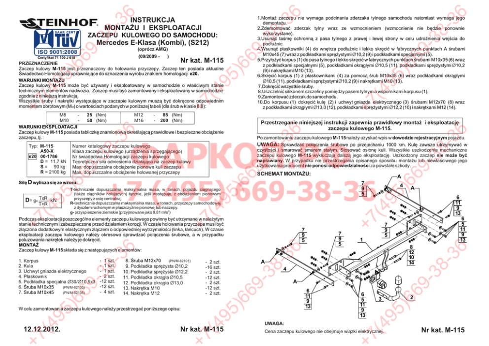66 95 (4 +7 +7 M8 25 (Nm) M12 85 (Nm) M10 50 (Nm) M16 - 200 (Nm) WARUNKI EKSPLOATACJI Zaczep kulowy M-115 posiada tabliczkê znamionow¹ okreœlaj¹c¹ prawid³owe i bezpieczne obci¹¿enie zaczepu, tj. : 36 69 )6 95 6 11 9 13 8 12 10 14 6 11 9 13 6 5 11 9 13 66 A 2 3 5) 66 UWAGA: 9- 4 9- 38 A 1 -3 6 7 9 5 6 5 11 9 13 7 9 5 Cena zaczepu kulowego nie obejmuje wi¹zki elektrycznej. 7( 49 7( Nr kat. M-115 A 38 -3 6 7 9 5 5) - 2 szt. -16 szt. - 2 szt. -12 szt. - 2 szt. -12 szt. - 2 szt. +7 +7 -3 8. Œruba M12x70 (PN/M-82101) 9. Podk³adka sprê¿ysta Ø10,2 10. Podk³adka sprê¿ysta Ø12,2 11. Podk³adka okr¹g³a Ø10,5 12. Podk³adka okr¹g³a Ø13,0 13. Nakrêtka M10 14. Nakrêtka M12 4 (4 (4 95 7 9 5 6 5) 66 9- 38 - 1 szt. - 1 szt. - 1 szt. - 2 szt. -12 szt. -12 szt. - 4 szt. W celu zamontowania zaczepu kulowego nale¿y przestrzegaæ poni¿szego opisu: 49 A )6 )6 1. Korpus 2. Kula 3. Uchwyt gniazda elektrycznego 4. P³askownik 5. Podk³adka specjalna Ø30/Ø10,5x3 6. Œruba M10x35 (PN/M-82105) 7. Œruba M10x45 (PN/M-82105) 7( -3 -3 69 SCHEMAT MONTA¯U: Podczas eksploatacji poszczególne elementy zaczepu kulowego powinny byæ utrzymane w nale¿ytym stanie technicznym i zabezpieczone przed dzia³aniem korozji. W czasie holowania przyczepa musi byæ z³¹czona dodatkowym elastycznym z³¹czem o odpowiedniej wytrzyma³oœci (linka, ³añcuch). W czasie eksploatacji zaczepu kulowego nale¿y okresowo sprawdzaæ po³¹czenia œrubowe, a w przypadku poluzowania nakrêtek nale¿y je dokrêciæ. MONTA¯ Zaczep kulowy M-115 sk³ada siê z nastêpuj¹cych elementów: 12.12.2012. 8- 8- 69 -3 8- czystoœci i smarowaæ smarem sta³ym. Stosowaæ os³onê kuli. Wszystkie uszkodzenia mechaniczne zaczepu kulowego M-115 wykluczaj¹ dalsz¹ jego eksploatacjê. Uszkodzony zaczep nie mo¿e byæ naprawiany. W przypadku nie przestrzegania opisanego sposobu monta¿u lub niew³aœciwego jego u¿ytkowania producent nie ponosi odpowiedzialnoœci za powsta³e szkody. T-technicznie dopuszczalna maksymalna masa, w tonach, pojazdu ci¹gn¹cego (tak¿e ci¹gników holuj¹cych) ³¹cznie, jeœli wystêpuje, z obci¹¿eniem pionowym przyczepy z osiê centraln¹. R-technicznie dopuszczalna maksymalna masa, w tonach, przyczepy samochodowej z dyszlem ruchomym w p³aszczyŸnie pionowej lub naczepy. g- przyspieszenie ziemskie (przyjmowane jako 9,81 m/s2) +7 (4 95 T+R Po zamontowaniu zaczepu kulowego M-115 nale¿y uzyskaæ wpis w dowodzie rejestracyjnym pojazdu. UWAGA: Sprawdzaæ po³¹czenia œrubowe po przejechaniu 1000 km. Kulê zawsze utrzymywaæ w Numer katalogowy zaczepu kulowego Klasa zaczepu kulowego (urz¹dzenia sprzêgaj¹cego) Nr œwiadectwa Homologacji zaczepu kulowego Teoretyczna si³a odniesienia dzia³aj¹ca na zaczep kulowy Max. dopuszczalne obci¹¿enie pionowe kuli zaczepu Max. dopuszczalne obci¹¿enie holowanej przyczepy Si³ê D wylicza siê ze wzoru: D= gx TxR kN 36 36 Przestrzeganie niniejszej instrukcji zapewnia prawid³owy monta¿ i eksploatacjê zaczepu kulowego M-115. 49 +7 (4 (4 9 95 5) )6 (09/2009 - ®) Certyfikat 71 100 J 618 Nr kat. M-115 PRZEZNACZENIE Zaczep kulowy M-115 jest przeznaczony do holowania przyczepy. Zaczep ten posiada aktualne Œwiadectwo Homologacji uprawniaj¹ce do oznaczenia wyrobu znakiem homologacji e20. WARUNKI MONTA¯U Zaczep kulowy M-115 mo¿e byæ u¿ywany i eksploatowany w samochodzie o w³aœciwym stanie technicznym elementów nadwozia. Zaczep musi byæ zamontowany i eksploatowany w samochodzie zgodnie z niniejsz¹ instrukcj¹. Wszystkie œruby i nakrêtki wystêpuj¹ce w zaczepie kulowym musz¹ byæ dokrêcone odpowiednim momentem obrotowym (Mo) o wartoœciach podanych w poni¿szej tabeli (dla œrub w klasie 8.8): 69 -3 (oprócz AMG) )6 Mercedes E-Klasa (Kombi), (S212) Typ: M-115 A50-X e20 00-1786 D = 11,7 kN S = 90 kg R = 2100 kg 1.Monta¿ zaczepu nie wymaga podcinania zderzaka tylnego samochodu natomiast wymaga jego demonta¿u. 2.Zdemontowaæ zderzak tylny wraz ze wzmocnieniem (wzmocnienie nie bêdzie ponownie wykorzystane). 3.Usun¹æ taœmê ochronn¹ z pasa tylnego z prawej i lewej strony w celu udro¿nienia wejœcia do pod³u¿nic. 4.Wsun¹æ p³askowniki (4) do wnêtrza pod³u¿nic i lekko skrêciæ w fabrycznych punktach A œrubami M10x45 (7) wraz z podk³adkami sprê¿ystymi Ø10,2 (9) i podk³adkami specjalnymi (5). 5.Przy³o¿yæ korpus (1) do pasa tylnego i lekko skrêciæ w fabrycznych punktach œrubami M10x35 (6) wraz z podk³adkami specjalnymi (5), podk³adkami okr¹g³ymi Ø10,5 (11), podk³adkami sprê¿ystymi Ø10,2 (9) i nakrêtkami M10 (13). 6.Skrêciæ korpus (1) z p³askownikami (4) za pomoc¹ œrub M10x35 (6) wraz podk³adkami okr¹g³ymi Ø10,5 (11), podk³adkami sprê¿ystymi Ø10,2 (9) i nakrêtkami M10 (13). 7.Dokrêciæ wszystkie œruby. 8.Uszczelniæ silikonem szczeliny pomiêdzy pasem tylnym a wspornikami korpusu (1). 9.Zamontowaæ zderzak do samochodu. 10.Do korpusu (1) dokrêciæ kulê (2) i uchwyt gniazda elektrycznego (3) œrubami M12x70 (8) wraz z podk³adkami okr¹g³ymi Ø13,0 (12), podk³adkami sprê¿ystymi Ø12,2 (10) i nakrêtkami M12 (14). 93 ZACZEPU KULOWEGO DO SAMOCHODU: 836 836 69 -3 836 INSTRUKCJA MONTA¯U I EKSPLOATACJI Nr kat. M-115 (09/2009 - ®) 5) 95 Obeying this instruction assures correct montage and the M-115 tow bar operating. After assembling of the tow bar M-115 you have to get entry in cars registration book. 85 (Nm) 200 (Nm) CAUTION : Check if all bolts and nuts are correctly tightened after 1000km. Keep tow ball clean, grease and cased. All mechanical damages of tow bar excludes its further exploitation . Damaged ball hook cannot be repaired. In case of braking the rules of montage or unproper usage manufacturer do not take responsibility for arised damages . 7( Cat. No. M-115 -3 38 -3 6 8 12 10 14 6 11 9 13 9- 38 9- A 6 5 11 9 13 2 3 5) 49 Please follow the installation fitting instruction below in order to ensure correct installation of the towbar: 49 1 6 5 11 9 13 4 66 - 2 pieces -16 pieces - 2 pieces -12 piec